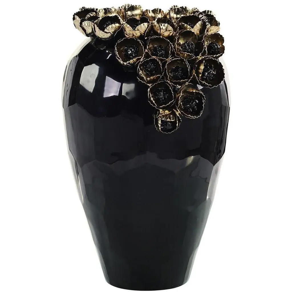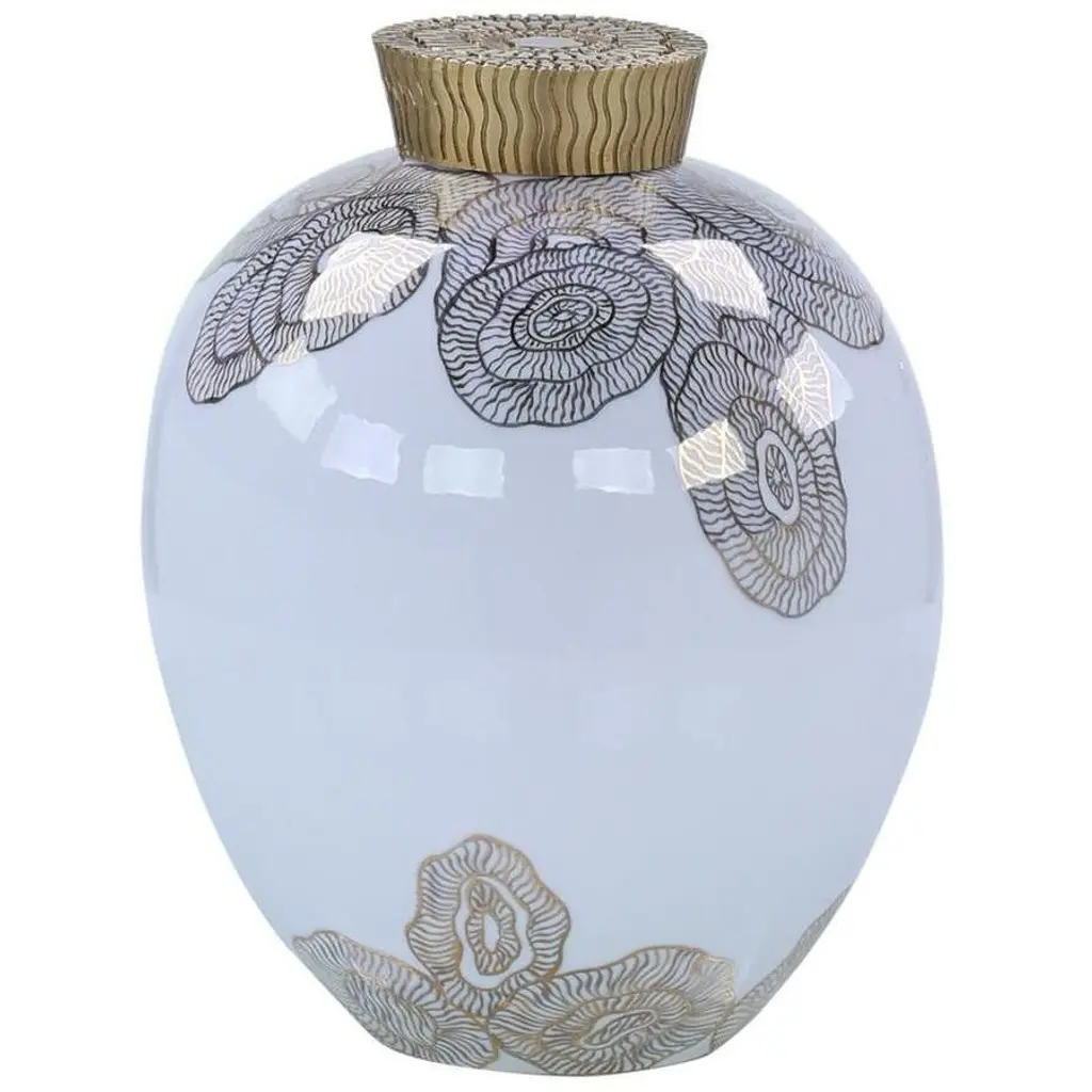 The Mithran Vase is an opulent decorative accent crafted from glazed porcelain. This stylish white vase is adorned in fired gold florals with intricate detailing, matched by a large brass lid etched with textural grooves in a wavy pattern.