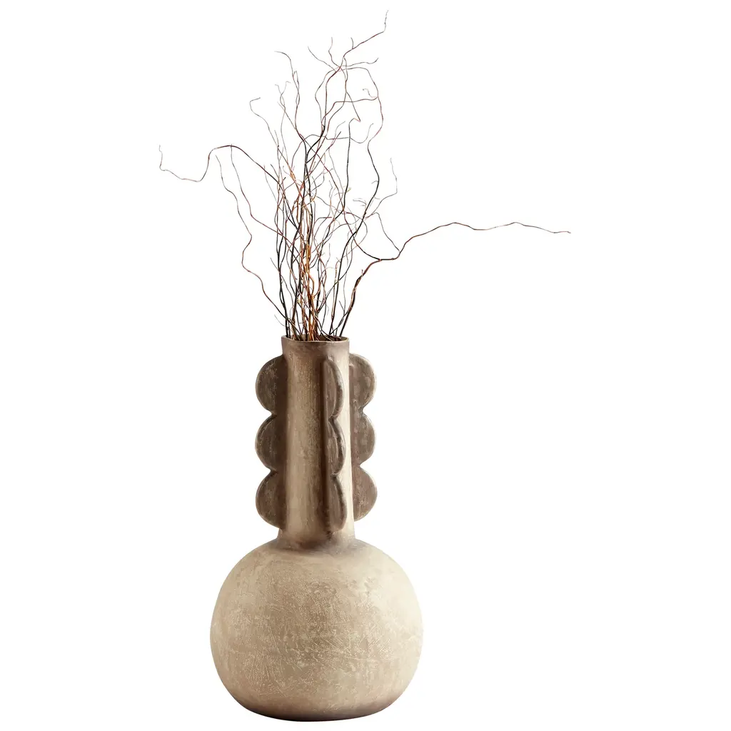 This artisan crafted cement vase collection features a rustic grey finish, with an abstract form influenced by ancient Native American pottery. A cylindrical design with a muted totem pole design, this collection is the perfect addition to any subdued organic ensemble, or boho-chic arrangement.