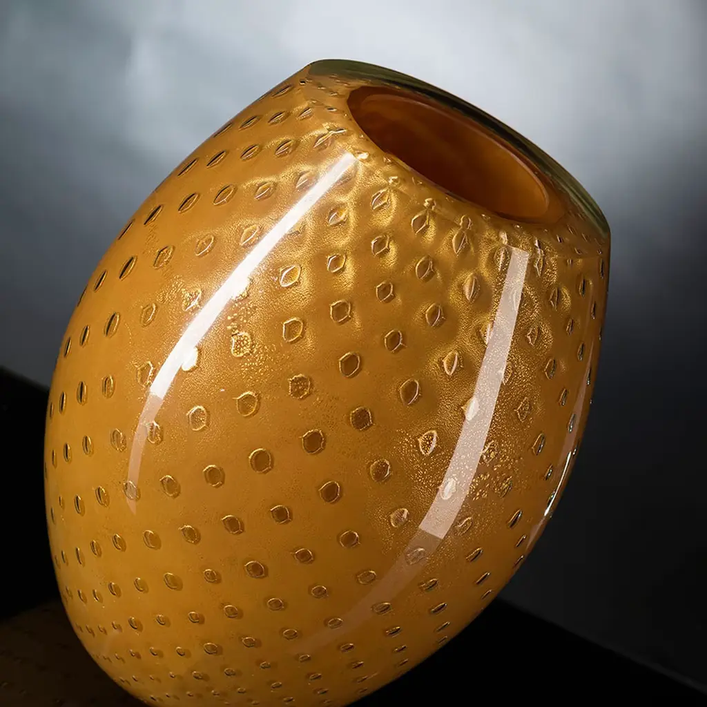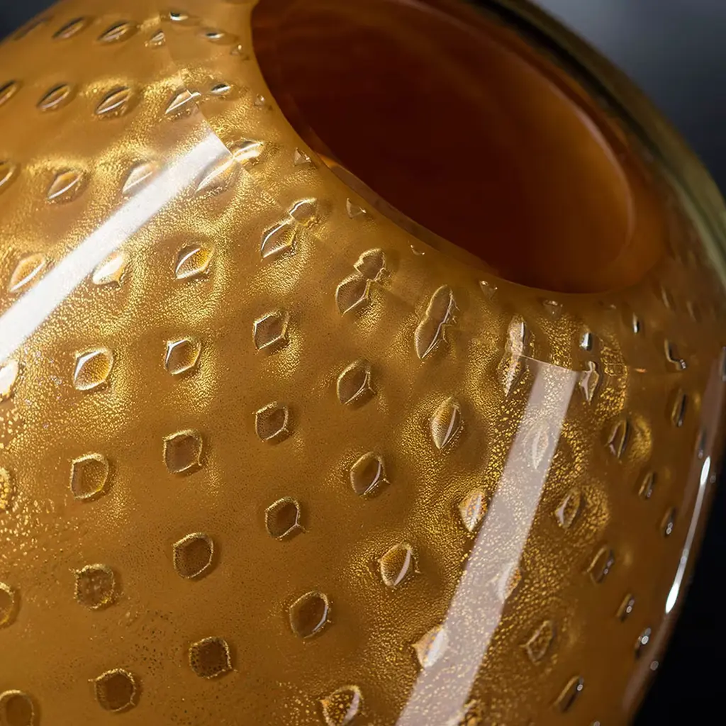 Ideal to bring a pop of color from classic to contemporary homes alike, this orange Murano glass vase is a craftsmanship gem mouthblown by master artisans. A motif of shimmering golden dots lends it a plush allure, emphasized by the glass' general thickness and glossy finish. Multiple color variants can be found in the Artemest catalog.