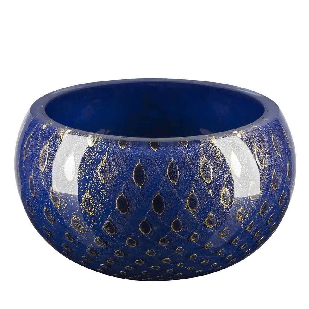 A splendid showcase of craftsmanship, this decorative vase is a singular piece deftly mouthblown of fine Murano glass, here pictured in blue and enriched by golden dots. A captivating glossy finish enhances its unique detailing and hues that characterize the thick and bulging body. Please consult the Artemest catalog for more colors and variants.