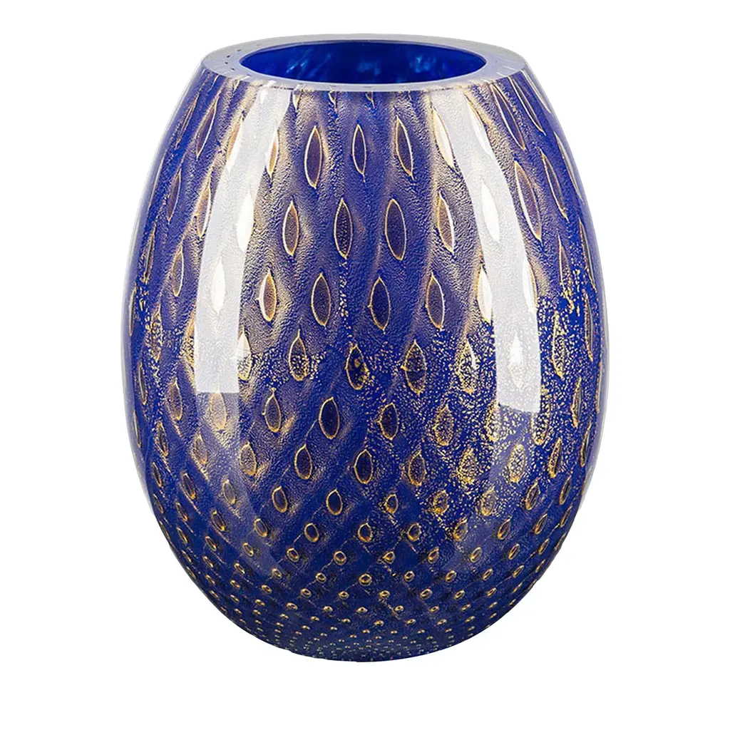 This one-of-a-kind vase, mouth-blown from gray Murano glass and adorned with a stunning diamond pattern of golden drops, will elevate any interior decor with its timeless elegance. Marked by a bulging shape and a characteristic glossy look, it is also available in different color versions that can be explored by browsing the Artemest catalog.