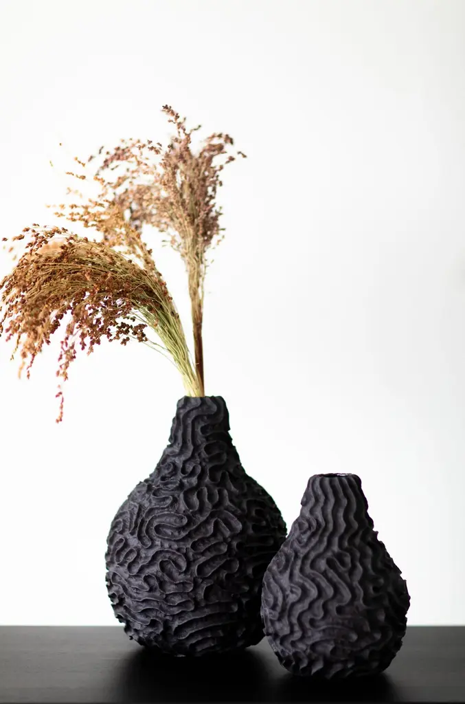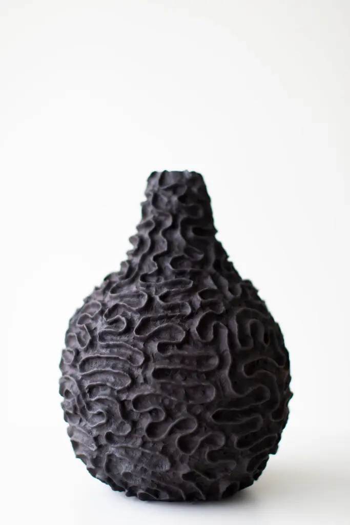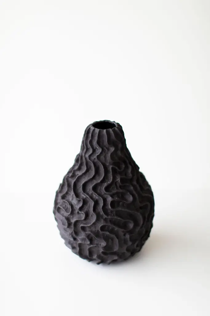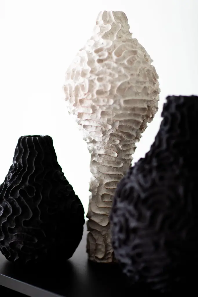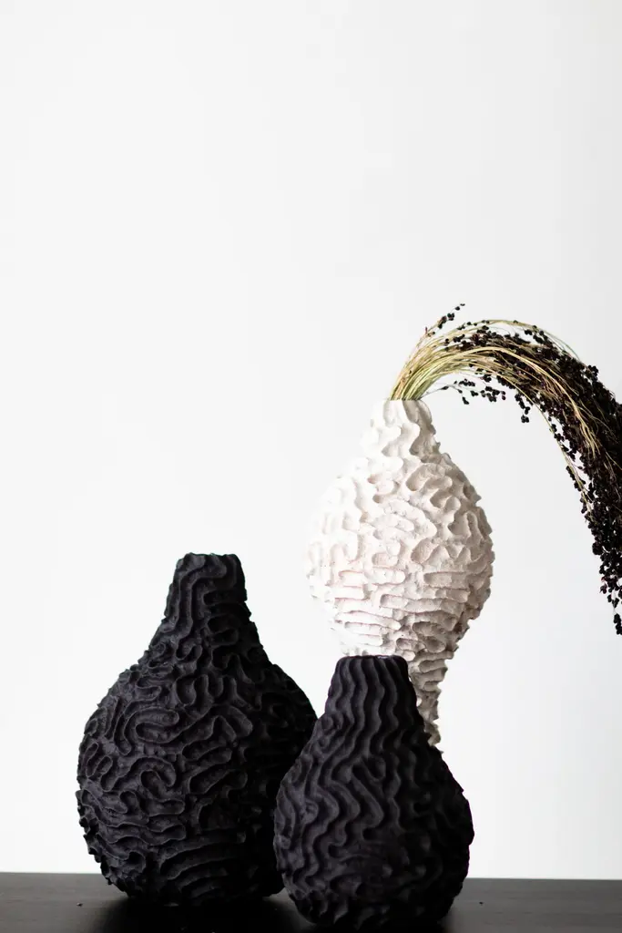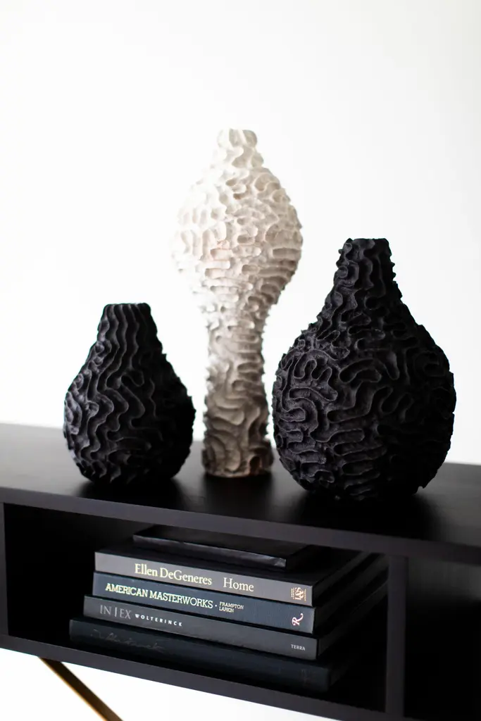 Designer: Suzy GoodelmanDistributor: Craft Associates FurniturePeriod/model: NewSpecs: ClayDimensions:White vaseH 17" (43.18 cm)W 6.5" (16.51 cm)D 6.5" (16.51 cm)Large black vaseH 11.75" (29.85 cm)W 8.5" (21.59 cm)D 8.5" (21.59 cm)Small black vaseH 8.5" (43.18 cm)W 6.5" (16.51 cm)D 6.5" (16.51 cm)These modern white and black vases by Suzy Goodelman for Craft Associates Furniture are expertly hand built and crafted in NYC. This pottery line is exclusive to Craft Associates Furniture. All of these pieces are hand built and one of a kind. No two are ever exactly the same. Suzy primarily uses coiling and pinching for her pottery. These hand building techniques allow her to create the forms and textures she desires, and they naturally leave traces of finger marks over the entire surface. These finger marks become another element in the texture.Craft Associates Furniture is proud each modern piece is made in the US. We strive to craft a product and work with people who make product that will stand the test of time. We stand 100% behind our product."I love that clay is ancient. I love that it comes from the ground and that all the materials I use were once in the earth. I love that the ceramic process uses the four alchemical elements, earth, air, fire and water, and is literally transformational. I love that it teaches me over and over to surrender my expectations and ideas of being in control.", Suzy GoodelmanHistory:Suzy Goodelman is a NYC native. She studied art and graphic design at Pratt Institute and School of Visual Arts, and then worked professionally as a graphic artist for many years, most notably with the Swedish design firm of Hall and Cederquist. This experience of Swedish design with its simple, clean lines and peaceful, empty space had a large influence on her aesthetic and artistic style. In 1999 she took up ceramics and found a creative expression that felt natural to her. In the course of her studies she discovered the world of Japanese and Korean pottery, and had an immediate and heartfelt response to the Asian ceramic aesthetic. She found that both the Swedish and Asian design sensibilities with their qualities of simplicity and serenity were, in her mind, quite compatible. These influences inform much of her work. Greenwich House pottery has been Suzy’s ceramics home, haven, and main place of education. Having grown up in Greenwich Village, she always knew of GHP and, after taking a rudimentary beginning hand building class at a place in her neighbourhood, knew it was time to go there. Suzy started taking classes at GHP in 2000 as a beginner and remains there to this day. After interning for a couple of years, she joined the staff in 2009, and in 2013 joined the faculty to start teaching. All throughout these teaching years she continued taking classes. It remains her studio to this day, and her staff position at GHP allows for 24 hour access to a beautifully equipped work space, a real luxury in Manhattan.