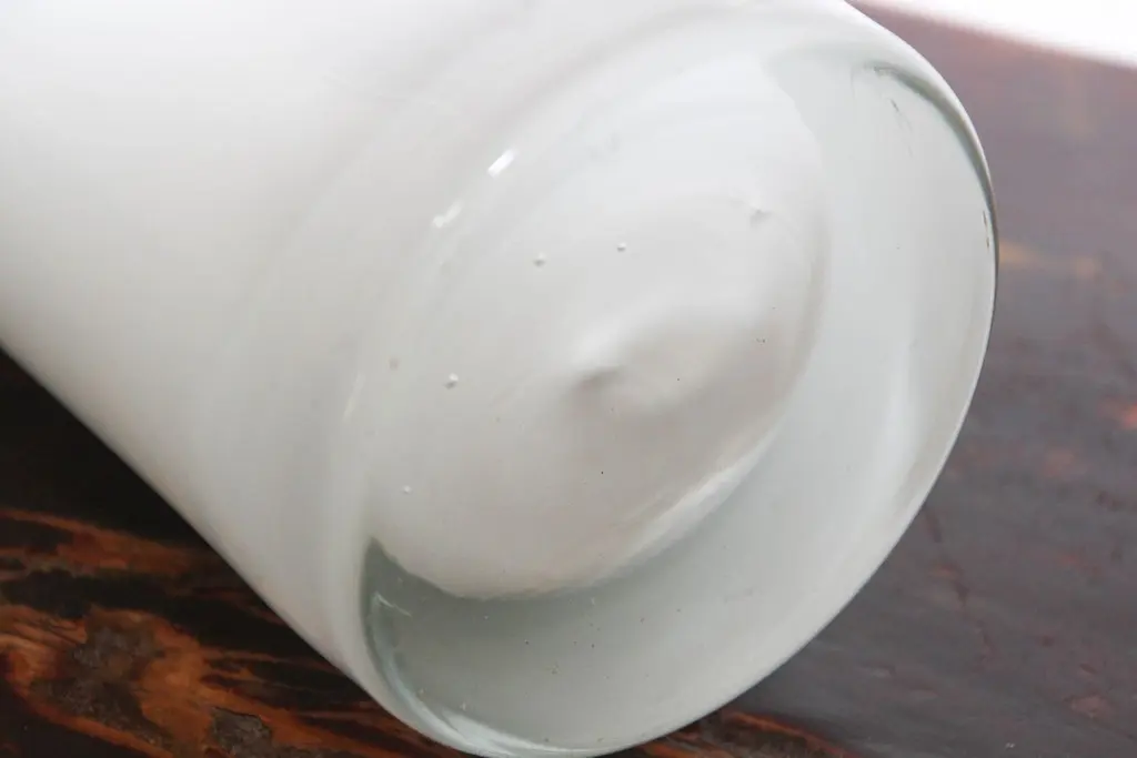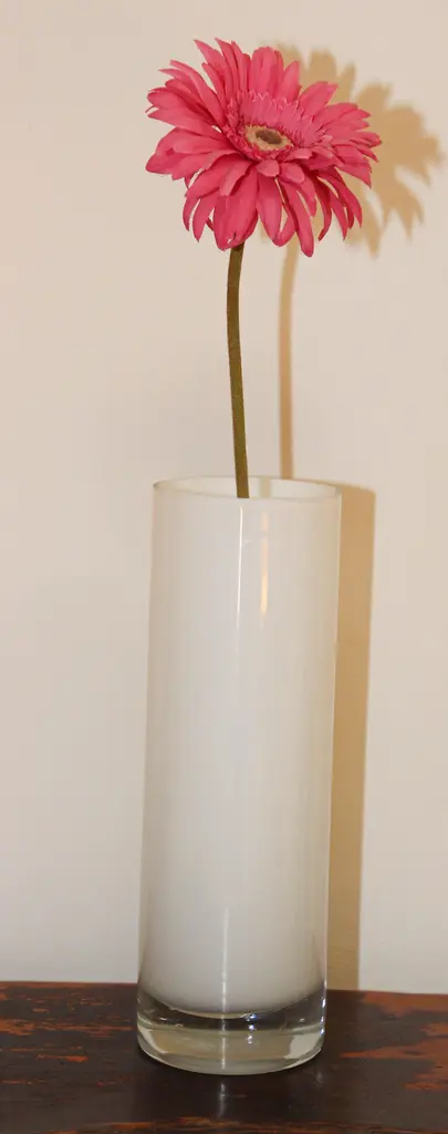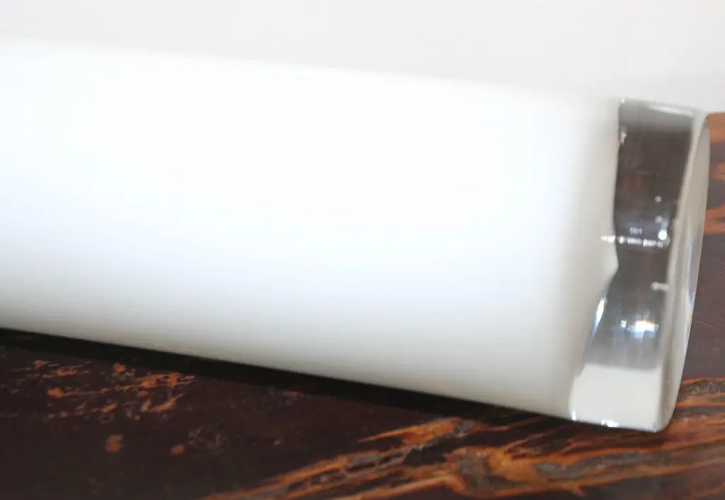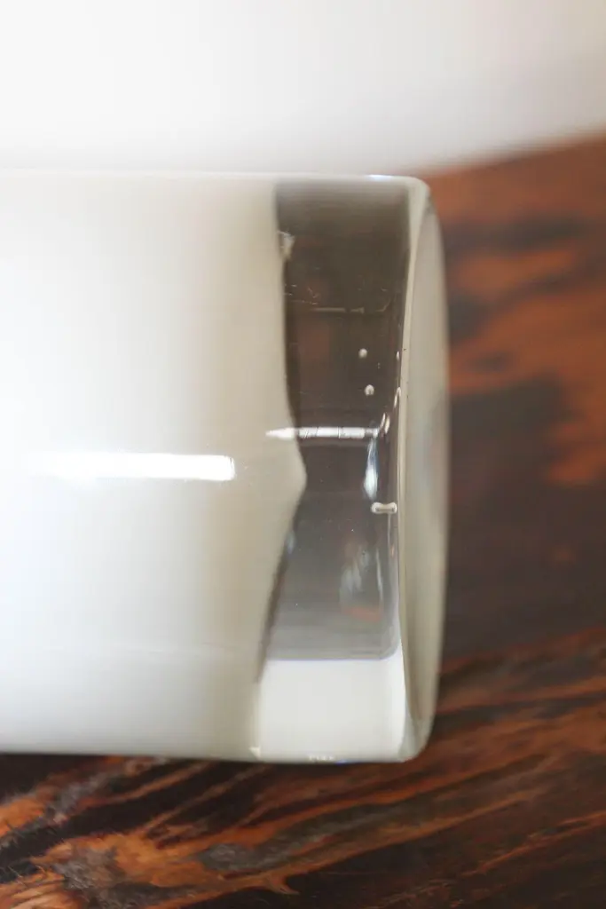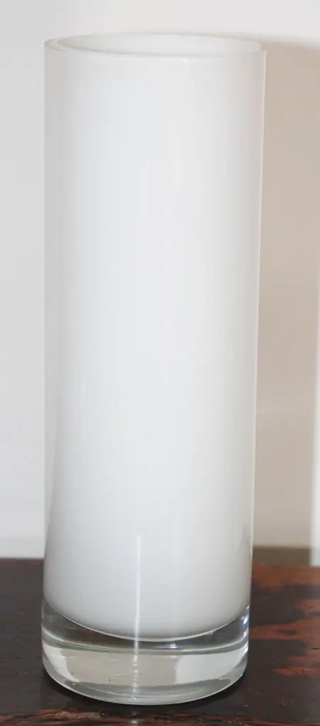 Modernist Minimalist white glass flower vase with clear glass base with some bubbles.This Minimalist white vase very modern shape will fit any design.With any flowers arrangement from colorful to just green leaves it will add the modern look to your home.Good condition, circa 1999.White and clear cast glass flower vase that feels casual and sophisticated at the same time.Dimensions: 12 in. H x 4in. D.hand blown glass showing some bubbles at the base.No Hallmark.