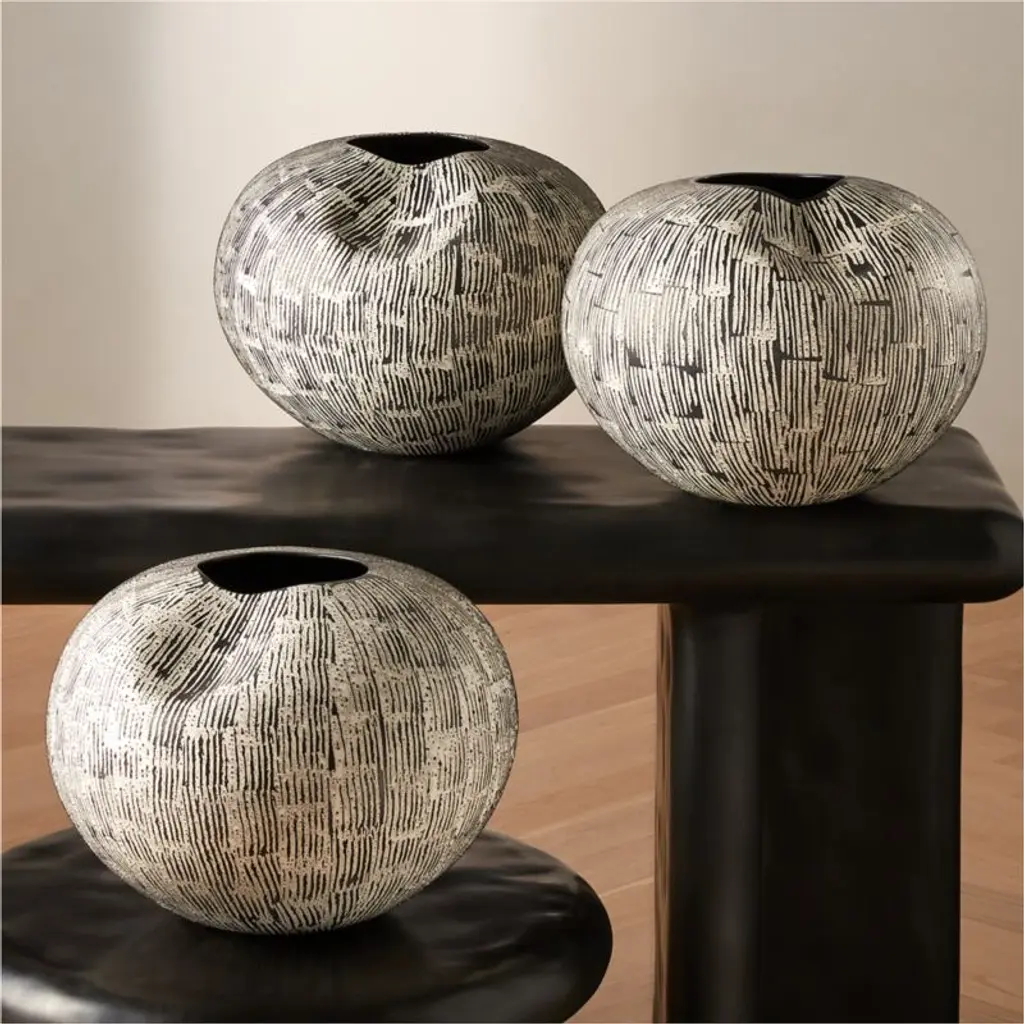 Full, round black and white ceramic vase is an ideal holder for large blooms. Crafted of liquid clay, each piece is decorated, glazed and finished by hand in Portugal. Due to this individualized craftsmanship, each piece will have slight variations that make it one-of-a-kind. CB2 exclusive.