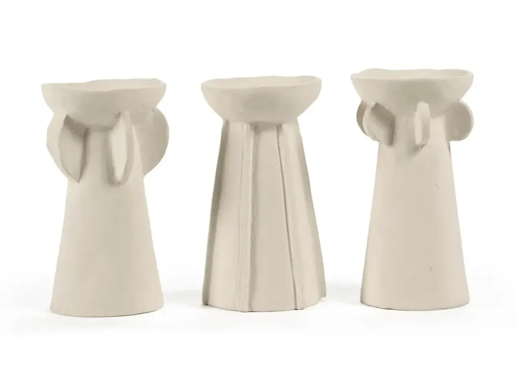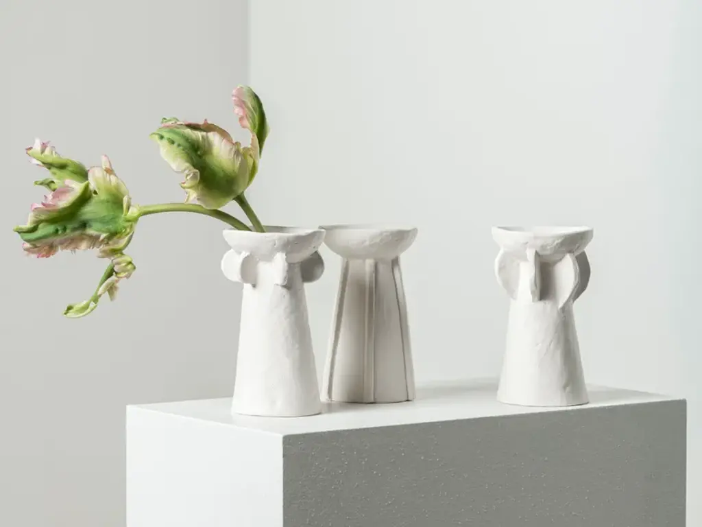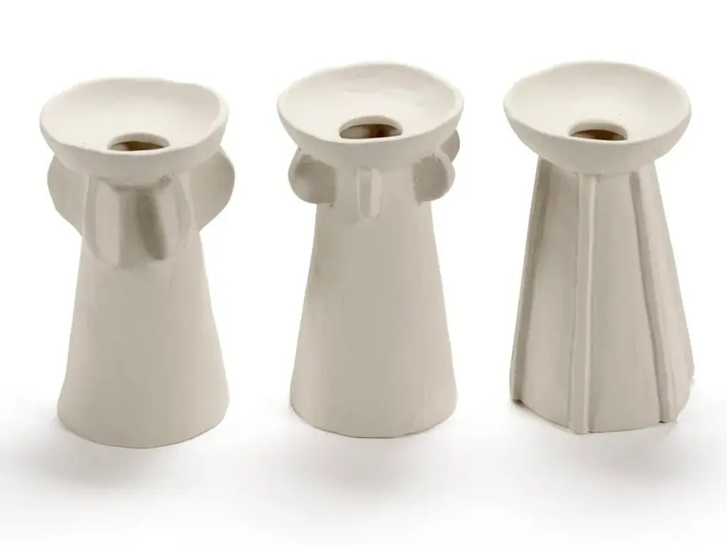 Molly ass/3 is a set of 3 vases made of stoenware.These playful white Molly vases are available in different models, allowing you to mix and match them. These interior objects are made of stone and have a matte finish on the outside, while they are glazed on the inside. This creates a striking graphic look in every room. Eclectic, a world full of wonderful extremes based on a well-thought-out structure. That is the first thing that comes to mind for the accessories collection of Marie Michielssen. Serax ’s resident designer likes variety, both in style and in her use of materials and colours. From papier-mâché through concrete to porcelain, cheerfully coloured or in muted natural colours, inspired by constructivism or by the earth in its most rudimentary form, each collection is completely different.