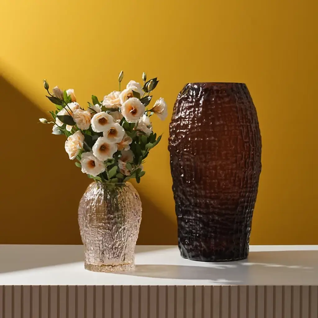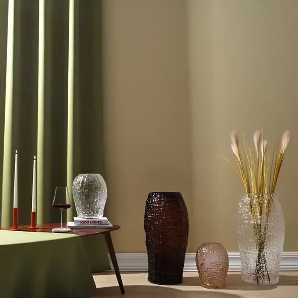 The Molten Vase from Nude showcases fluid, organic textures that mimic flowing lava across its orange-tinted crystal surface, creating dynamic movement through sculpted ridges. Designed by Edizalp Akin and crafted in Turkey from mouth-blown lead-free crystal, this piece originated from a handcrafted ceramic model that was 3D scanned to capture every nuanced detail. The innovative production process unites traditional glassmaking with modern technology, resulting in a textured form that harmonizes naturally with plant stems.