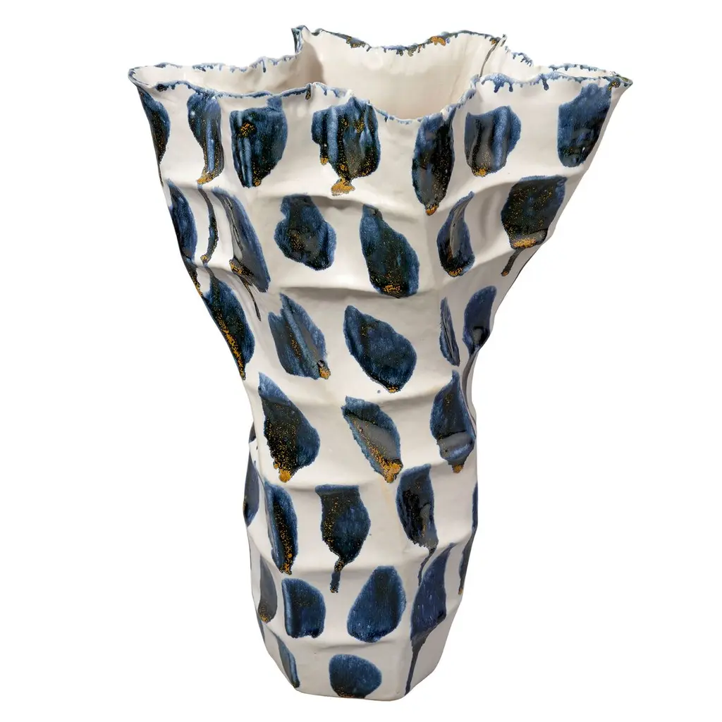 Artfully handcrafted from fine ceramic, these bright and cheerful vessels showcase bold splashes of reactive glaze. To enhance their organic shapes, the ruffled openings are rimmed in the same hue. The glazing technique reacts uniquely on each piece, ensuring that no two are completely identical.