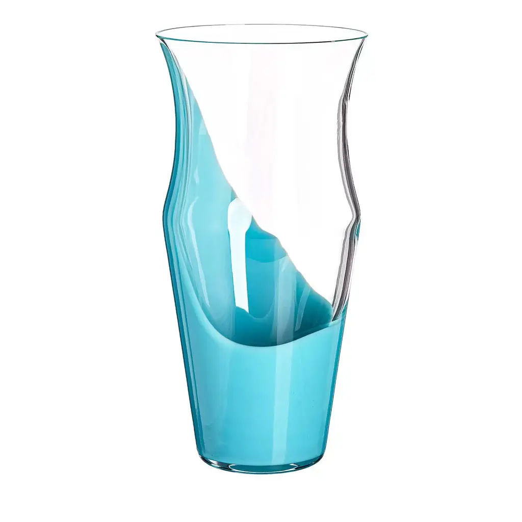 Merging traditional techniques of craftsmanship with a modern and innovative aesthetic in one unique objet d'art, this stunning vase will be an exclusive and original housewarming gift idea for a design aficionado. Handcrafted of mouth-blown Murano crystal, the natural transparency of this precious material is exquisitely juxtaposed to a pastel, light-blue hue in this stunning design.