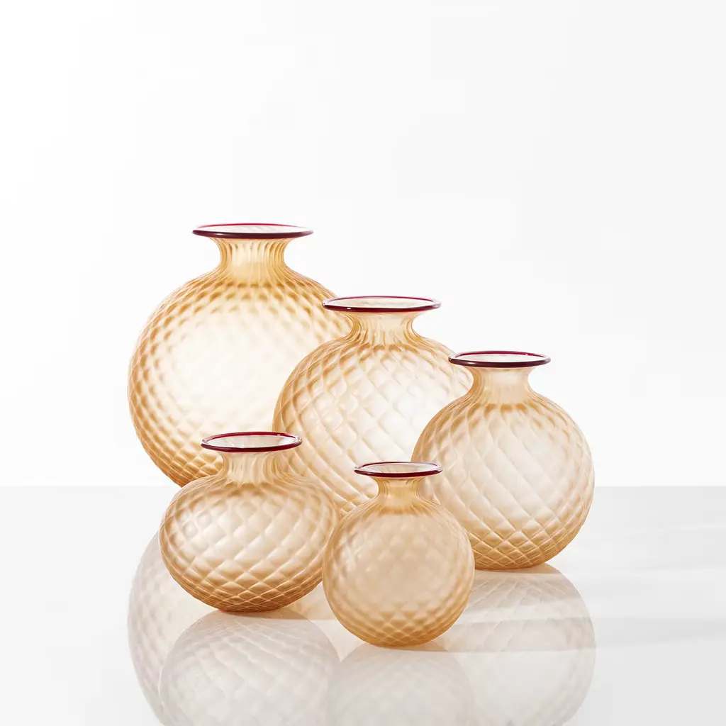 Distinguished by its frosted amber finish, this version of Venini’s Monofiore vase elevates the classic balloton texture with a soft, velvety appearance. The intricate quilted design catches the light subtly, while the frosted effect adds depth and elegance. The signature red rim offers a refined contrast, and the vase is hand-blown and finished with a colored glass thread applied while hot, reflecting Venini’s unparalleled craftsmanship and artistry.