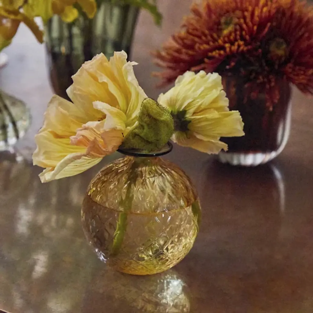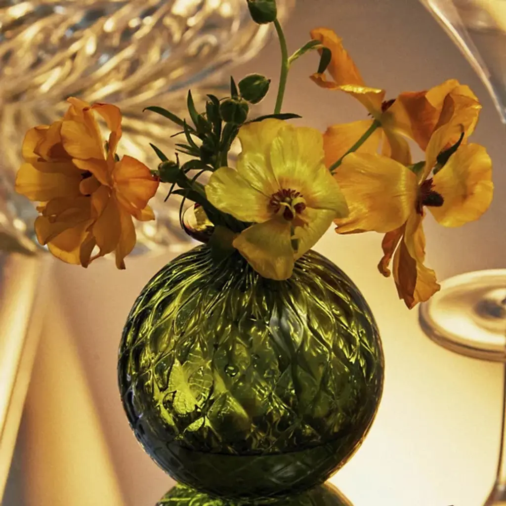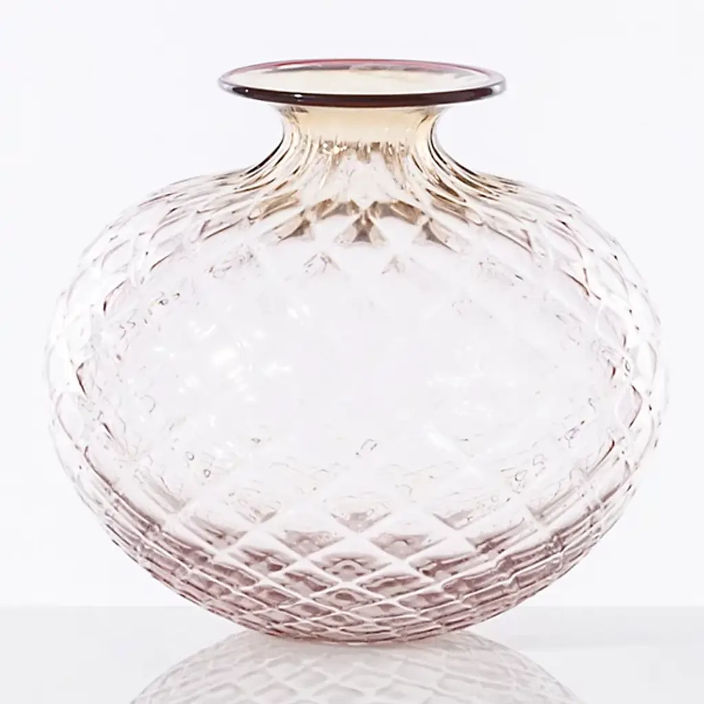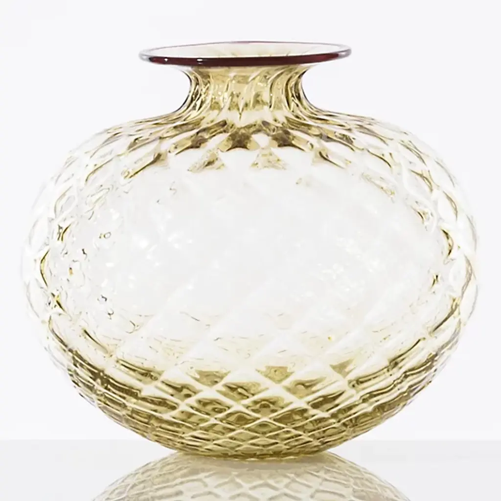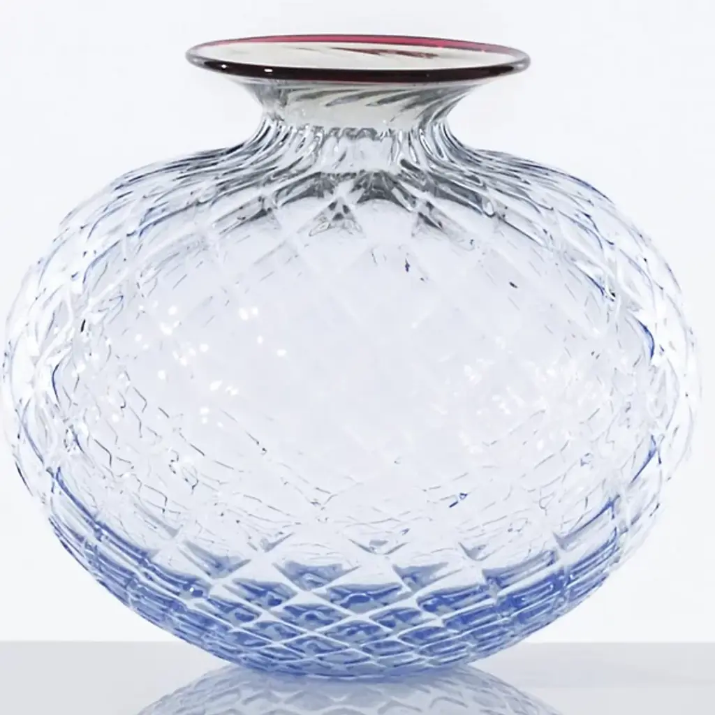 The Monofiore Balloton Vase from Venini employs a masterful quilted glass technique that plays tricks on the eye— appearing pillow-soft despite its solid form. This 1970 design captures the essence of Italian Murano glassmaking through its intricate Balloton pattern, created by skilled artisans who hand-blow and manipulate molten glass. A delicate colored thread winds its way around the piece while still hot, completing the distinctive pattern. Each vase, crafted in Italy, represents generations of craftsmanship where traditional methods meet artistic vision.