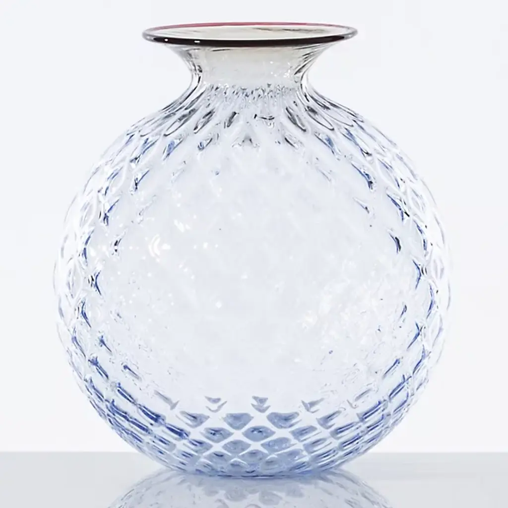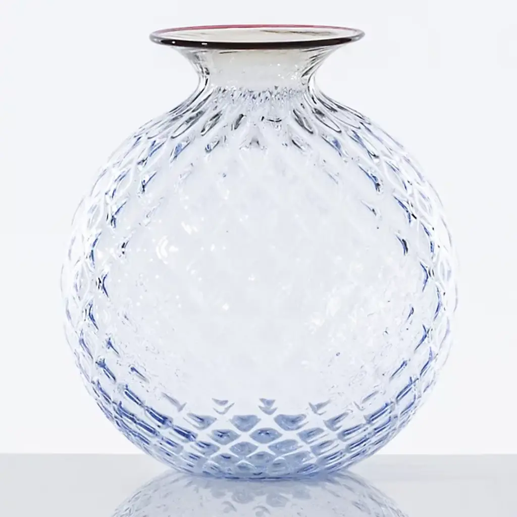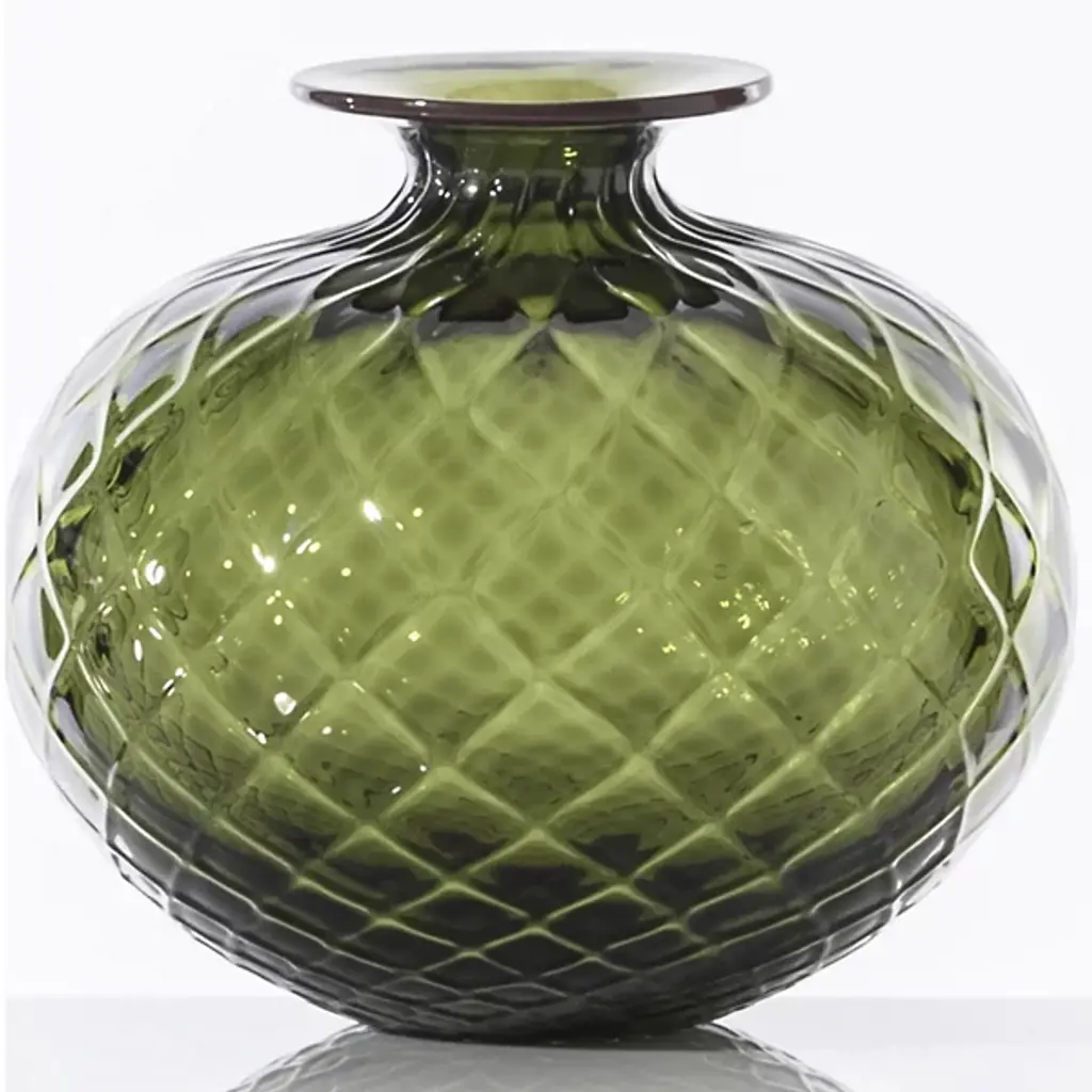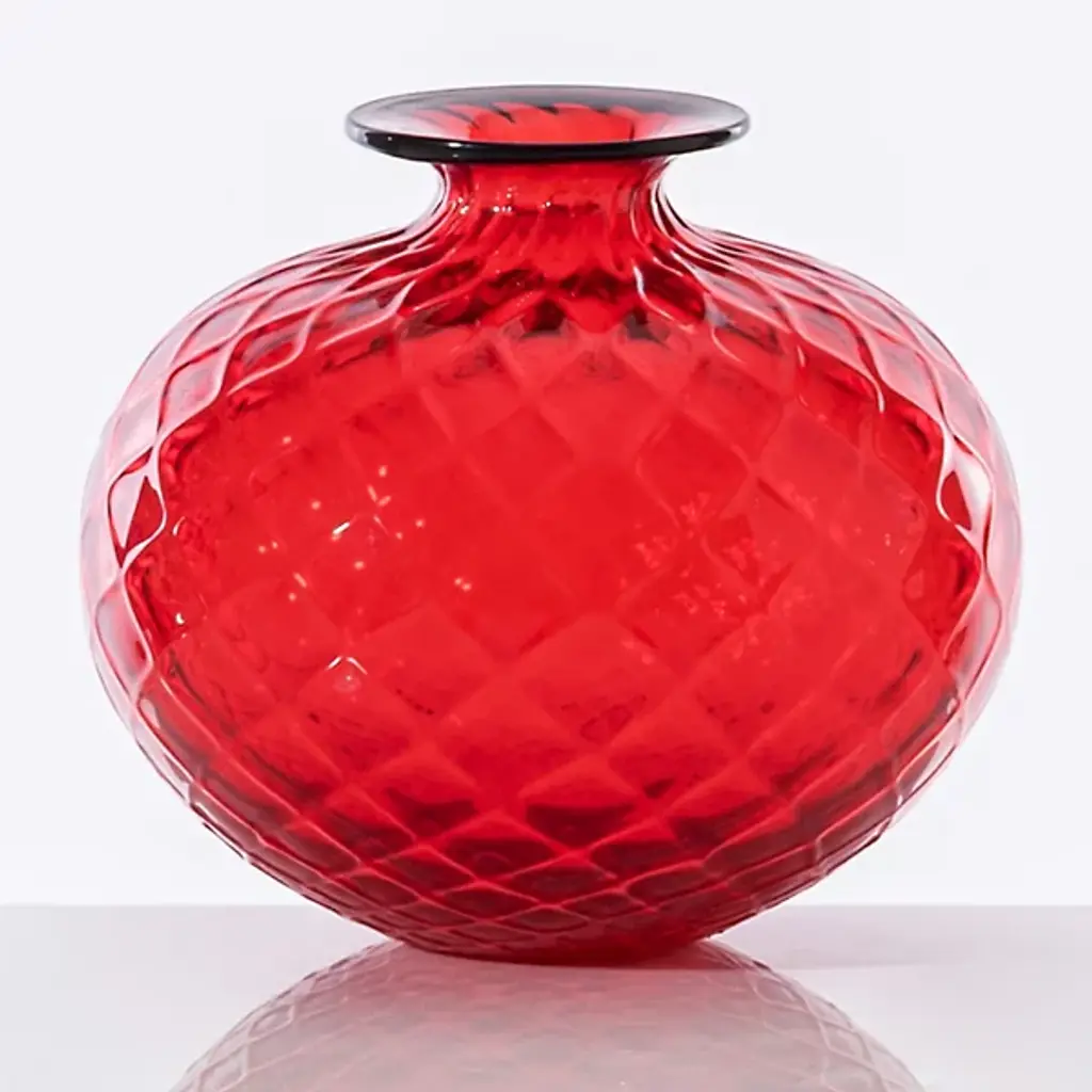 The Monofiore Balloton Vase from Venini employs a masterful quilted glass technique that plays tricks on the eye— appearing pillow-soft despite its solid form. This 1970 design captures the essence of Italian Murano glassmaking through its intricate Balloton pattern, created by skilled artisans who hand-blow and manipulate molten glass. A delicate colored thread winds its way around the piece while still hot, completing the distinctive pattern. Each vase, crafted in Italy, represents generations of craftsmanship where traditional methods meet artistic vision.