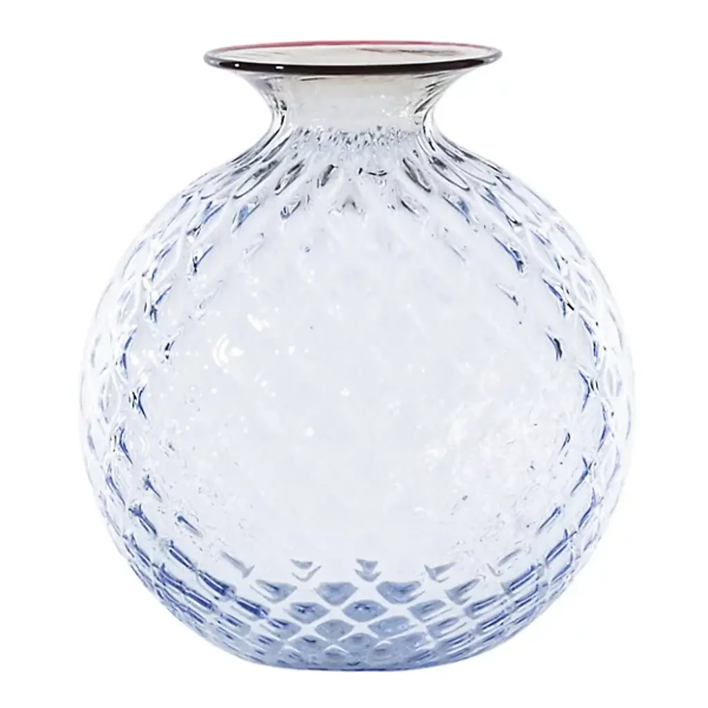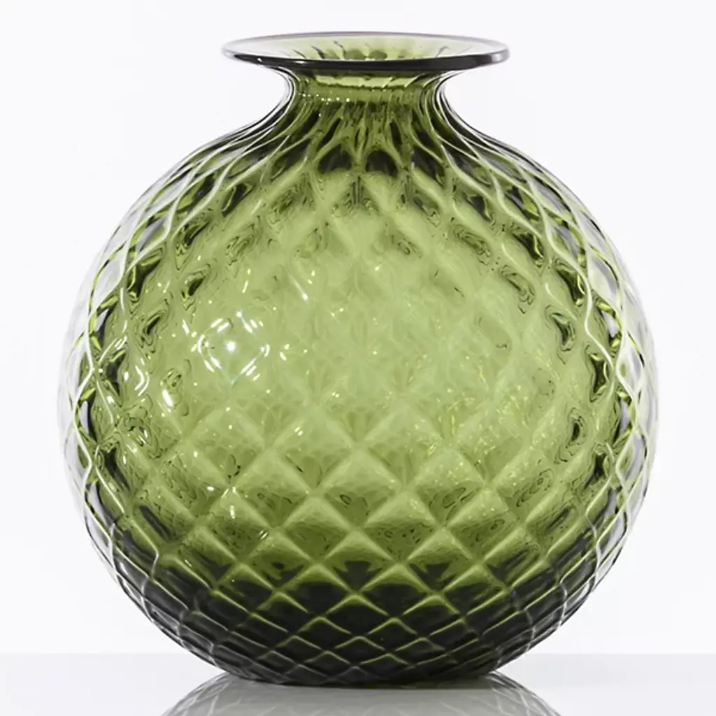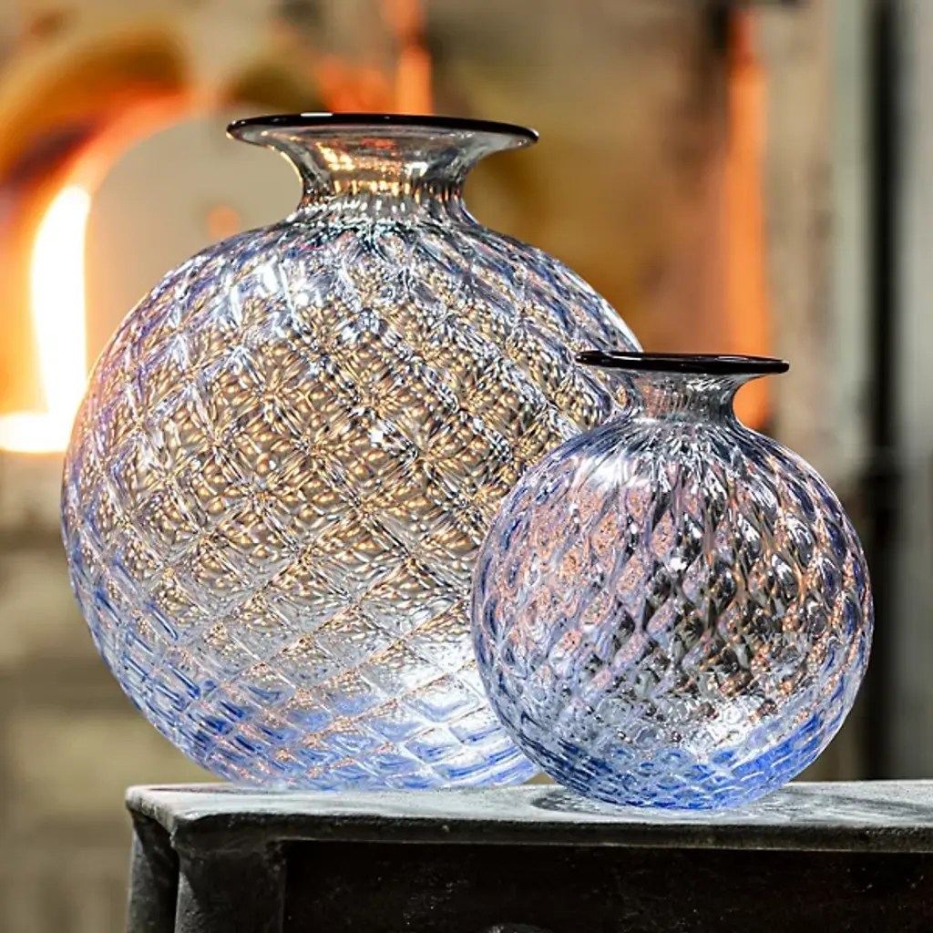 The Monofiore Balloton Vase from Venini employs a masterful quilted glass technique that plays tricks on the eye— appearing pillow-soft despite its solid form. This 1970 design captures the essence of Italian Murano glassmaking through its intricate Balloton pattern, created by skilled artisans who hand-blow and manipulate molten glass. A delicate colored thread winds its way around the piece while still hot, completing the distinctive pattern. Each vase, crafted in Italy, represents generations of craftsmanship where traditional methods meet artistic vision.