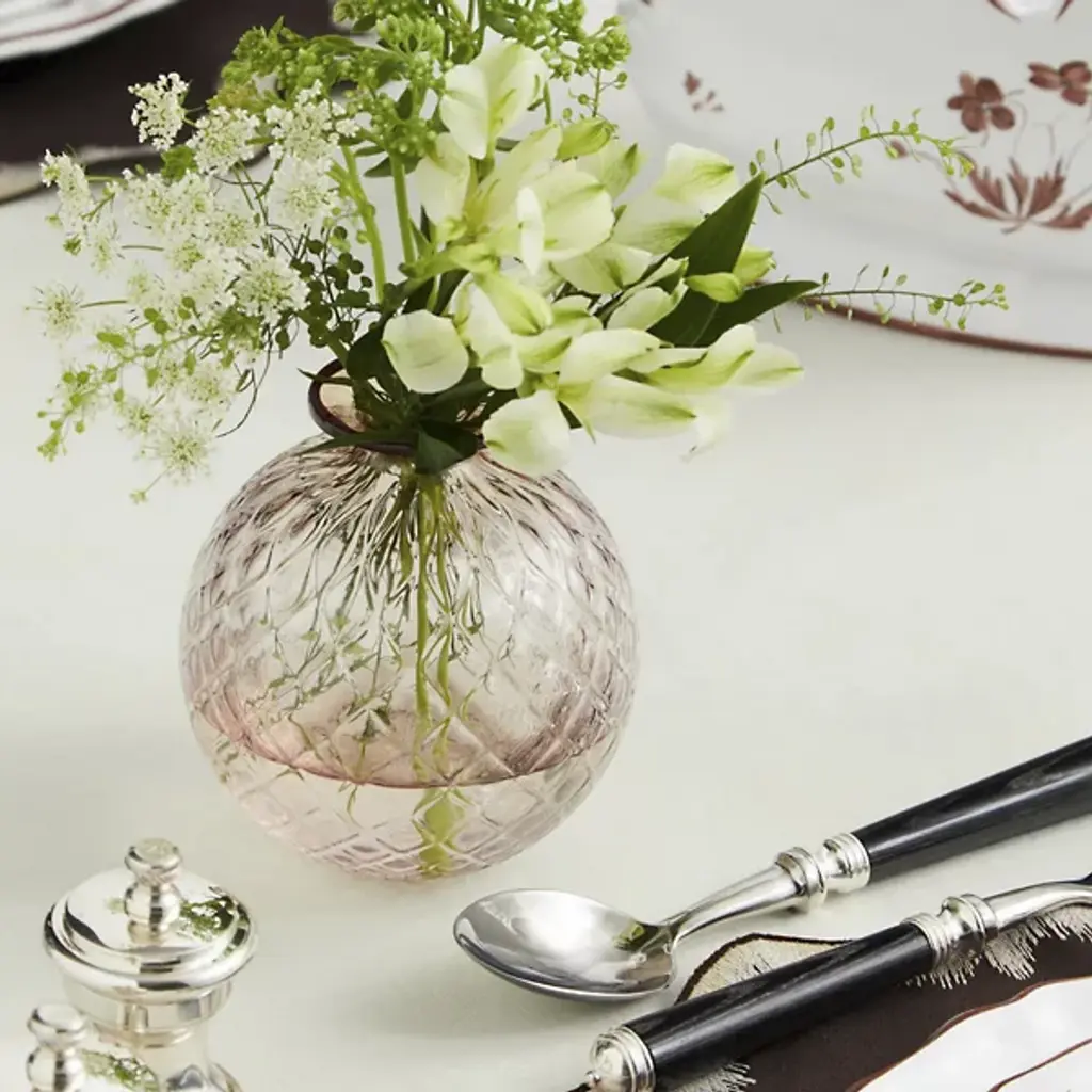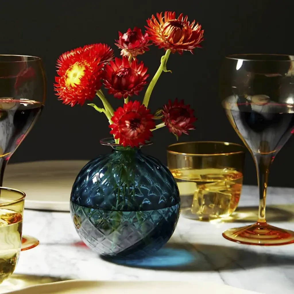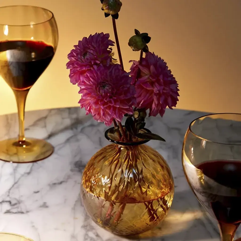 The Monofiore Balloton Vase from Venini employs a masterful quilted glass technique that plays tricks on the eye— appearing pillow-soft despite its solid form. This 1970 design captures the essence of Italian Murano glassmaking through its intricate Balloton pattern, created by skilled artisans who hand-blow and manipulate molten glass. A delicate colored thread winds its way around the piece while still hot, completing the distinctive pattern. Each vase, crafted in Italy, represents generations of craftsmanship where traditional methods meet artistic vision.