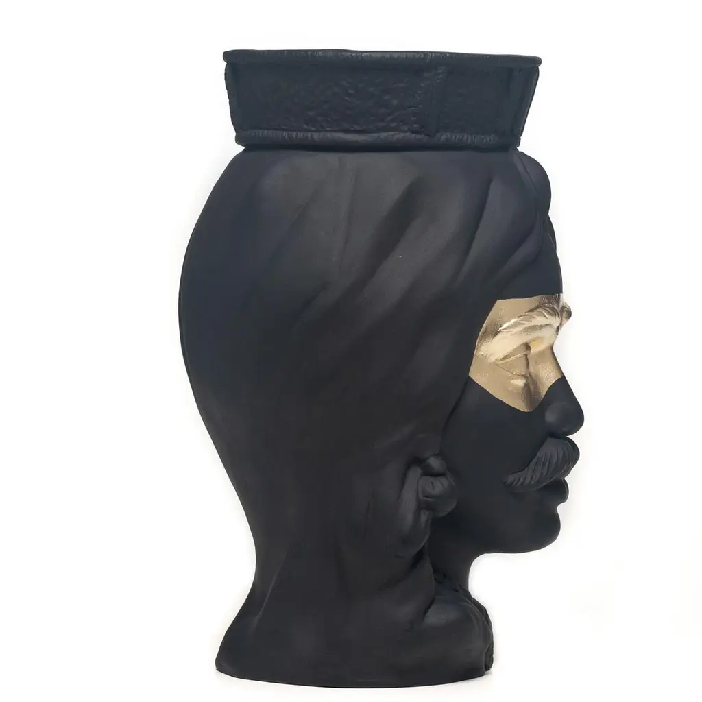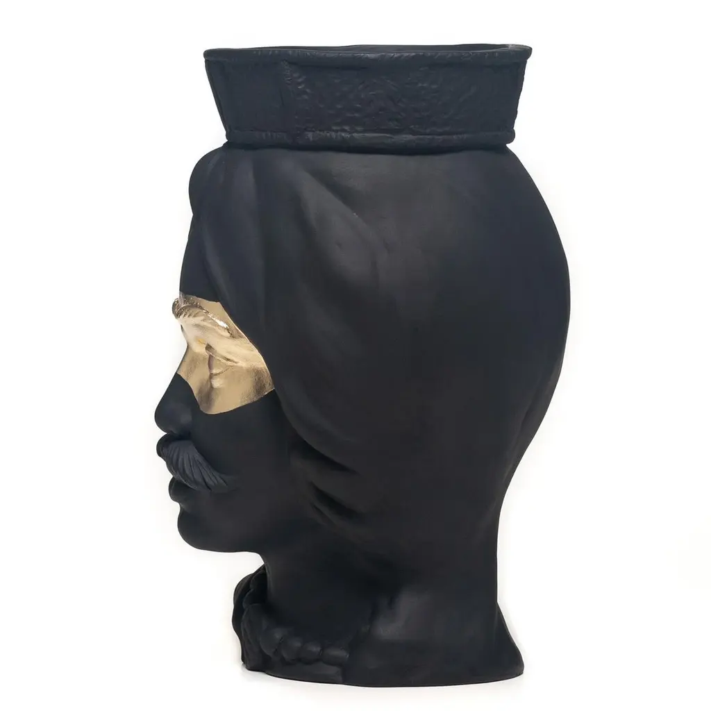 Timeless and stately, this versatile vase of a Sicilian nobleman will be a refined statement piece in a garden, patio, or kitchen decor. Fashioned of terracotta, this piece is marked by a striking countenance: a sinuously draped turban topped by a large jewel and a fez frames the youthful face, accented by a bold necklace and expressive mustache, the matte white glaze enhancing sculptural details. Drawing from Sicilian lore, this vase revisits with modern flair the legend of the love between a Moor and a maiden from the Muslim conquest.