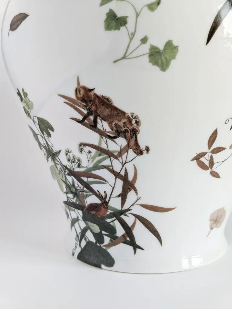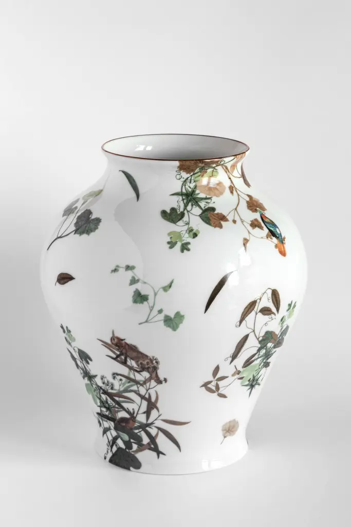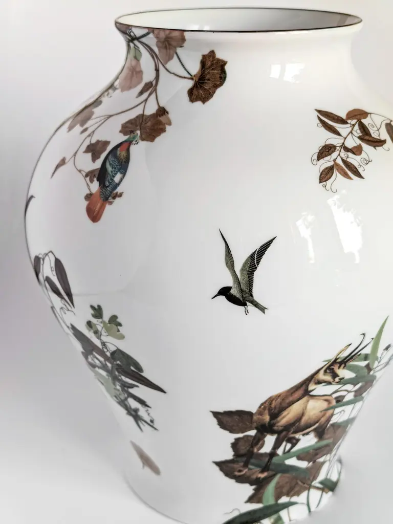 The Classic design of this porcelain vase comes back to life with retro decorations with a contemporary flavor. This vase is embellished with animals and branches inspired by the fauna and vegetation of the Italian/French Mont Blanc, in the Alpine chain.Measure: H 27cm.