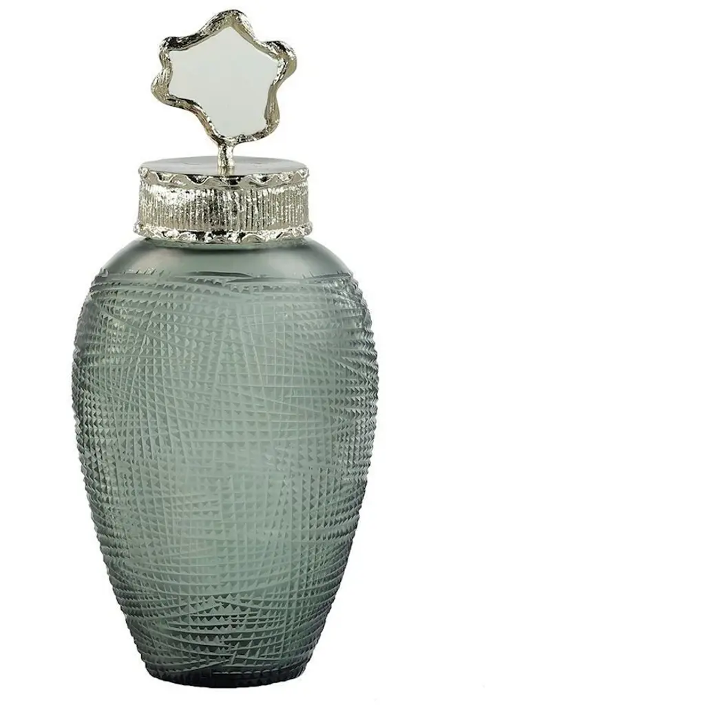 The Montague Vase is a romantic decorative vessel that contributes a wealth of visual depth to an interior space. Crafted from glass, the piece features a rounded body that showcases visual depth through a textural crosshatch pattern. The rim of the vase displays an accent of enameled aluminum in a Champagne finish, topped by an organically shaped motif with seductive curvature.