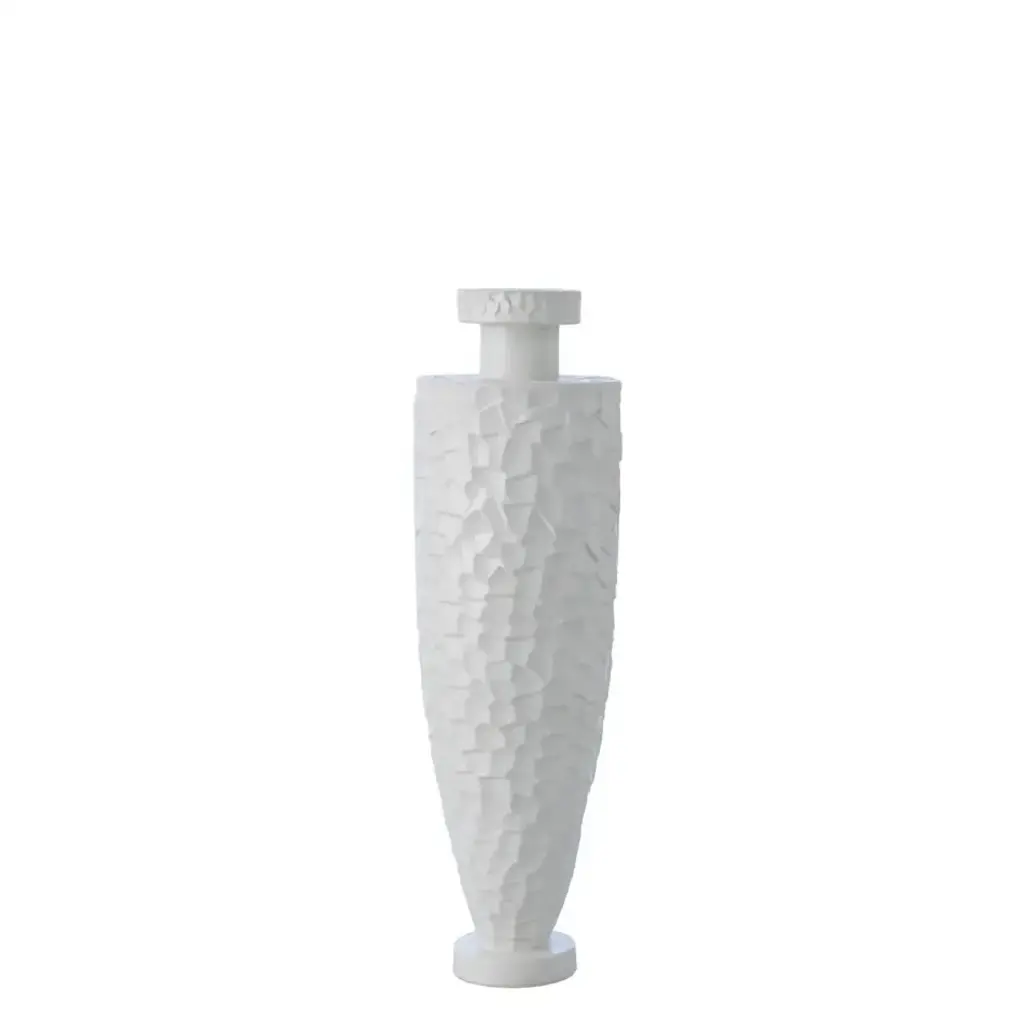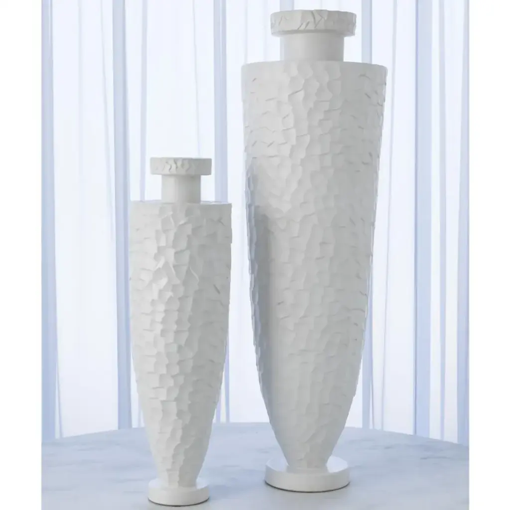 Monumental Chiseled vase made of matte white finished ceramic with a hand textured top. From a fashion forward perspective, Global Views offers accessories, furniture, statement lighting, and an assortment of rugs and mirrors to add beauty and joy to your home.