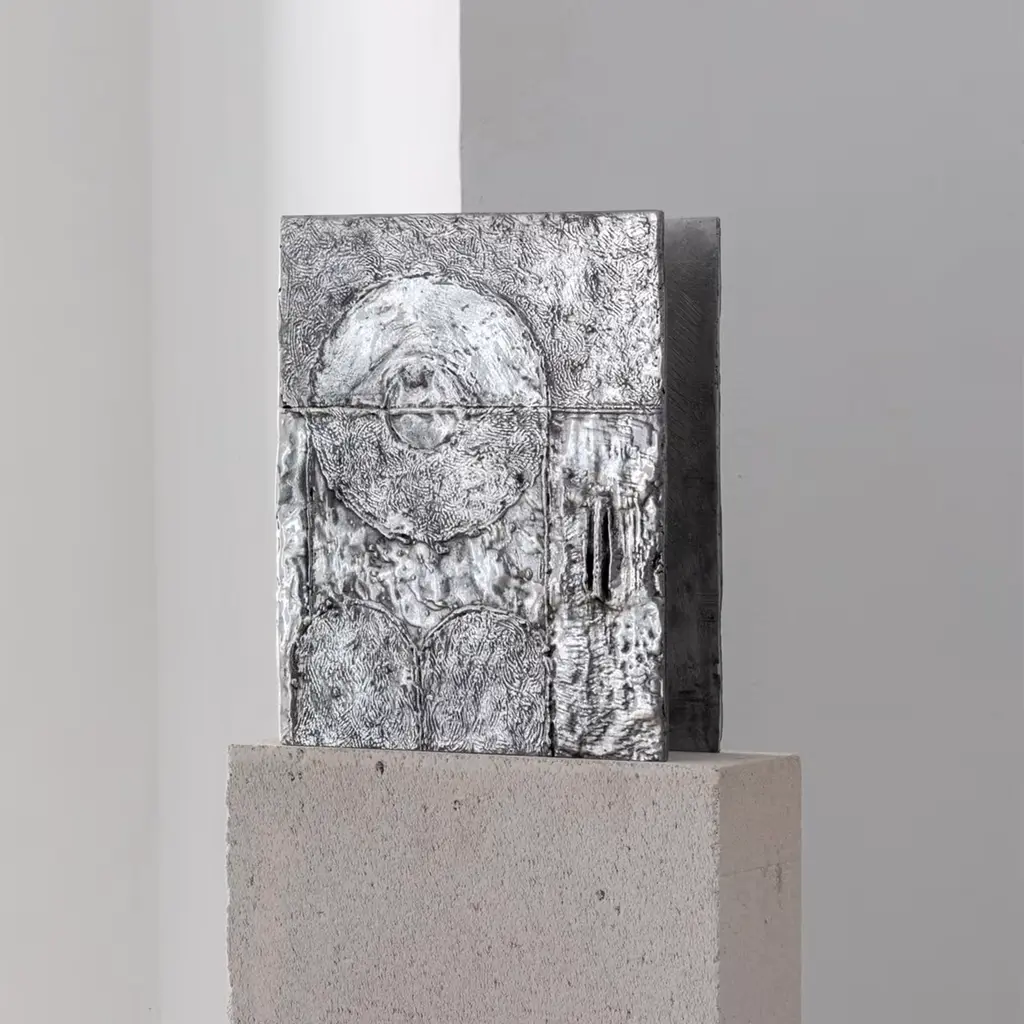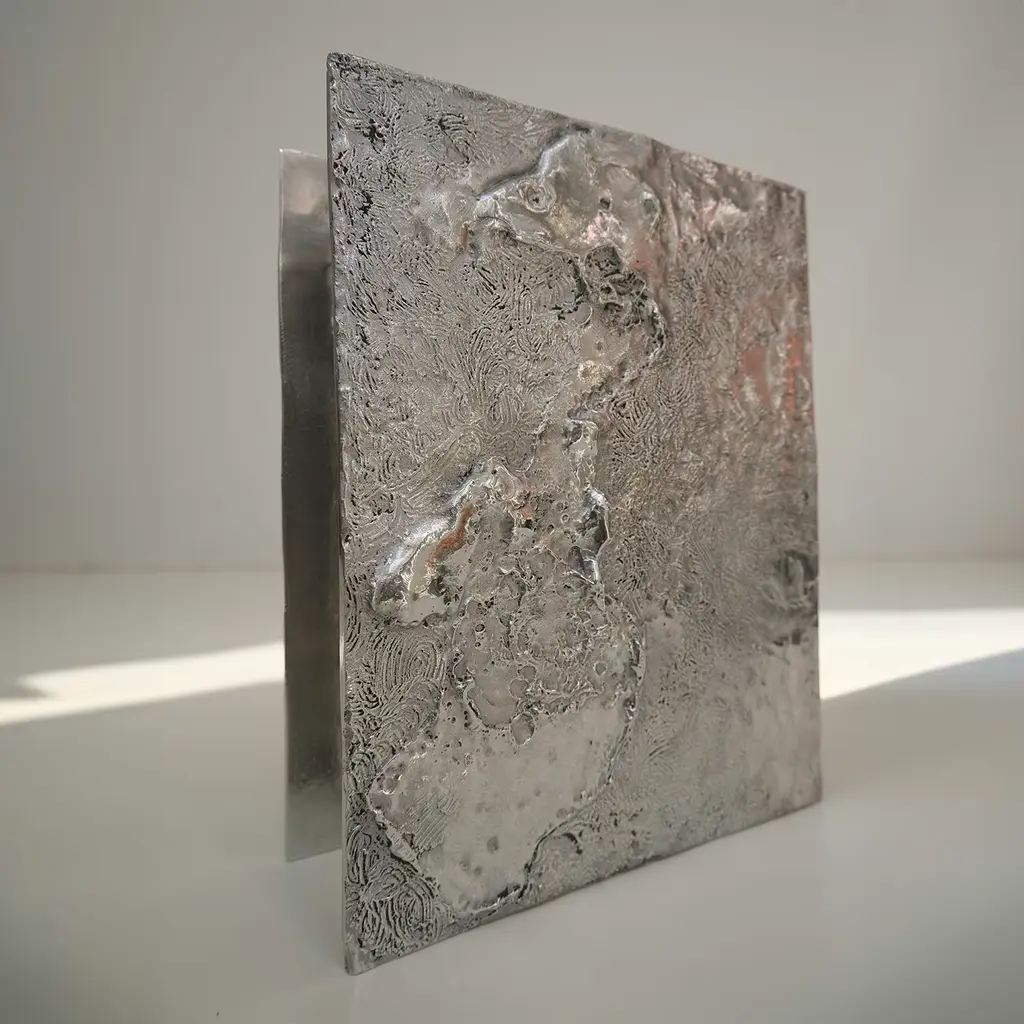 Forged in cast bronze, this artwork reveals unpredictable lunar architectures with distinct patterns on each side. Customizable for uniform patterns. Wanderart metal-cast artworks are all hand made, therefore dimensions and weight may vary.