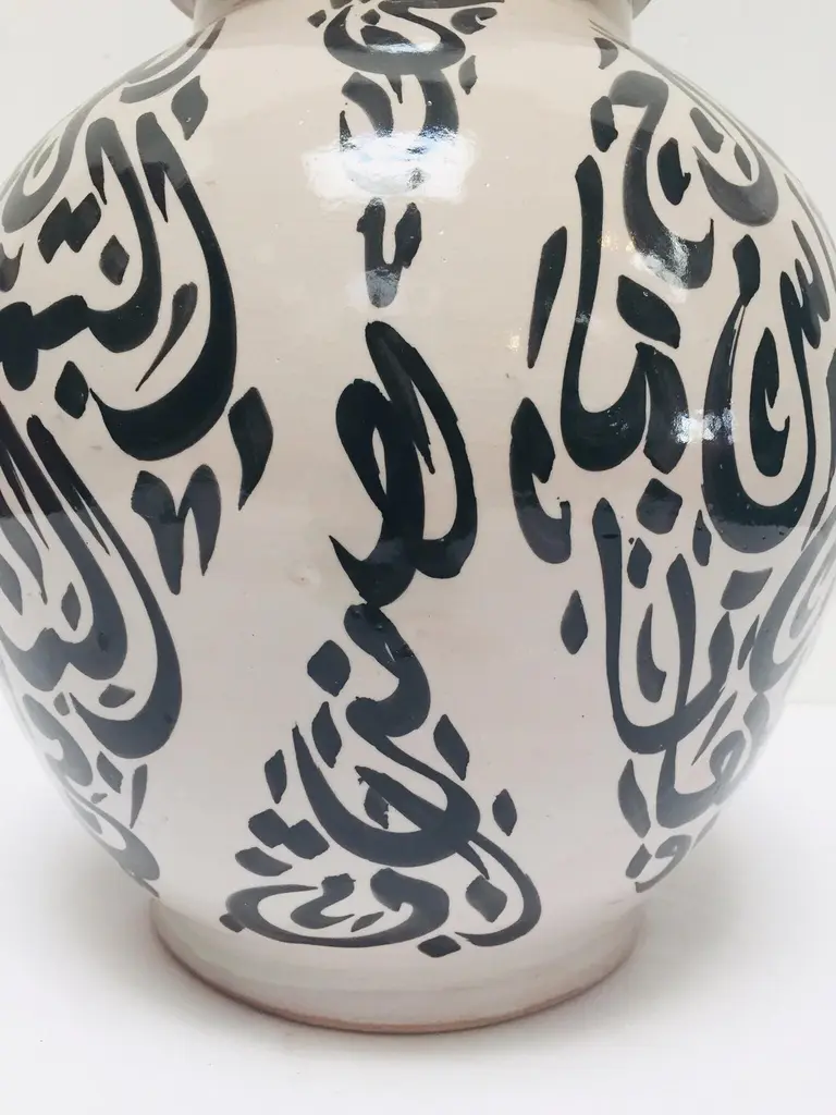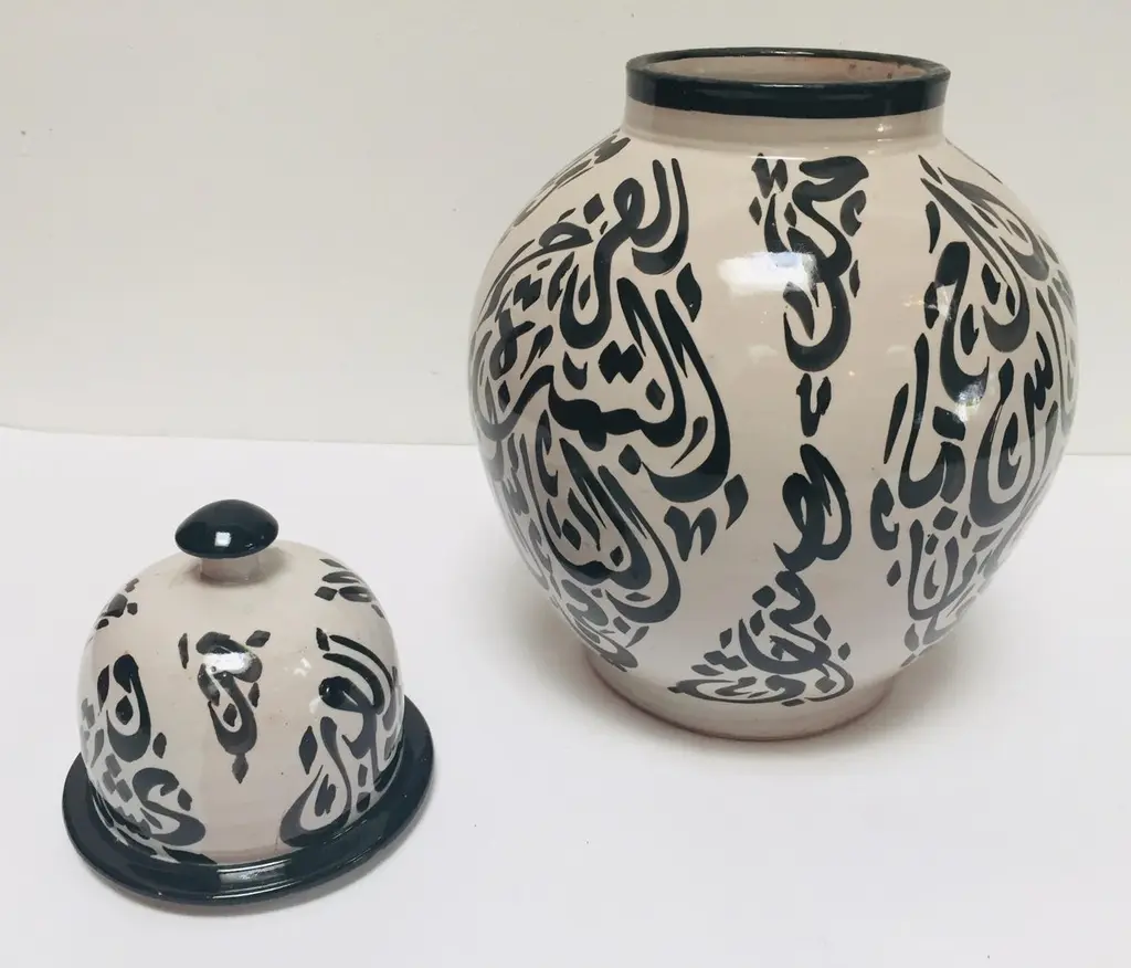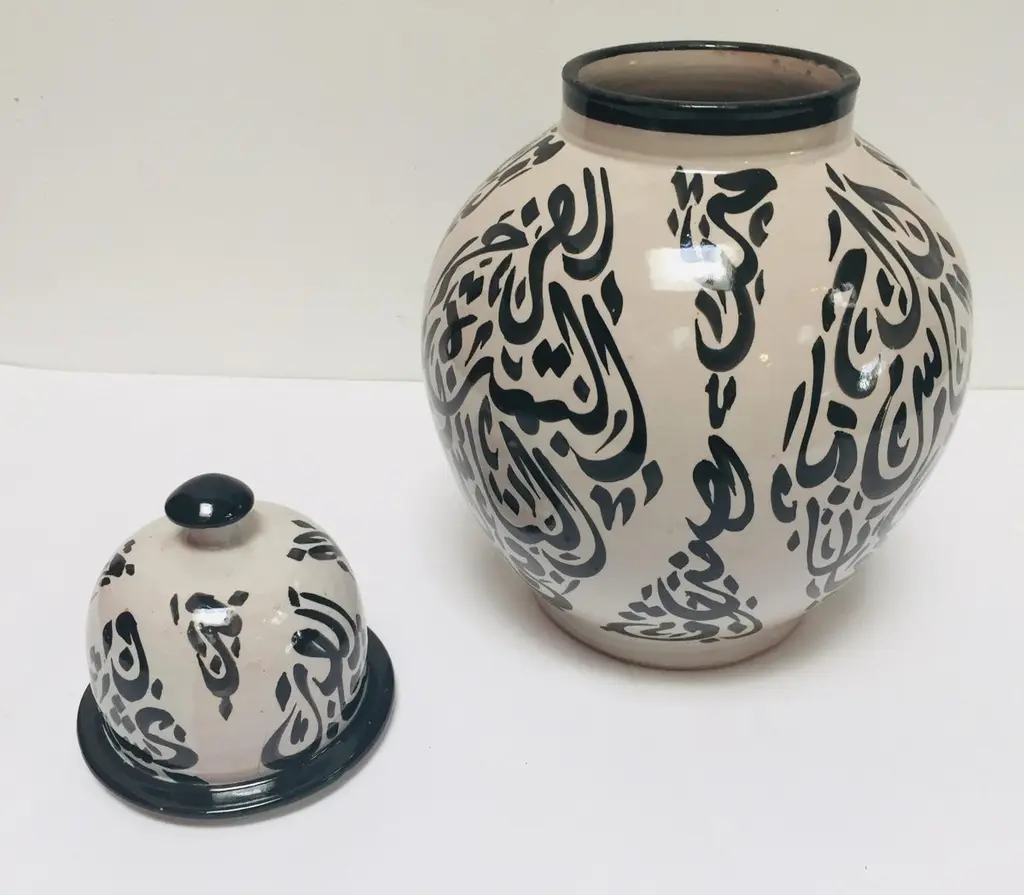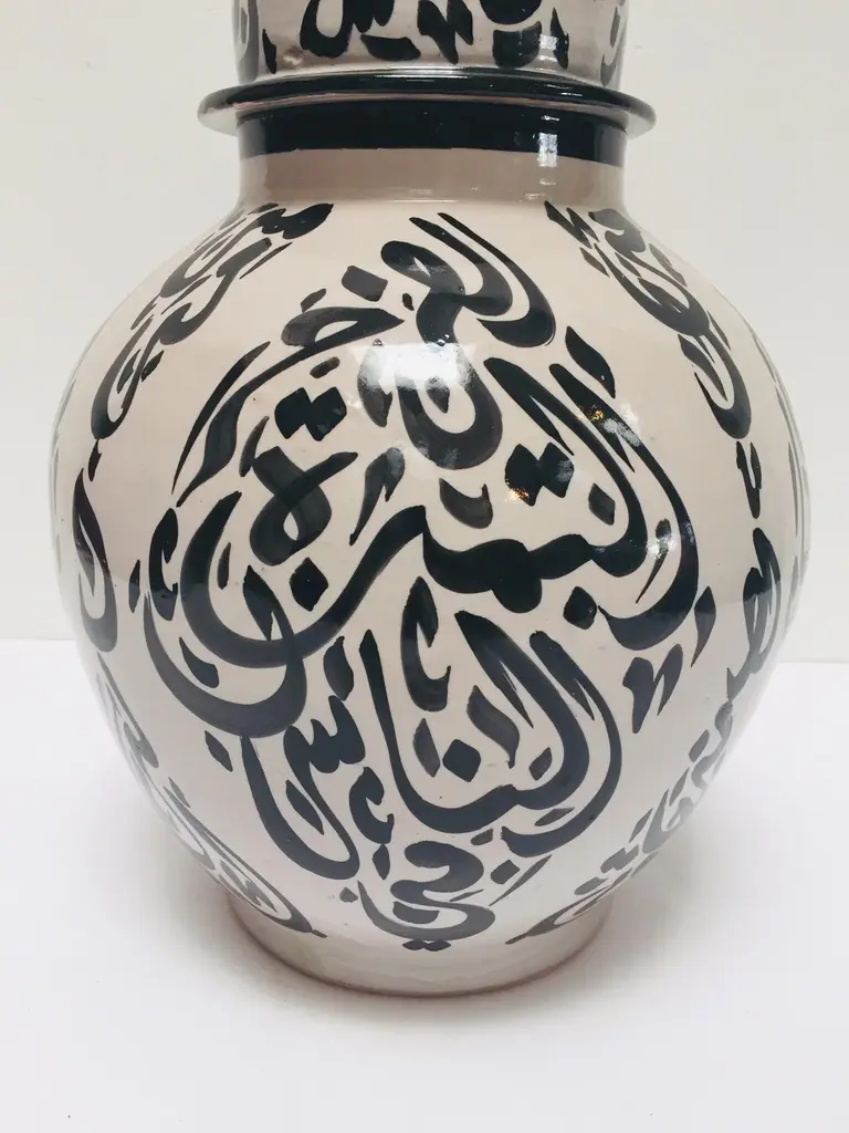 Large Moroccan glazed ceramic urn with lid from Fez.Moorish style ceramic handcrafted and hand painted with Arabic calligraphy writing.This kind of Art Writing looks calligraphic is called Lettrism, it is a form of art that uses letters that are not supposed to mean anything, just put together as decorative art.It is just about the beauty of the Arabic letters writing.Black charcoal color writing design on ivory color background.Large size: 21 in. height x 13 in. diameter.Handcrafted in Fez, Morocco.Signed in the bottom: Fez.