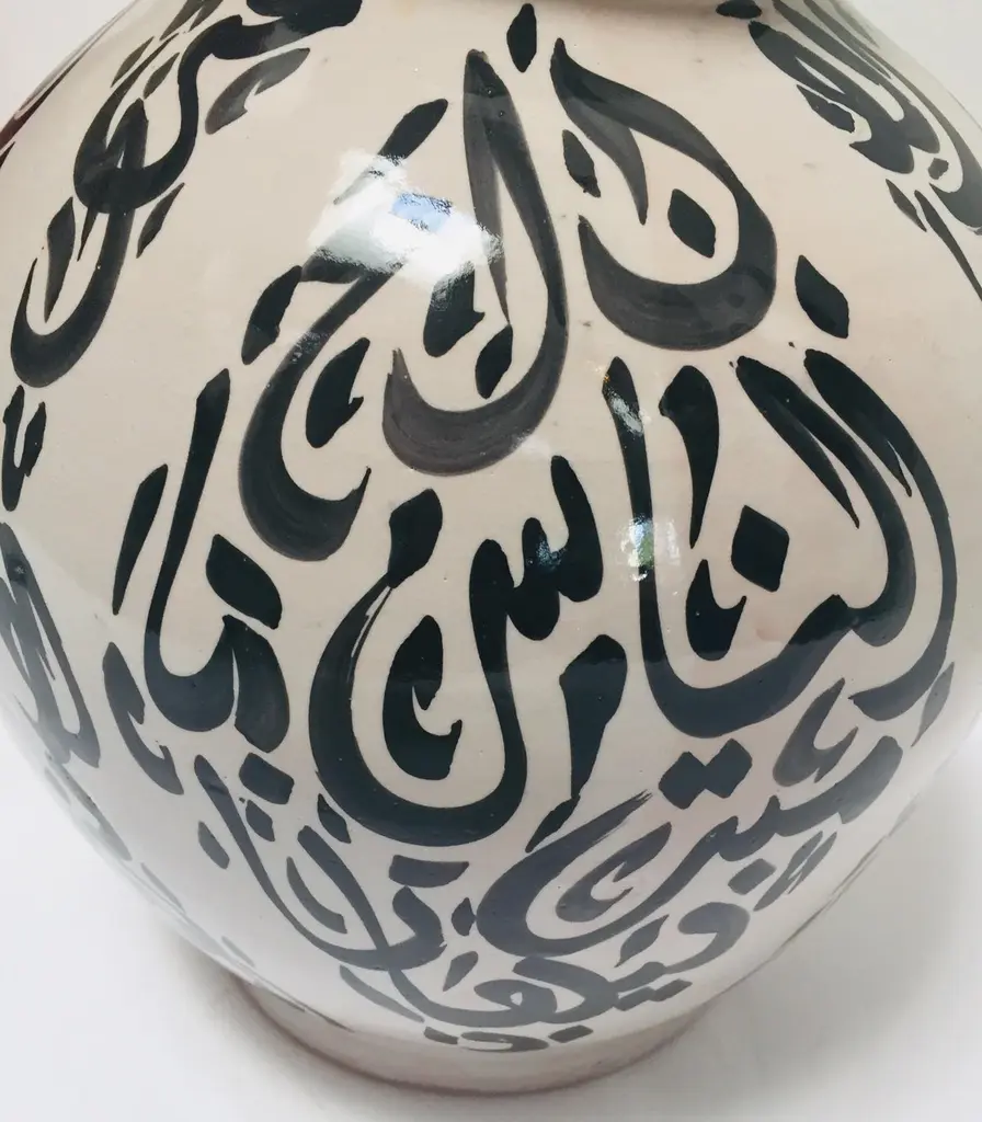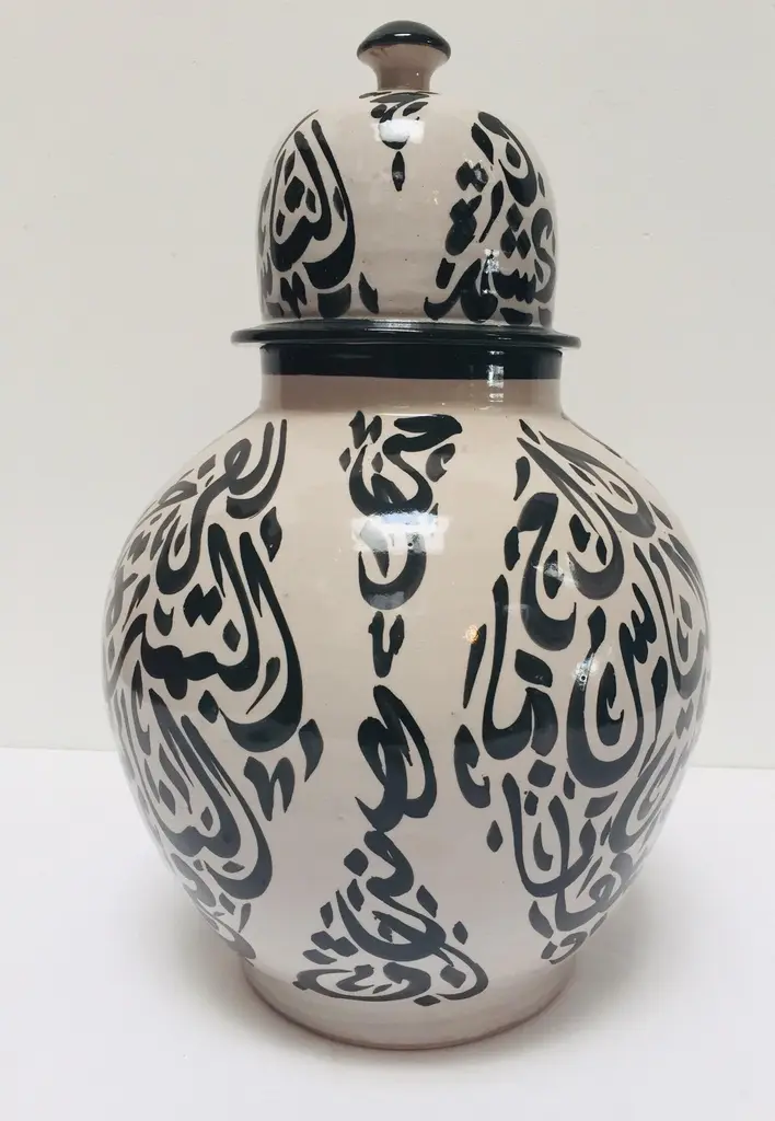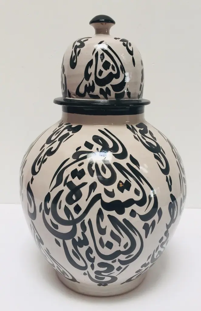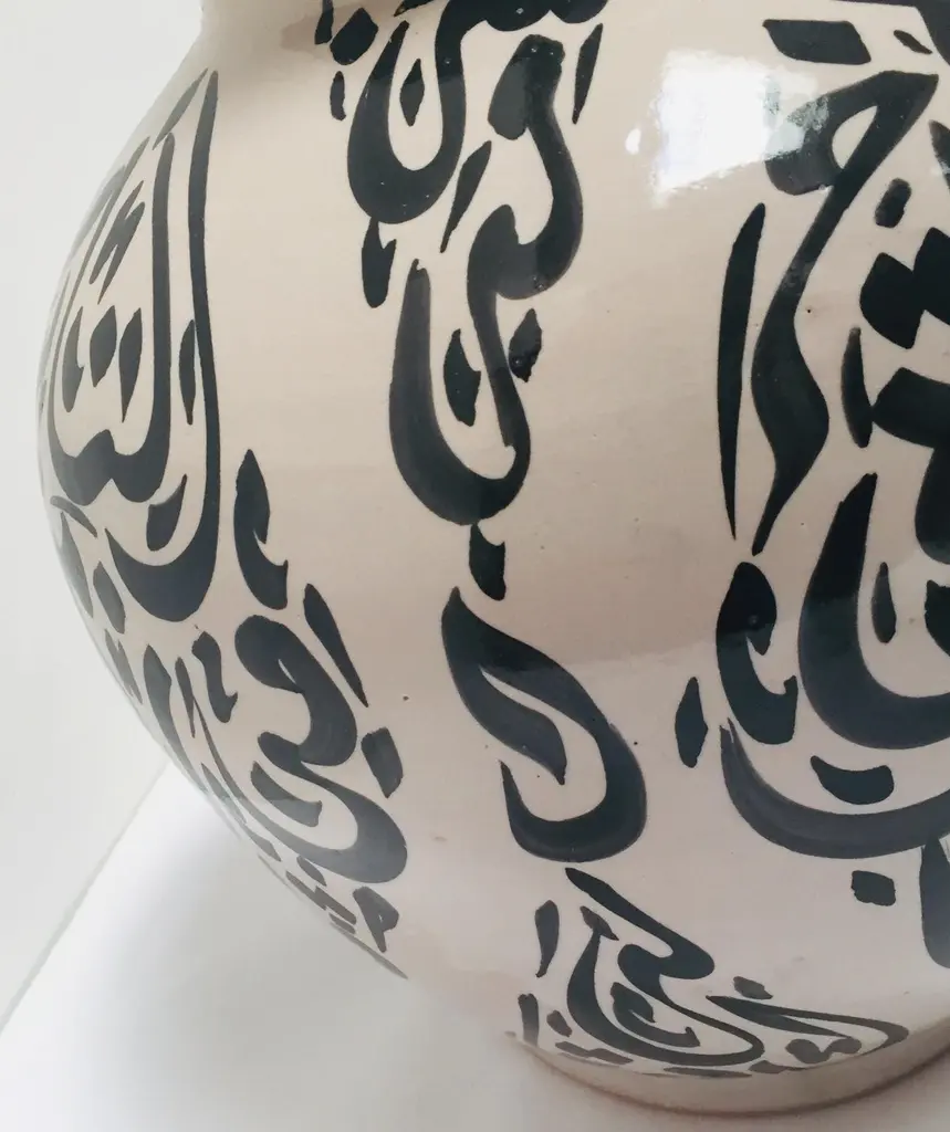 Large Moroccan glazed ceramic urn with lid from Fez.Moorish style ceramic handcrafted and hand painted with Arabic calligraphy writing.This kind of Art Writing looks calligraphic is called Lettrism, it is a form of art that uses letters that are not supposed to mean anything, just put together as decorative art.It is just about the beauty of the Arabic letters writing.Black charcoal color writing design on ivory color background.Large size: 21 in. height x 13 in. diameter.Handcrafted in Fez, Morocco.Signed in the bottom: Fez.