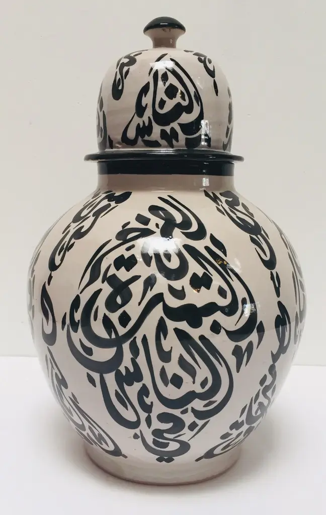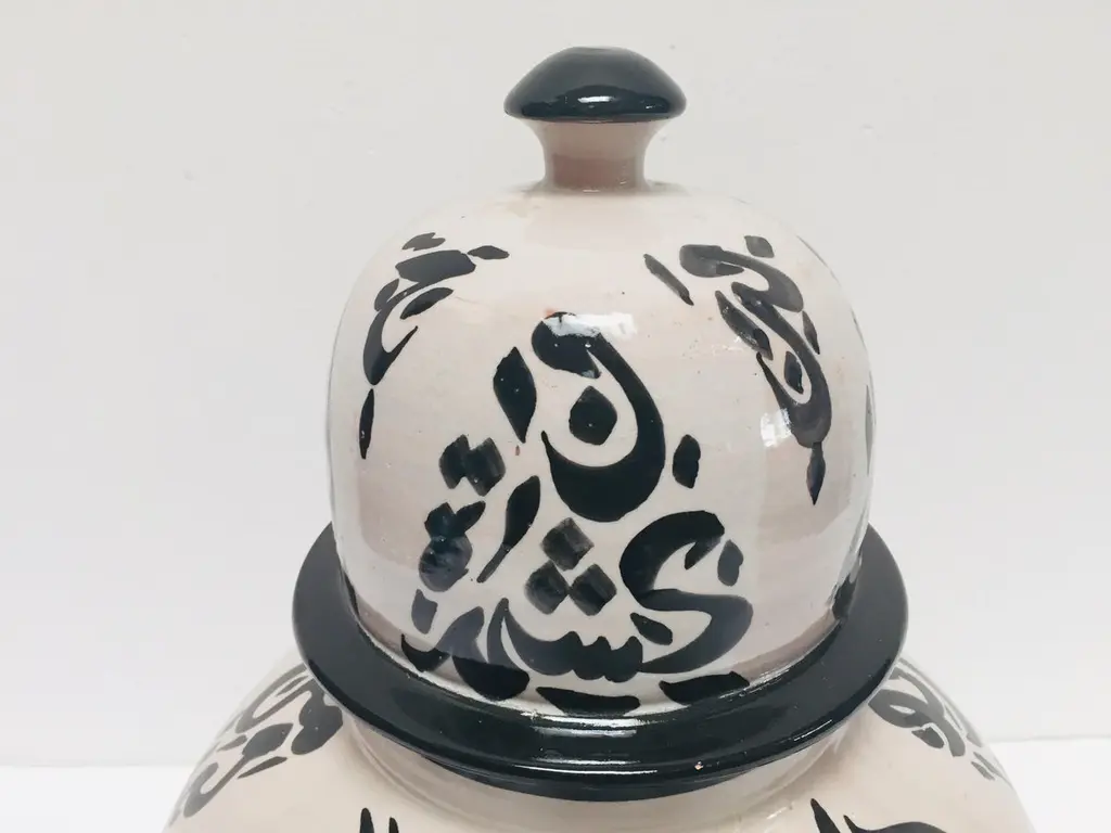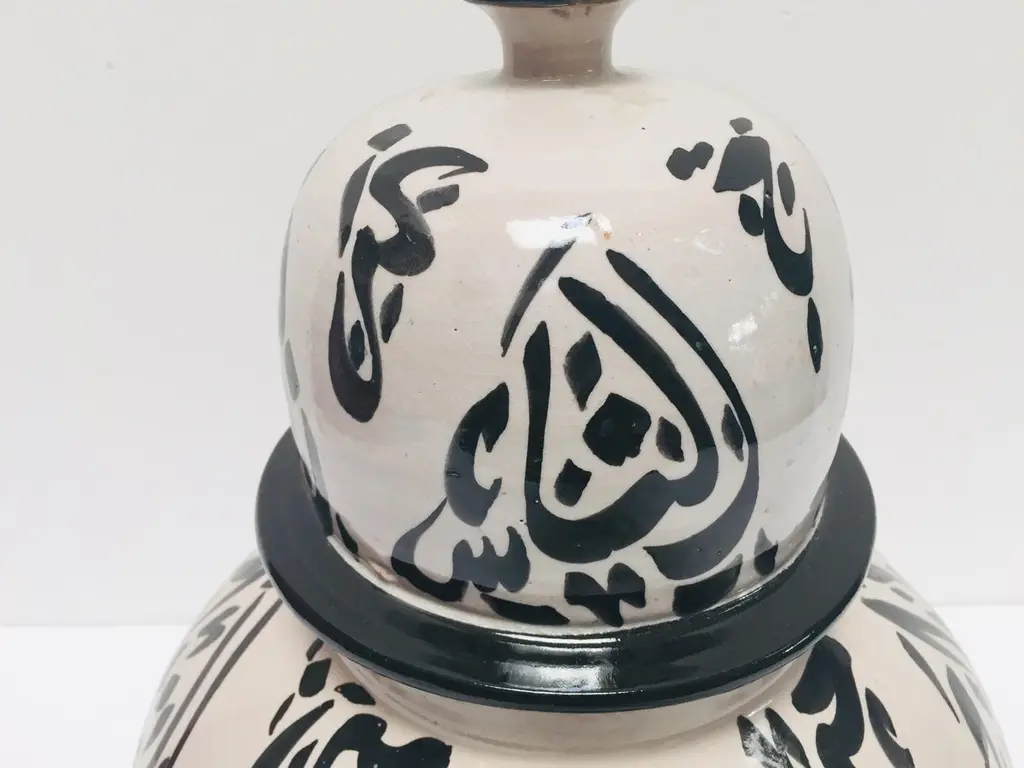 Moorish Ceramic Lidded Urn With Arabic Calligraphy Lettrism Black Writing