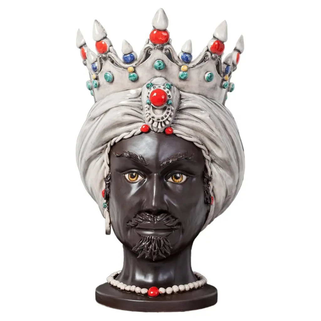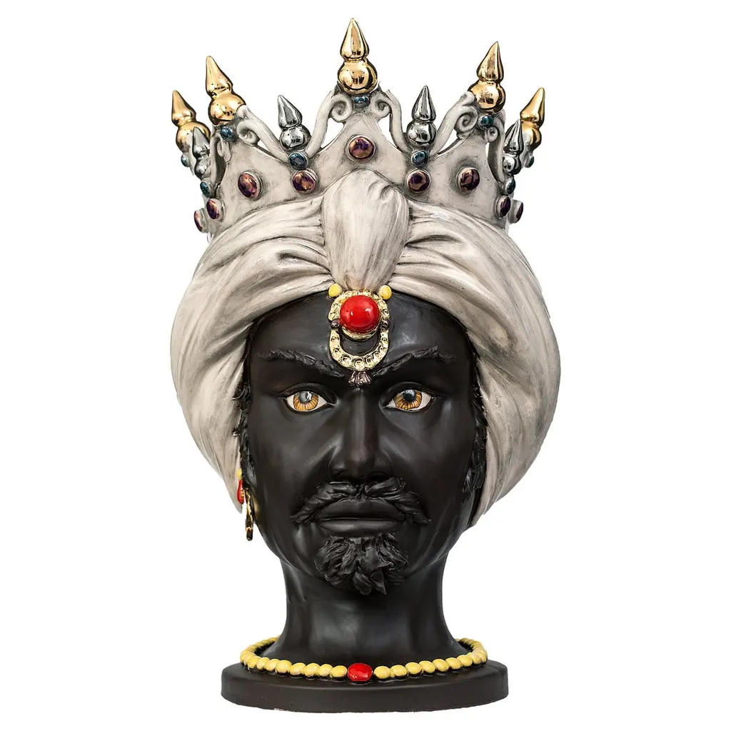 The CollectionThis collection offers ideas for contemporary décor through sophisticated revelations of art bound to the tradition of ceramics of Caltagirone, objets d’art that combine history and design.The extreme attention to details, supported by twenty years of experience of master craftsmen, is the company’s strength.The production technique hides secrets and art mixtures that make the product unique and exclusive. Mosche Bianche chooses to combine art and design to recall history through ceramic artworks in doing so, history revives, as in a fairy tale, an incredible civilization that is the sicilian culture.The moorish heads in ceramics, tribute to the beauty of ancient Sicily and its traditions, draw inspiration from a legend of love and jealousy set during the arabic domination in Sicily.A Story Of Love And JealousyThe legend tells that during the moorish domination in Sicily around 1000, in the arabic district of Palermo “al hàlisah” that a moor who, overwhelmed by a violent passion, declared his love to her. Noticed means “the chosen one”, a sweet girl the young girl charmed by his promise of love reciprocated. However, the moor was hiding a terrible truth. He already had a wife and children back home. So, when the girl discovered it, she decided to keep his beloved face with her forever. Without hesitation, she cut off his head and create a vase in which she planted a basil shoot. This aromatic plant has always had an aura of holiness as it represents the rulers’ plant. In this sense, that terrible act was justified by her absolute love to continue to take care of her beloved young moor. Every day in fact, the tears of the young heart-broken girl watered the plant of basil that kept thriving and flourishing. And all the neighbours, inebriated by that sentof the beautiful plant, started to commission clay vases shaped as a moor head.This piece is available with Crown or Without:Sizes: (D - H)With crownS 16 x 24 cm - 5.90 x 9.45 incM 26 x 40 cm - 10.23 x 15.74 incL 32 x 50 cm - 12.59 x 19.68 incWithout crownS 16 x 22 cm - 6.29 x 8.66 incM 26 x 35 cm - 10.23 x 13.77 incL 32 x 46 cm - 12.59 x 18.11 inc.