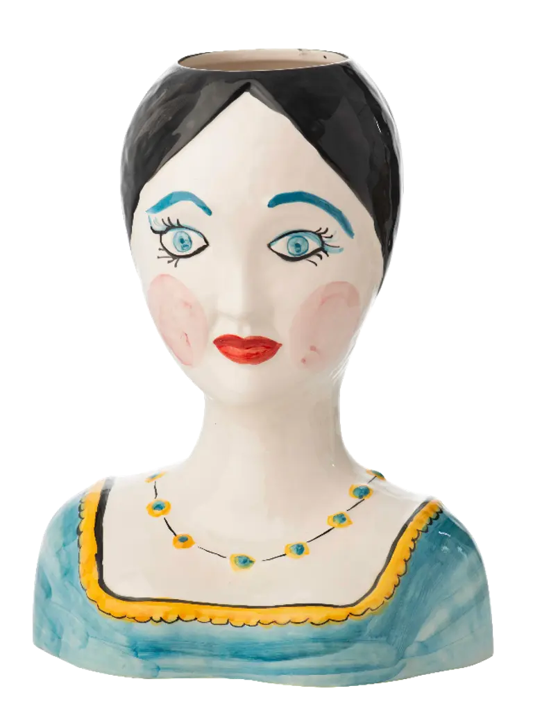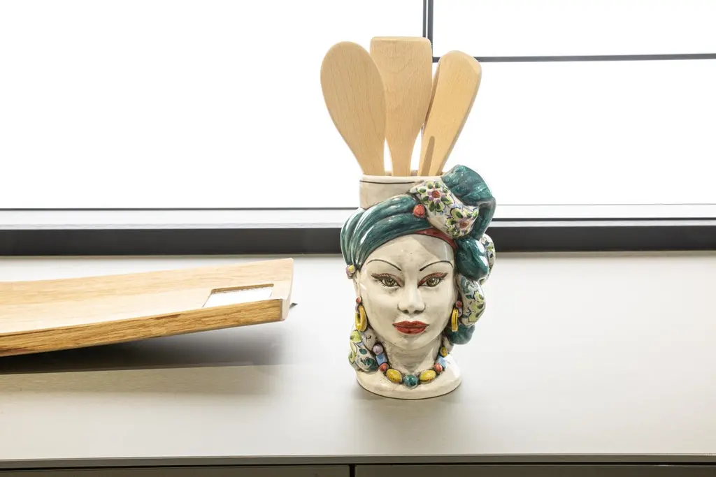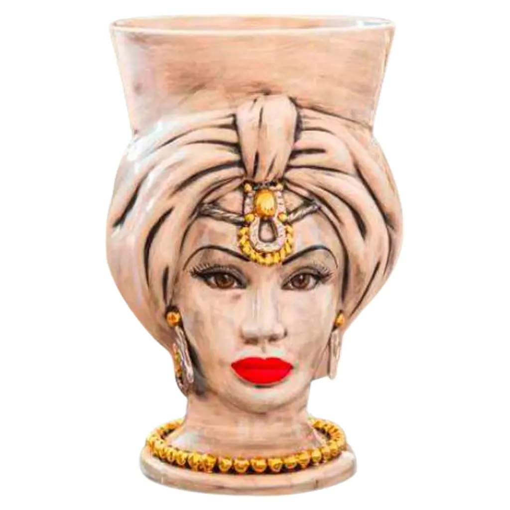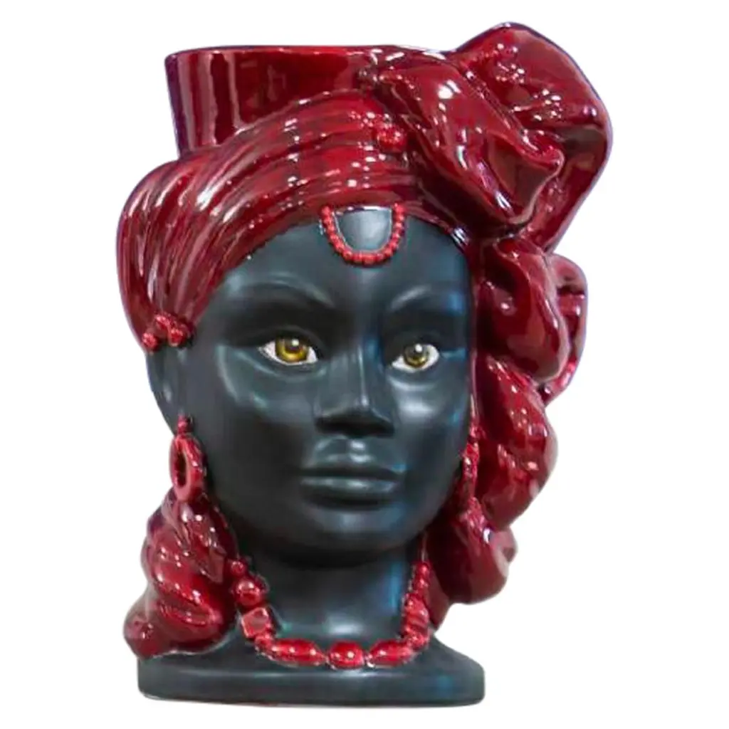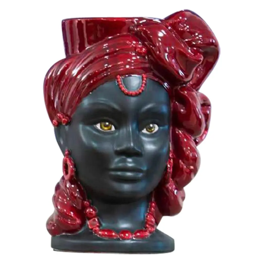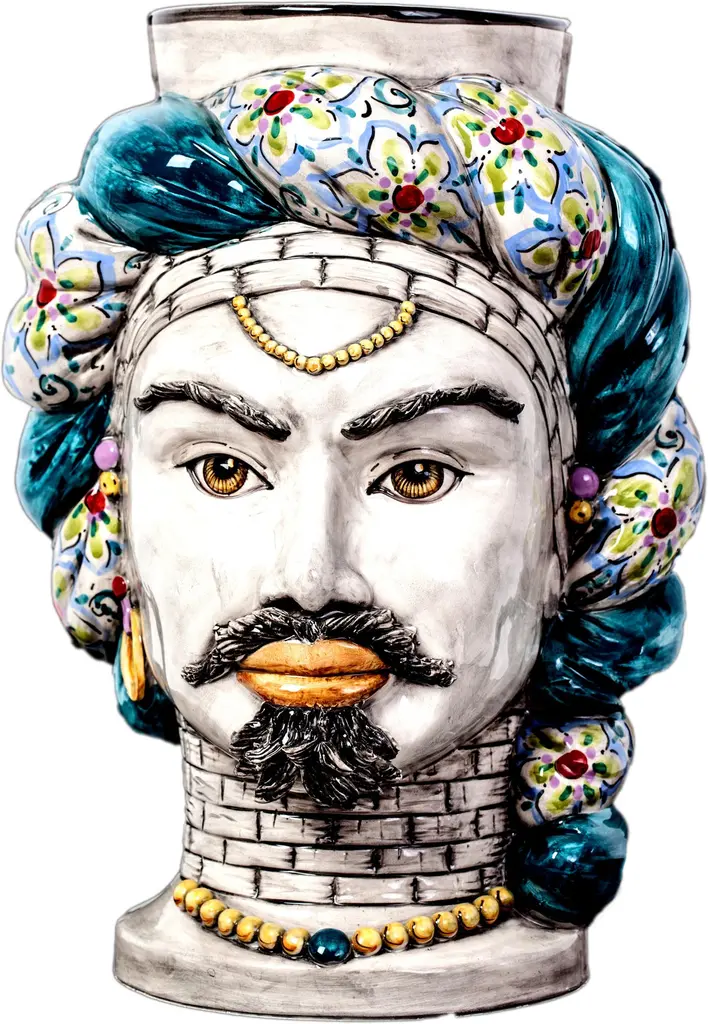 The CollectionThis collection offers ideas for contemporary décor through sophisticated revelations of art bound to the tradition of ceramics of Caltagirone, objets d’art that combine history and design.The extreme attention to details, supported by twenty years of experience of master craftsmen, is the company’s strength.The production technique hides secrets and art mixtures that make the product unique and exclusive. Mosche Bianche chooses to combine art and design to recall history through ceramic artworks in doing so, history revives, as in a fairy tale, an incredible civilization that is the sicilian culture.The moorish heads in ceramics, tribute to the beauty of ancient Sicily and its traditions, draw inspiration from a legend of love and jealousy set during the arabic domination in Sicily.A Story Of Love And JealousyThe legend tells that during the moorish domination in Sicily around 1000, in the arabic district of Palermo “al hàlisah” that a moor who, overwhelmed by a violent passion, declared his love to her. Noticed means “the chosen one”, a sweet girl the young girl charmed by his promise of love reciprocated. However, the moor was hiding a terrible truth. He already had a wife and children back home. So, when the girl discovered it, she decided to keep his beloved face with her forever. Without hesitation, she cut off his head and create a vase in which she planted a basil shoot. This aromatic plant has always had an aura of holiness as it represents the rulers’ plant. In this sense, that terrible act was justified by her absolute love to continue to take care of her beloved young moor. Every day in fact, the tears of the young heart-broken girl watered the plant of basil that kept thriving and flourishing. And all the neighbours, inebriated by that sentof the beautiful plant, started to commission clay vases shaped as a moor head.This piece is available with Crown or Without:Sizes: (D - H)With crownS 16 x 24 cm - 5.90 x 9.45 incM 26 x 40 cm - 10.23 x 15.74 incL 32 x 50 cm - 12.59 x 19.68 incWithout crownS 16 x 22 cm - 6.29 x 8.66 incM 26 x 35 cm - 10.23 x 13.77 incL 32 x 46 cm - 12.59 x 18.11 inc.