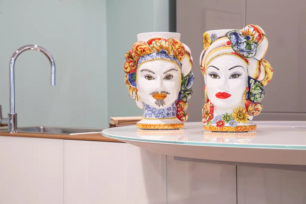 The CollectionThis collection offers ideas for contemporary décor through sophisticated revelations of art bound to the tradition of ceramics of Caltagirone, objets d’art that combine history and design.The extreme attention to details, supported by twenty years of experience of master craftsmen, is the company’s strength.The production technique hides secrets and art mixtures that make the product unique and exclusive. Mosche Bianche chooses to combine art and design to recall history through ceramic artworks in doing so, history revives, as in a fairy tale, an incredible civilization that is the sicilian culture.The moorish heads in ceramics, tribute to the beauty of ancient Sicily and its traditions, draw inspiration from a legend of love and jealousy set during the arabic domination in Sicily.A Story Of Love And JealousyThe legend tells that during the moorish domination in Sicily around 1000, in the arabic district of Palermo “al hàlisah” that a moor who, overwhelmed by a violent passion, declared his love to her. Noticed means “the chosen one”, a sweet girl the young girl charmed by his promise of love reciprocated. However, the moor was hiding a terrible truth. He already had a wife and children back home. So, when the girl discovered it, she decided to keep his beloved face with her forever. Without hesitation, she cut off his head and create a vase in which she planted a basil shoot. This aromatic plant has always had an aura of holiness as it represents the rulers’ plant. In this sense, that terrible act was justified by her absolute love to continue to take care of her beloved young moor. Every day in fact, the tears of the young heart-broken girl watered the plant of basil that kept thriving and flourishing. And all the neighbours, inebriated by that sentof the beautiful plant, started to commission clay vases shaped as a moor head.This piece is available with Crown or Without:Sizes: (D - H)With crownS 16 x 24 cm - 5.90 x 9.45 incM 26 x 40 cm - 10.23 x 15.74 incL 32 x 50 cm - 12.59 x 19.68 incWithout crownS 16 x 22 cm - 6.29 x 8.66 incM 26 x 35 cm - 10.23 x 13.77 incL 32 x 46 cm - 12.59 x 18.11 inc.
