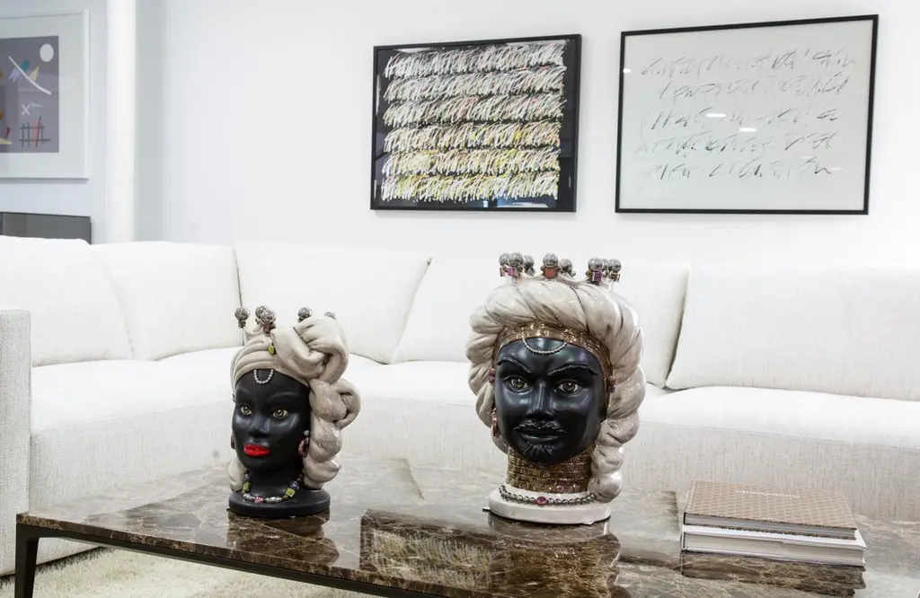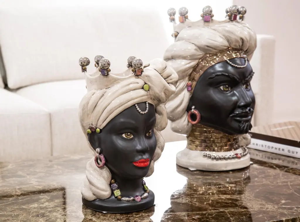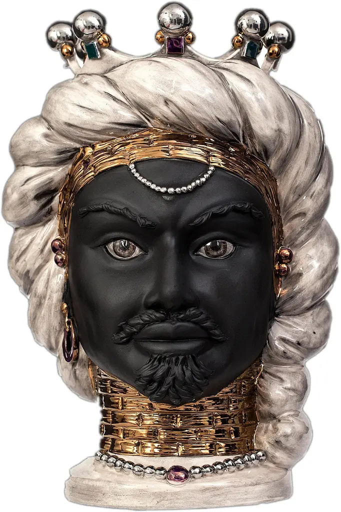 The CollectionThis collection offers ideas for contemporary décor through sophisticated revelations of art bound to the tradition of ceramics of Caltagirone, objets d’art that combine history and design.The extreme attention to details, supported by twenty years of experience of master craftsmen, is the company’s strength.The production technique hides secrets and art mixtures that make the product unique and exclusive. Mosche Bianche chooses to combine art and design to recall history through ceramic artworks in doing so, history revives, as in a fairy tale, an incredible civilization that is the sicilian culture.The moorish heads in ceramics, tribute to the beauty of ancient Sicily and its traditions, draw inspiration from a legend of love and jealousy set during the arabic domination in Sicily.A Story Of Love And JealousyThe legend tells that during the moorish domination in Sicily around 1000, in the arabic district of Palermo “al hàlisah” that a moor who, overwhelmed by a violent passion, declared his love to her. Noticed means “the chosen one”, a sweet girl the young girl charmed by his promise of love reciprocated. However, the moor was hiding a terrible truth. He already had a wife and children back home. So, when the girl discovered it, she decided to keep his beloved face with her forever. Without hesitation, she cut off his head and create a vase in which she planted a basil shoot. This aromatic plant has always had an aura of holiness as it represents the rulers’ plant. In this sense, that terrible act was justified by her absolute love to continue to take care of her beloved young moor. Every day in fact, the tears of the young heart-broken girl watered the plant of basil that kept thriving and flourishing. And all the neighbours, inebriated by that sentof the beautiful plant, started to commission clay vases shaped as a moor head.This piece is available with Crown or Without:Sizes: (D - H)With crownS 16 x 24 cm - 5.90 x 9.45 incM 26 x 40 cm - 10.23 x 15.74 incL 32 x 50 cm - 12.59 x 19.68 incWithout crownS 16 x 22 cm - 6.29 x 8.66 incM 26 x 35 cm - 10.23 x 13.77 incL 32 x 46 cm - 12.59 x 18.11 inc.
