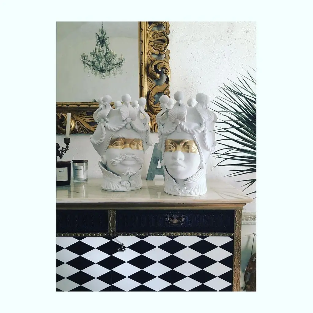 This collection is a work of art that make a statement in modern décor and in the modern cultural art world. It can be used as a vase containing flowers, or as a beautiful centerpiece or home décor object.Its design is inspired by the Moorish-inspired sculptures in Sicilian ceramic tradition. All Made in Italy:Made in Italy furniture means design, quality, style and sophistication. All the details are handcrafted and all the pieces are made to order, so they can come with different colors (see color palette in the pictures).This works are simply amazing with their incredible elegance. No wonder Dolce & Gabbana choose them to décor their most famous shop in Milan.Have yourself a truly unique piece!Moor Heads are in the White Lotus style, but matt! A new elegant and charming way to have moor heads like you have never seen before!