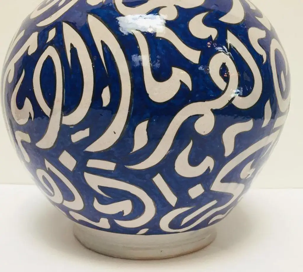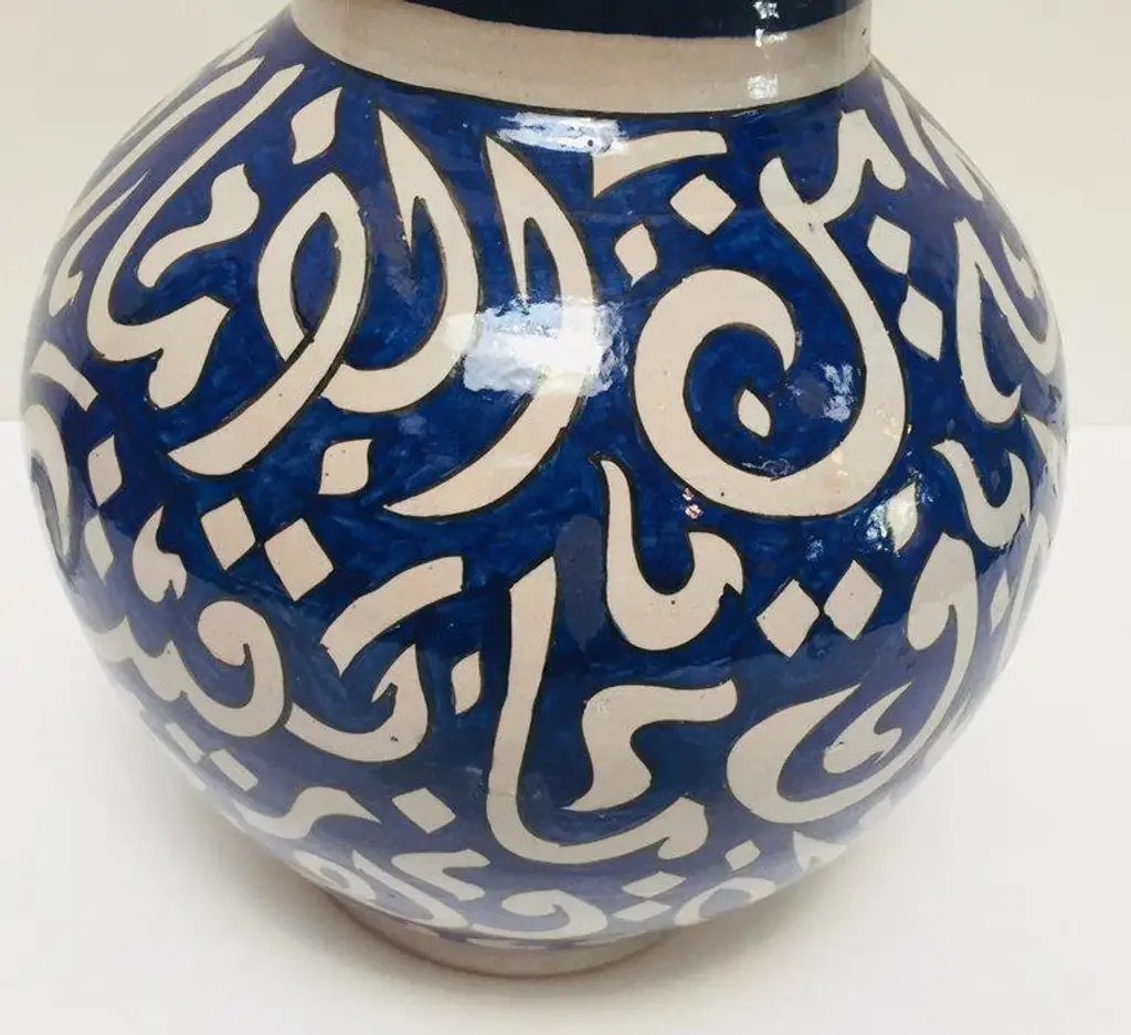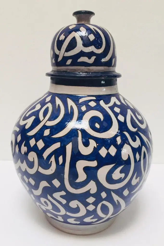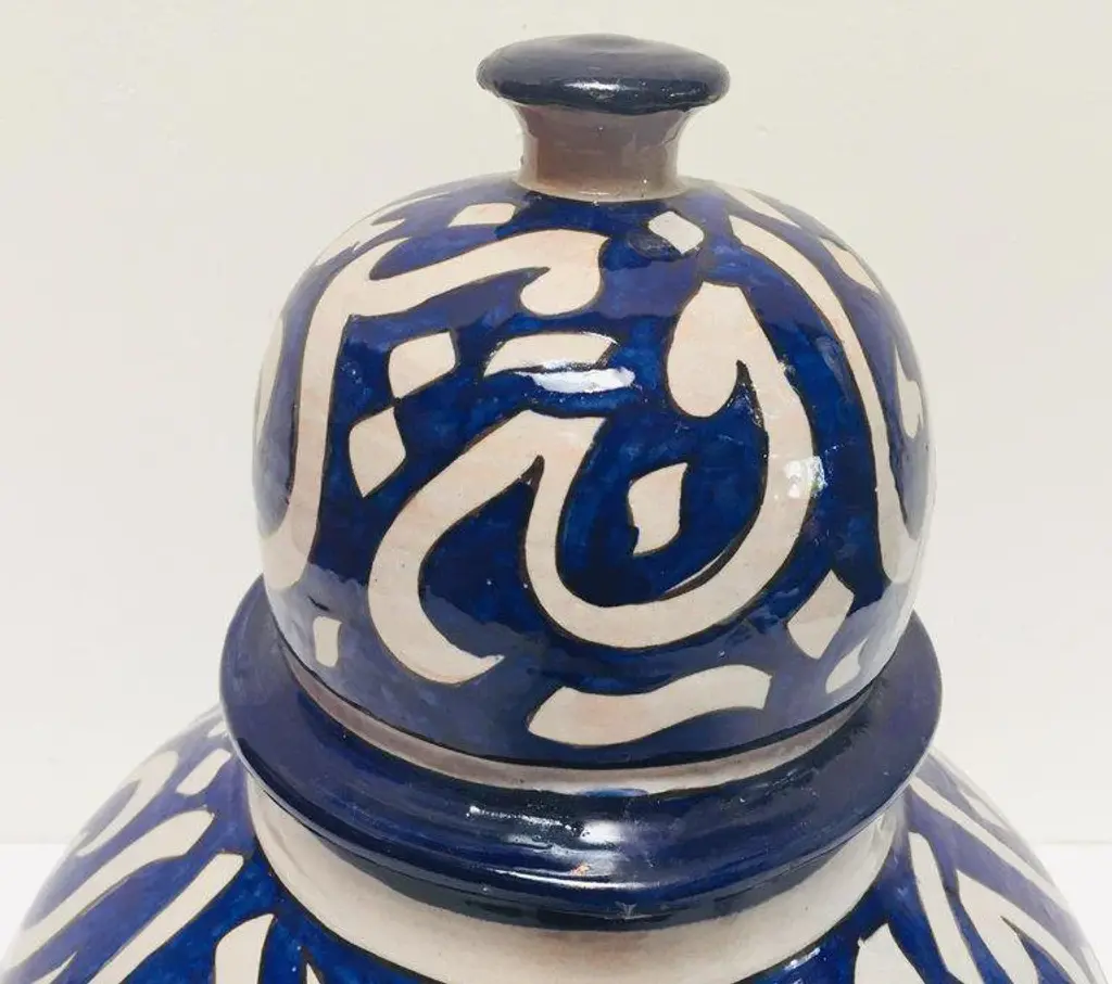 Large Moroccan glazed ceramic urn with lid from Fez. Moorish style ceramic handcrafted and hand painted with Arabic calligraphy writing. This kind of art writing looks calligraphic is called Lettrism, it is a form of art that uses letters that are not supposed to mean anything, just put together as Decorative Art. It is just about the beauty of the Arabic letters writing. Royal blue and ivory color writing design. Large size: 20 in. height x 14 in. diameter. Handcrafted in Fez, Morocco. Signed in the bottom: Fez.
