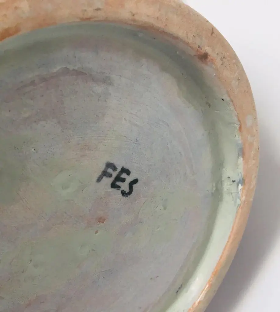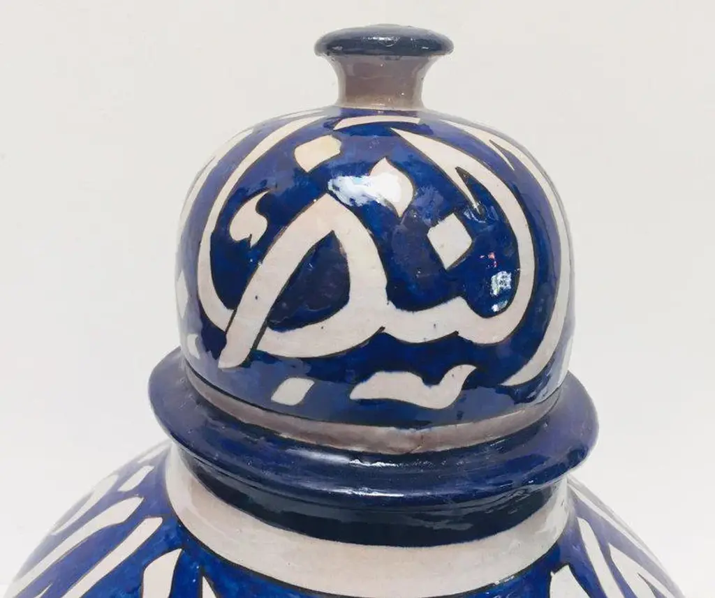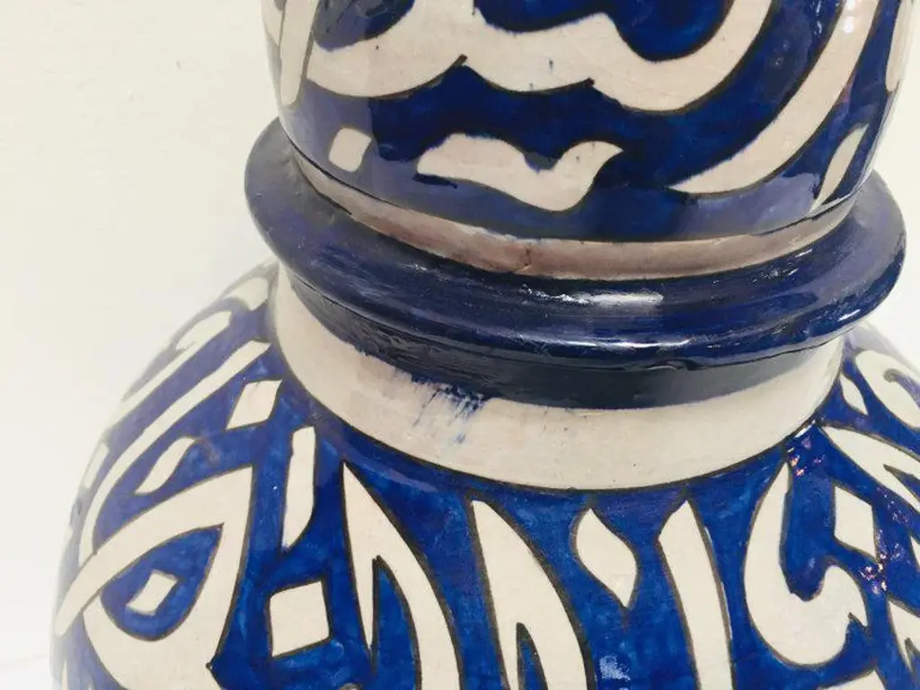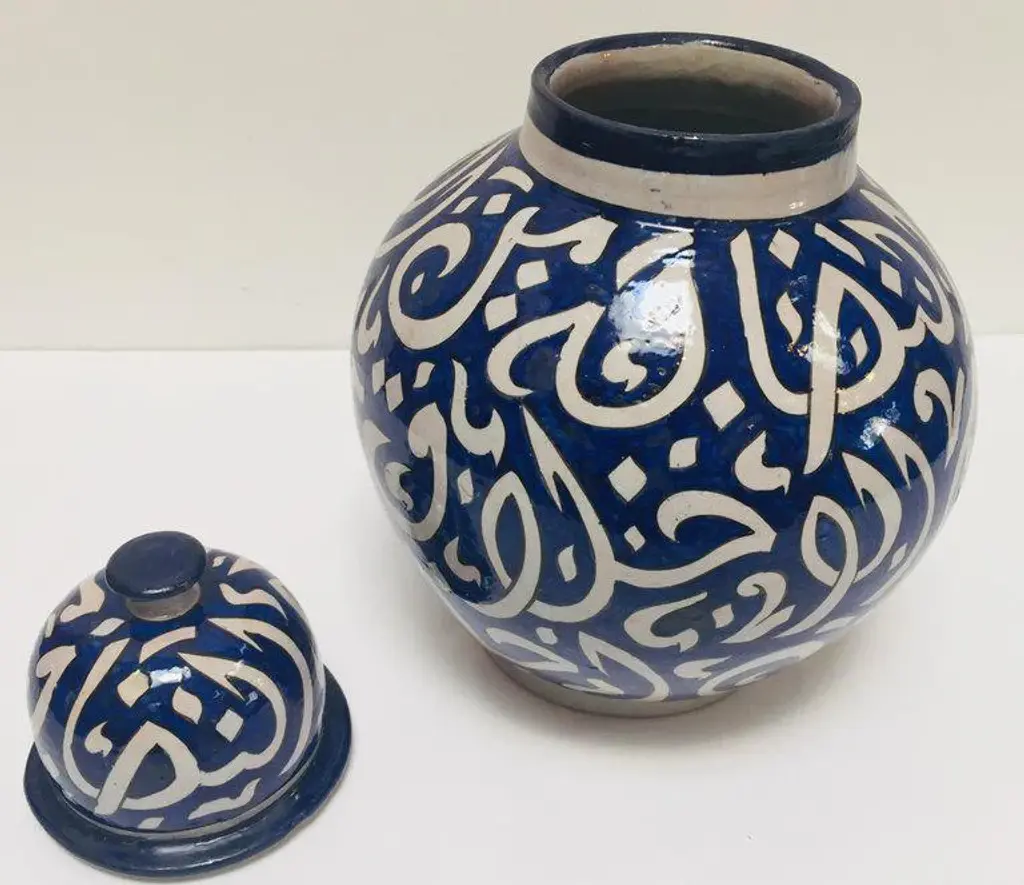 Large Moroccan glazed ceramic urn with lid from Fez. Moorish style ceramic handcrafted and hand painted with Arabic calligraphy writing. This kind of art writing looks calligraphic is called Lettrism, it is a form of art that uses letters that are not supposed to mean anything, just put together as Decorative Art. It is just about the beauty of the Arabic letters writing. Royal blue and ivory color writing design. Large size: 20 in. height x 14 in. diameter. Handcrafted in Fez, Morocco. Signed in the bottom: Fez.