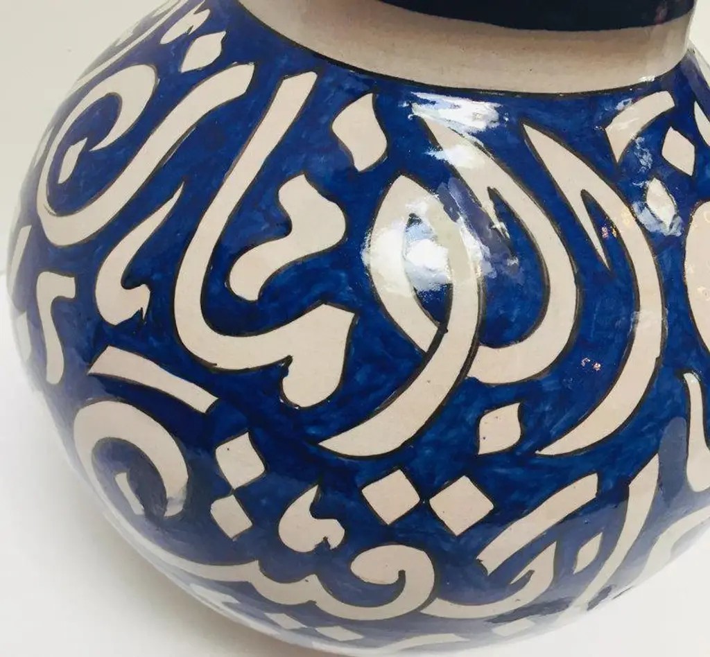 Moroccan Ceramic Blue Urn From Fez With Arabic Calligraphy