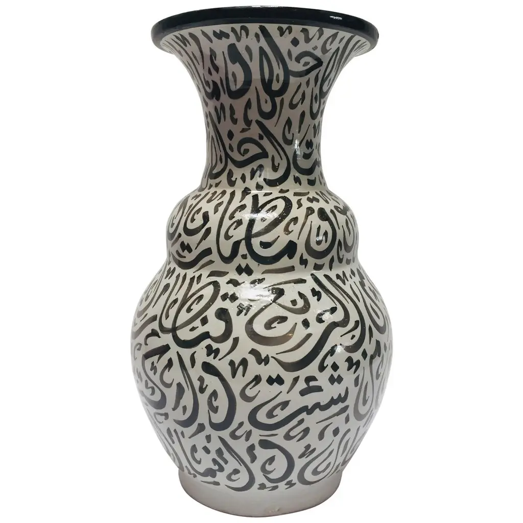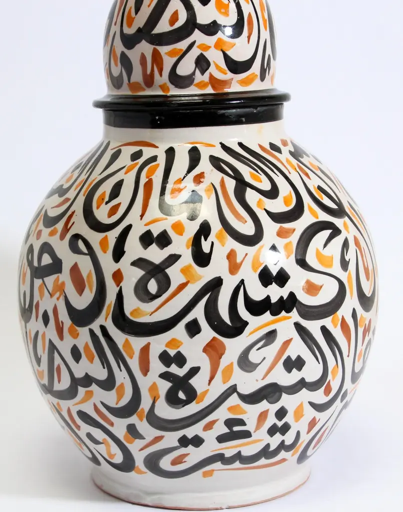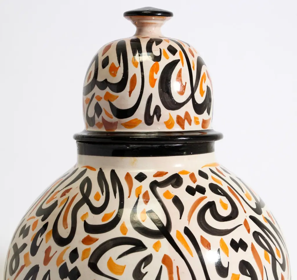 Large Moroccan glazed ceramic urn with lid from Fez.Moorish style ceramic handcrafted and hand painted with Arabic calligraphy writing.This kind of Art Writing looks calligraphic is called Lettrism, it is a form of art that uses letters that are not supposed to mean anything, just put together as decorative art.It is just about the beauty of the Arabic letters writing.Black, white and orange colors writing design on ivory color background.Large size: 20 in. height x 14 in. diameter.Handcrafted in Fez, Morocco.Signed in the bottom: Fez.
