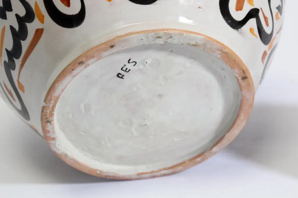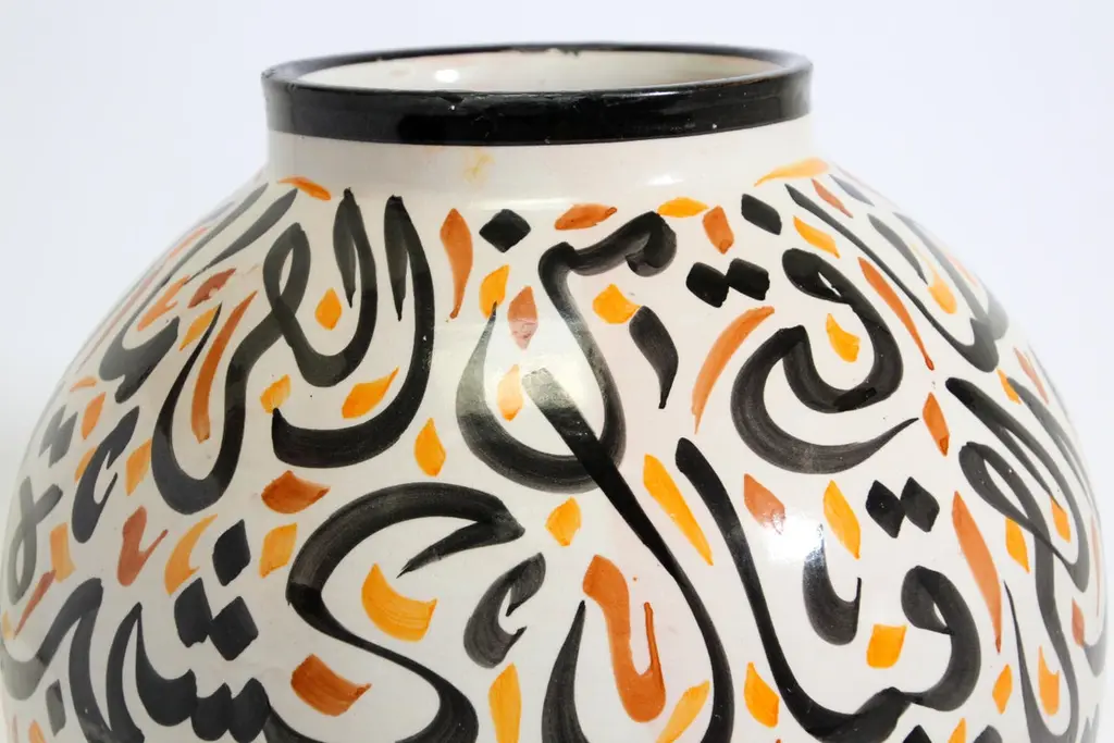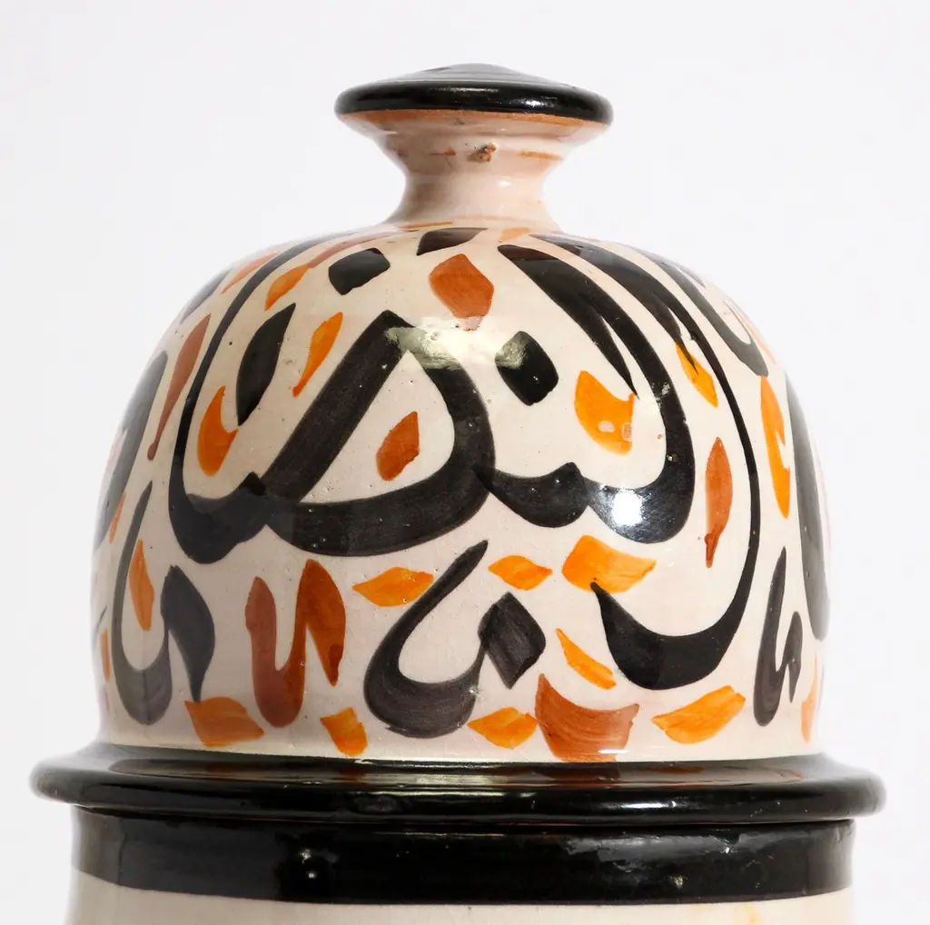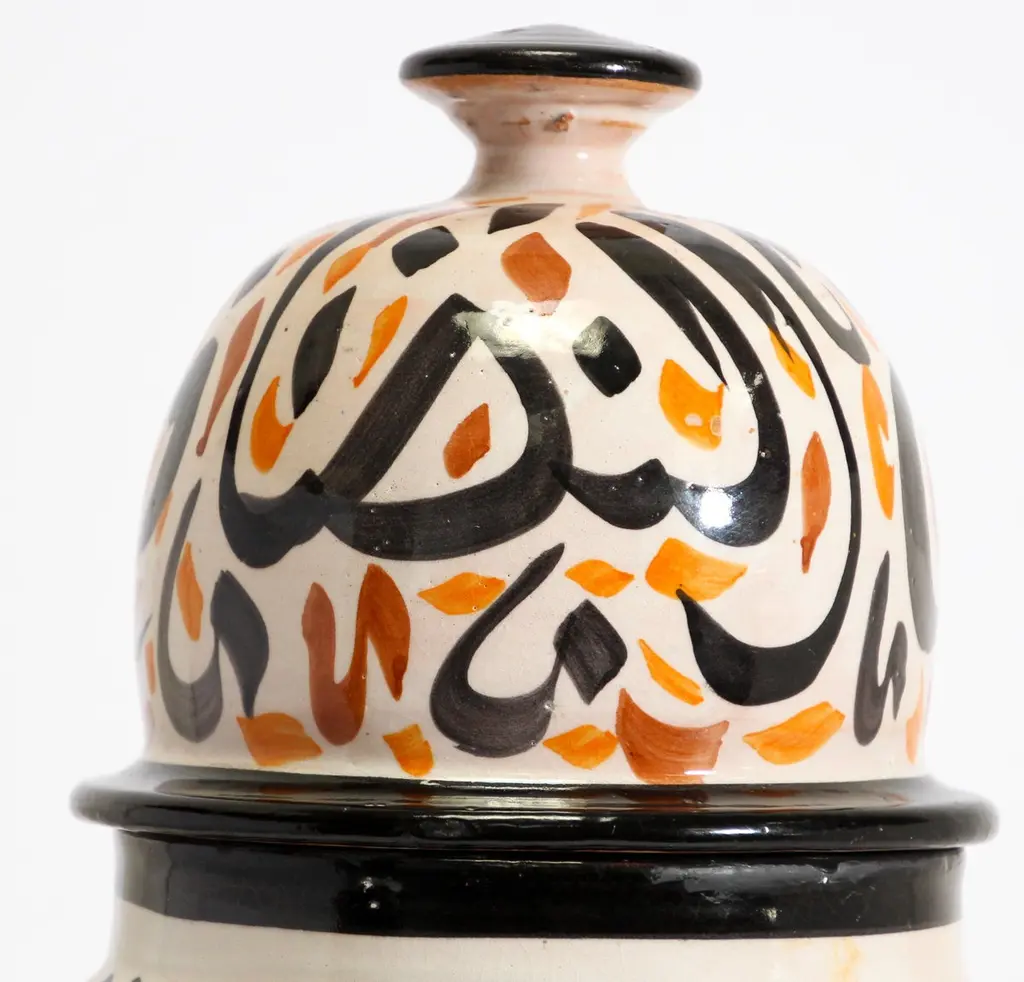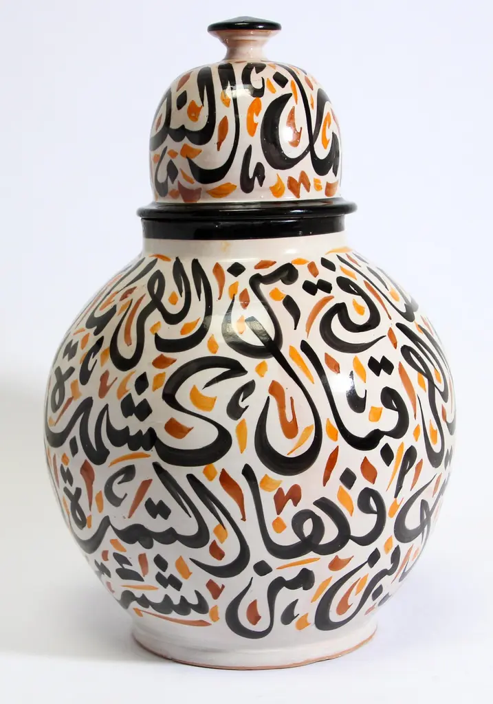 Moroccan Ceramic Lidded Urn With Arabic Calligraphy Lettrism Writing
