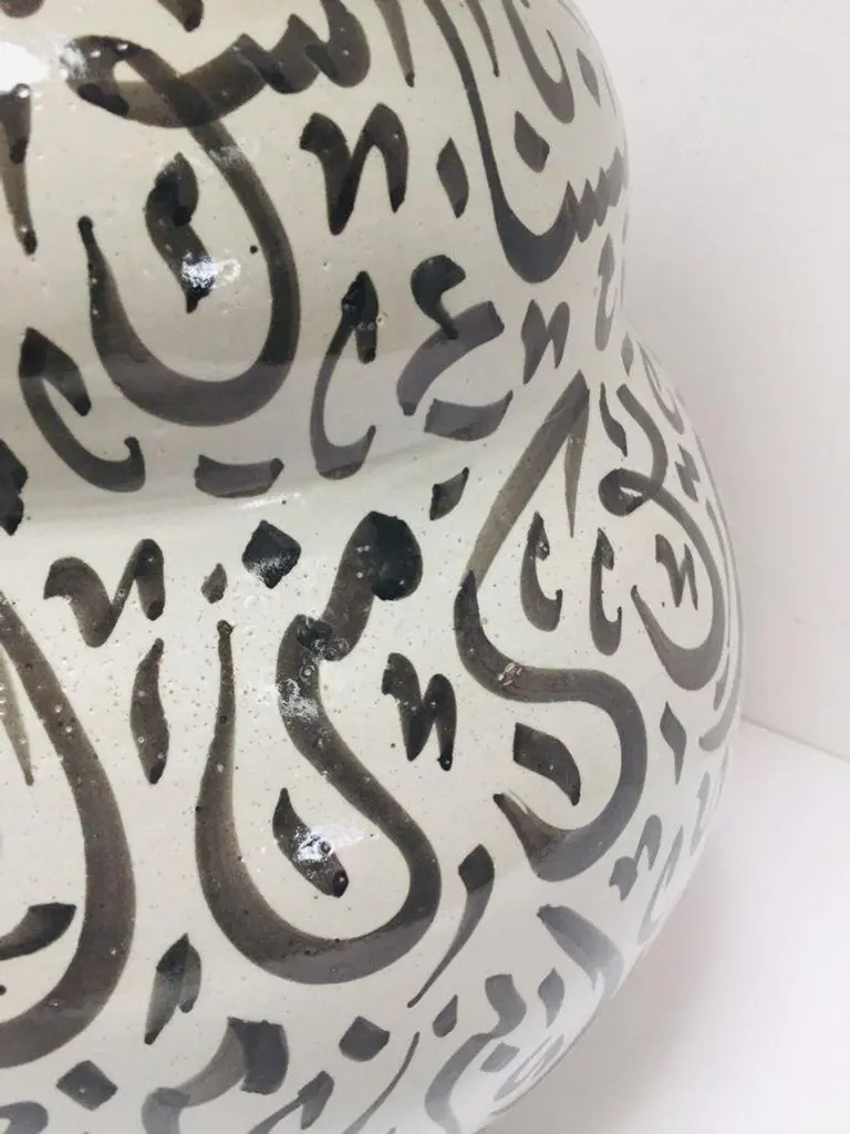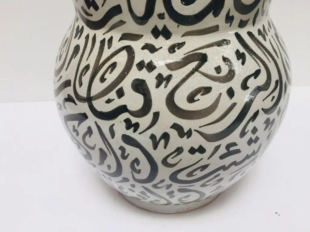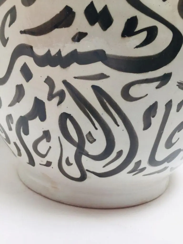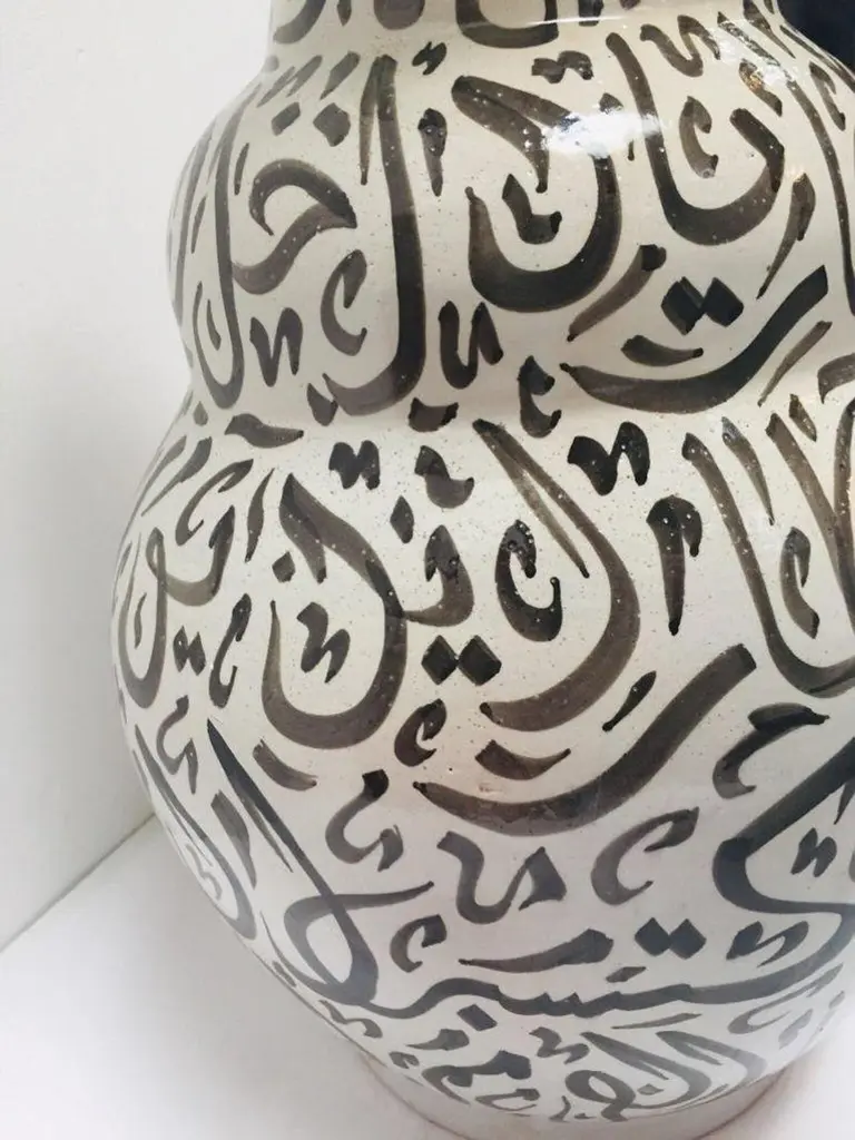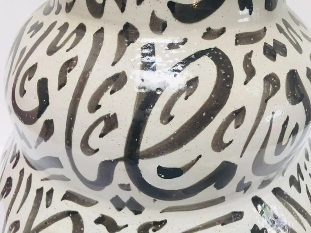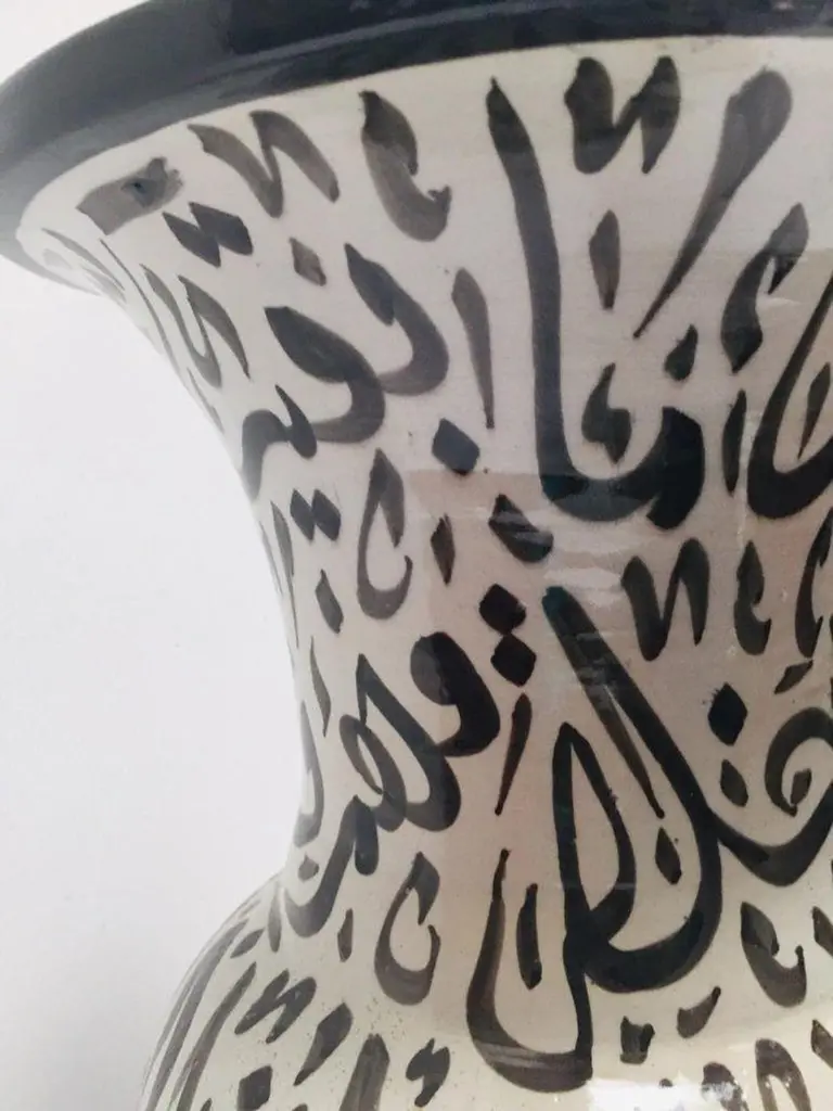 Large Moroccan glazed ceramic vase from Fez.Moorish Granada style ceramic handcrafted and hand painted with Arabic calligraphy writing.This kind of art writing looks calligraphic is called Lettrism, it is a form of art that uses letters that are not supposed to mean anything, just put together as Decorative Art.Black color writing design on ivory color background.A pair is available price is for 1.Large size: 23.5 in. height x 15 in. diameterDiameter mouth opening is 11 in.Granada Alhambra Islamic Moorish style design on ceramic.