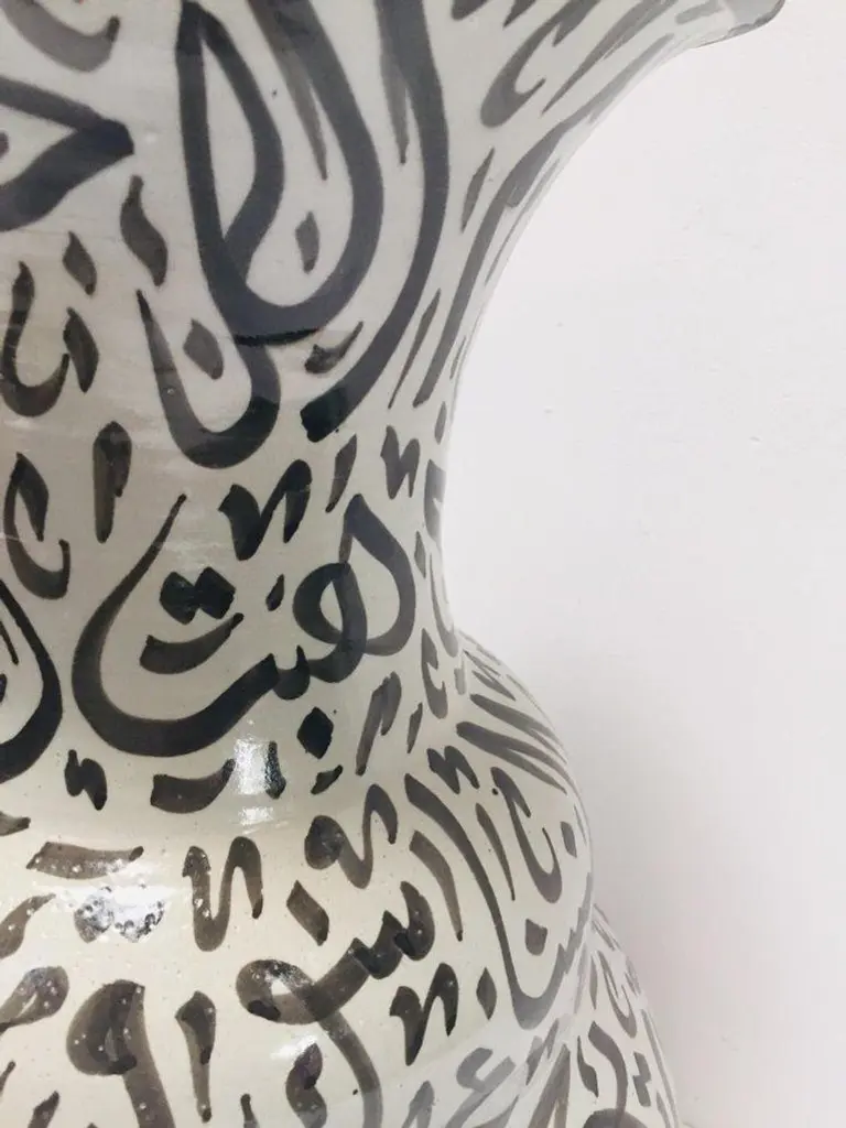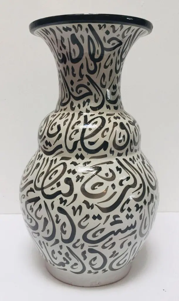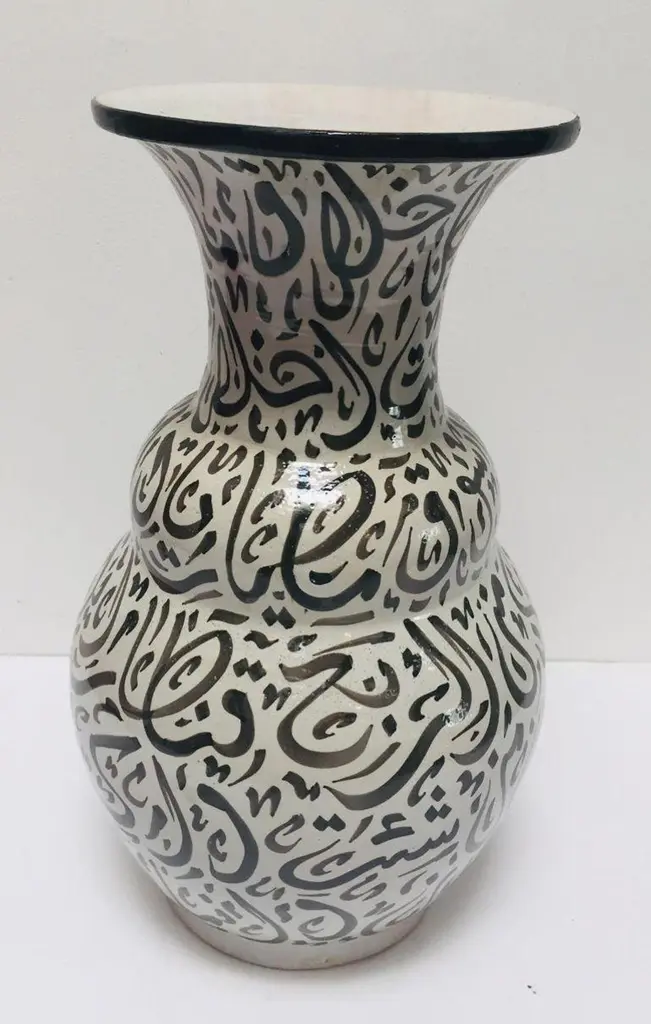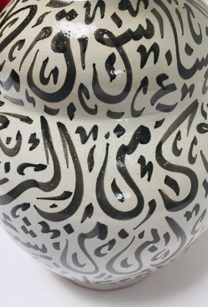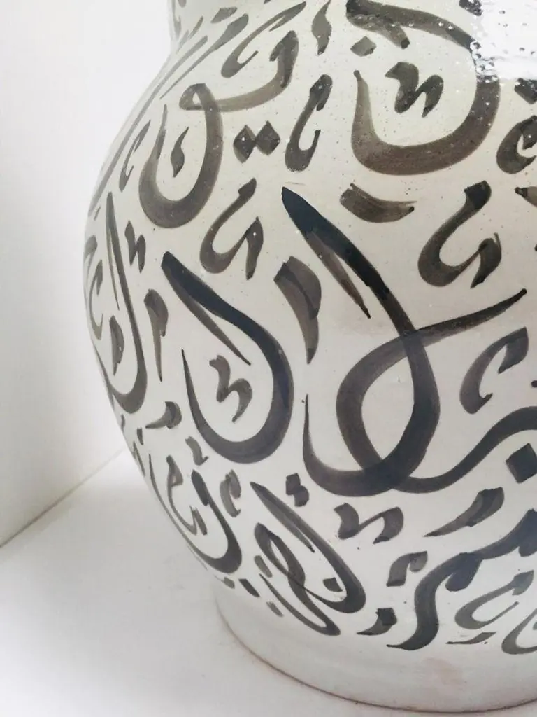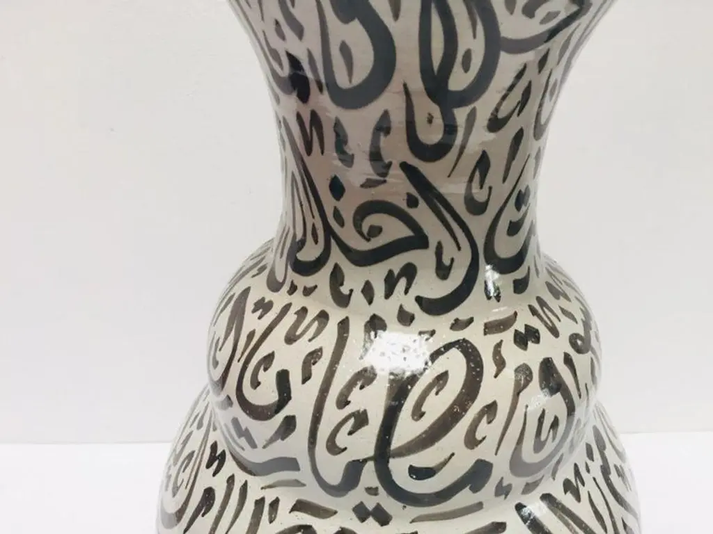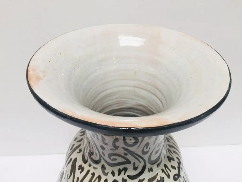 Large Moroccan glazed ceramic vase from Fez.Moorish Granada style ceramic handcrafted and hand painted with Arabic calligraphy writing.This kind of art writing looks calligraphic is called Lettrism, it is a form of art that uses letters that are not supposed to mean anything, just put together as Decorative Art.Black color writing design on ivory color background.A pair is available price is for 1.Large size: 23.5 in. height x 15 in. diameterDiameter mouth opening is 11 in.Granada Alhambra Islamic Moorish style design on ceramic.