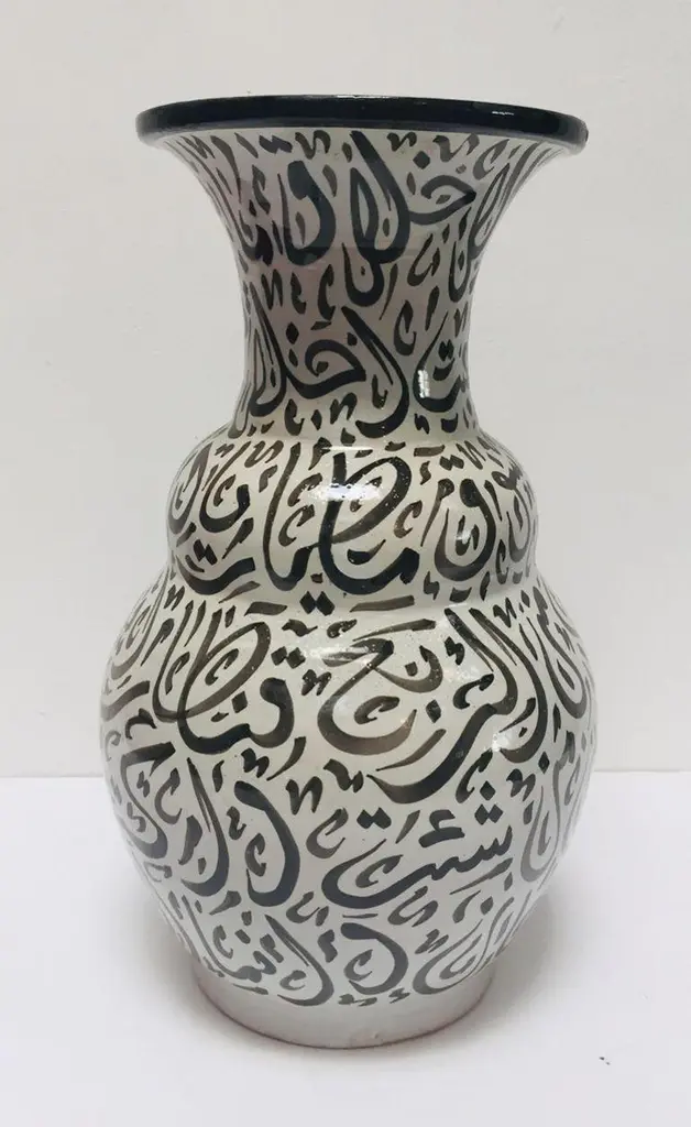 Moroccan Ceramic Vase With Arabic Black Calligraphy Writing Moorish Glazed Fez