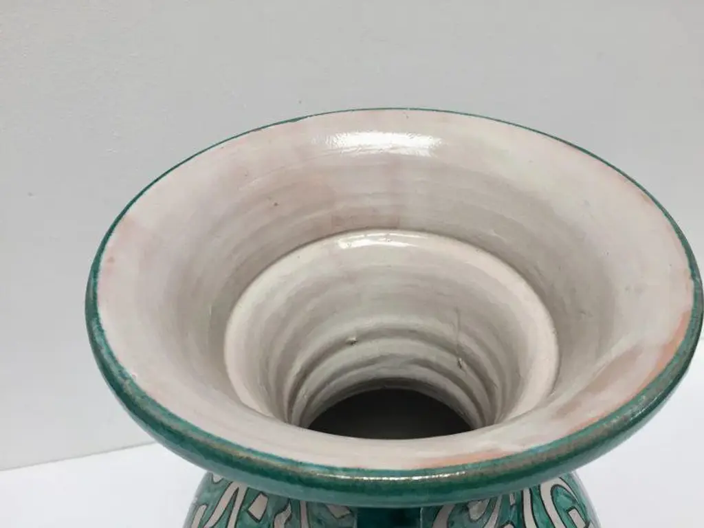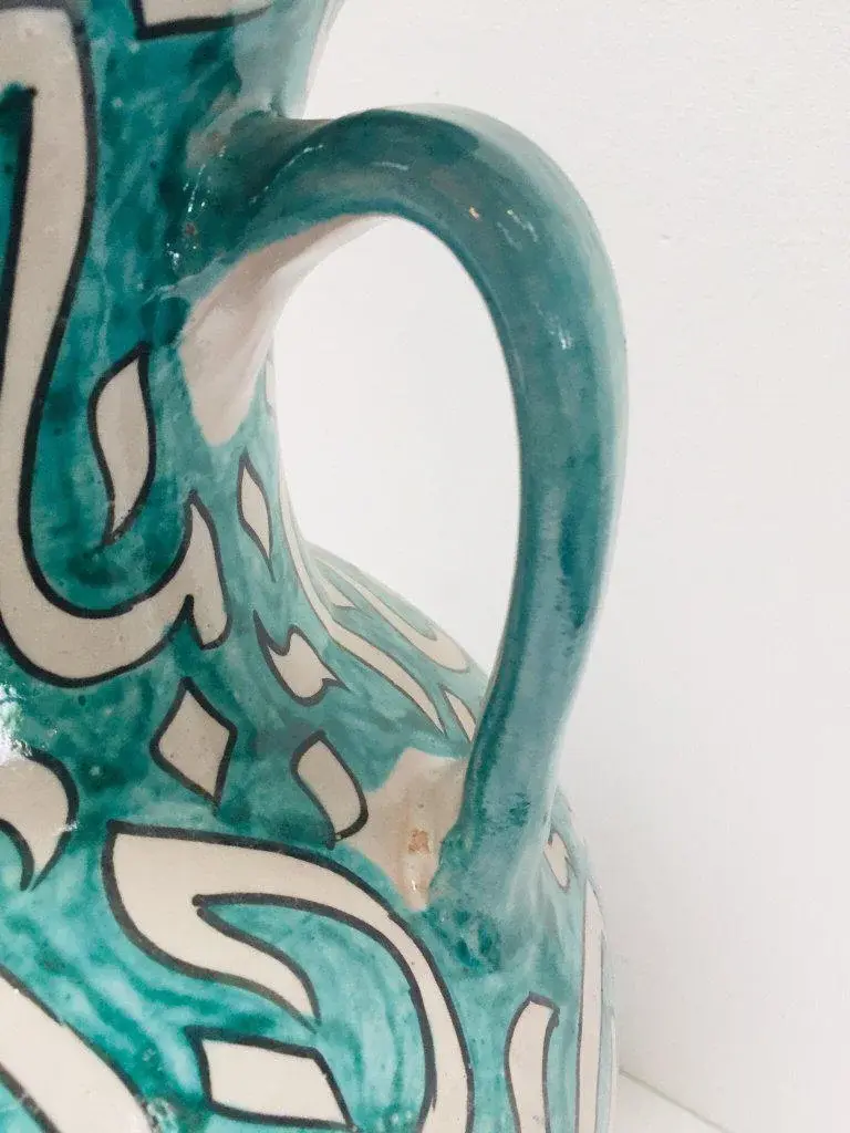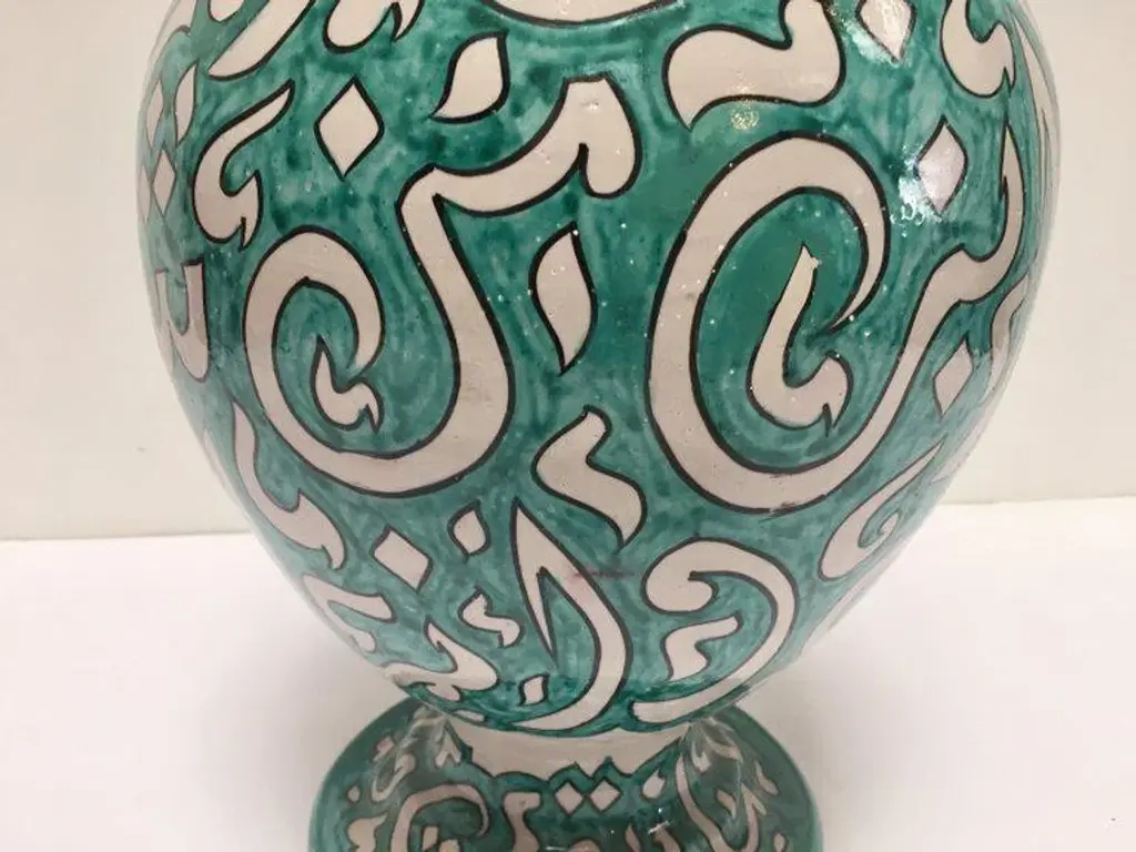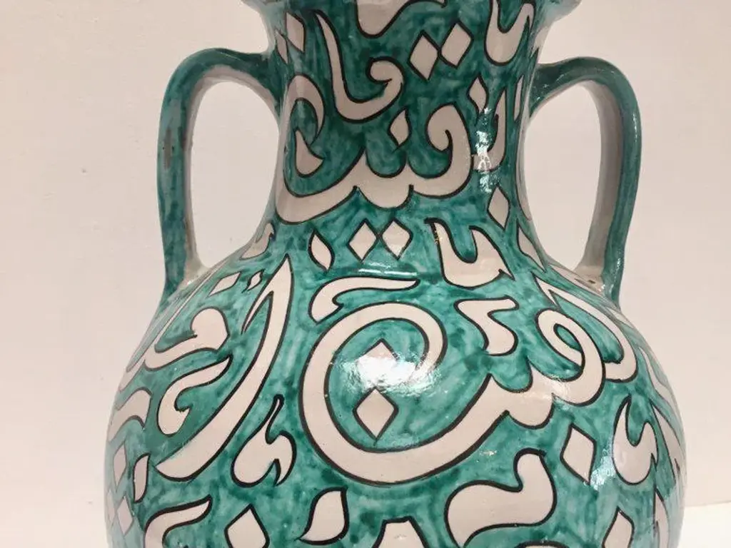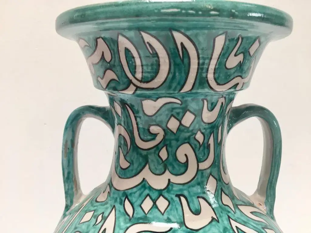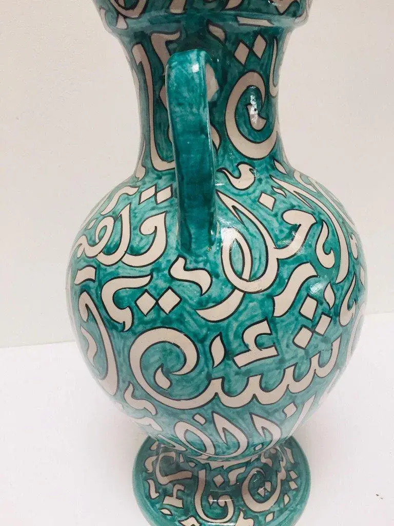 Large Moroccan glazed ceramic vase from Fez. Moorish style ceramic handcrafted and hand painted with Arabic calligraphy writing. This kind of Art Writing looks calligraphic is called Lettrism, it is a form of art that uses letters that are not supposed to mean anything, just put together as Decorative Art. Turquoise color writing design on ivory color background. A pair is available price is for 1. Large size: 23in. height x 14 in. diameter. Diameter mouth opening is 10 in.
