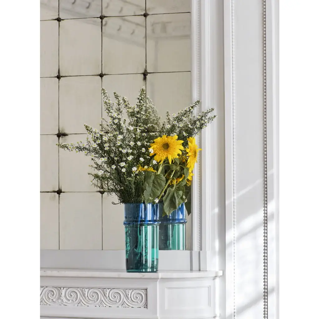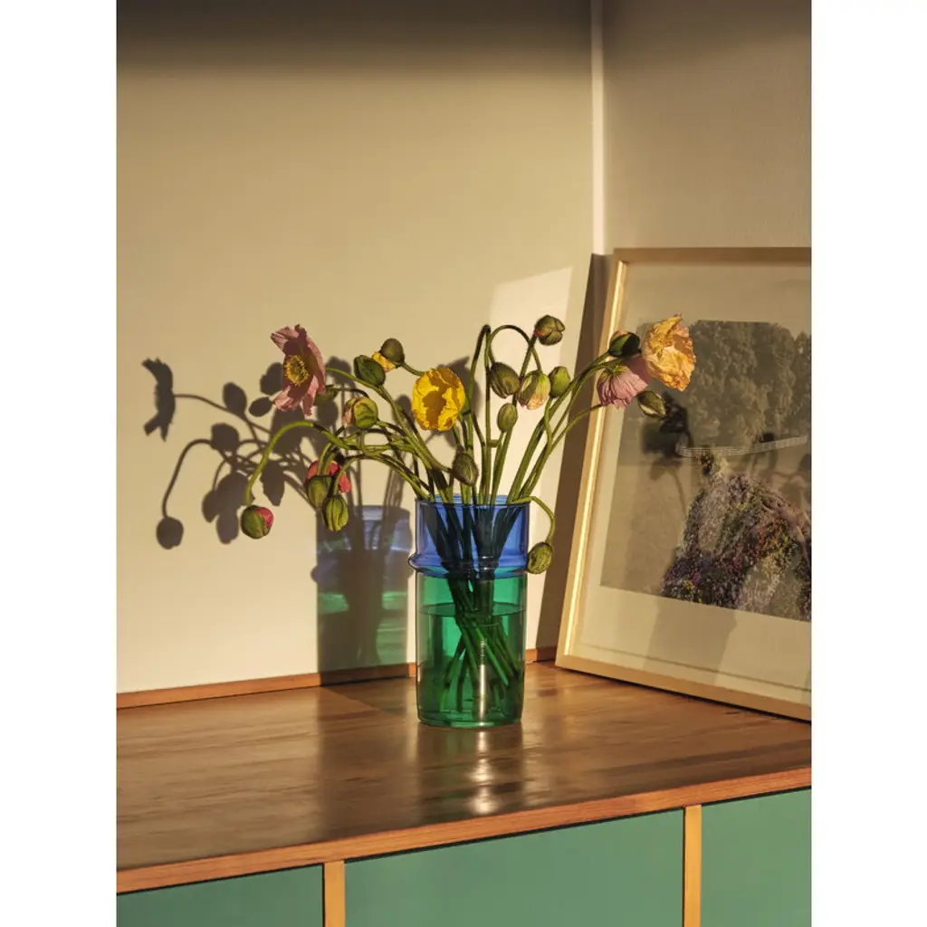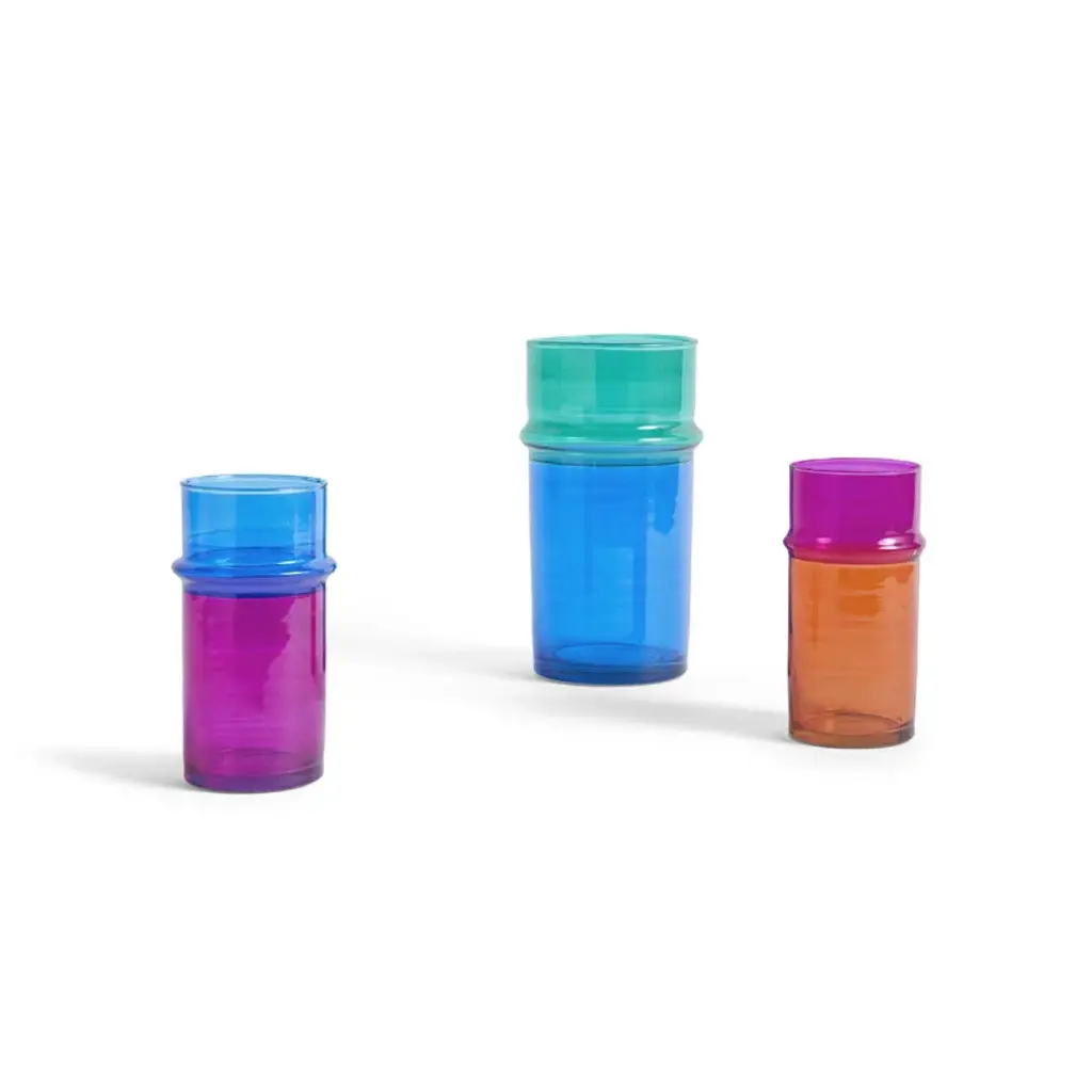 HAY’s Moroccan vase gives an extra pop of color for flower bouquets and branches. Featuring a cylinder shape with a thicker ring on its side, the vase plays with the contrasts of boldly colored glass surfaces. The vase has been mouth-blown in Morocco from recycled glass.