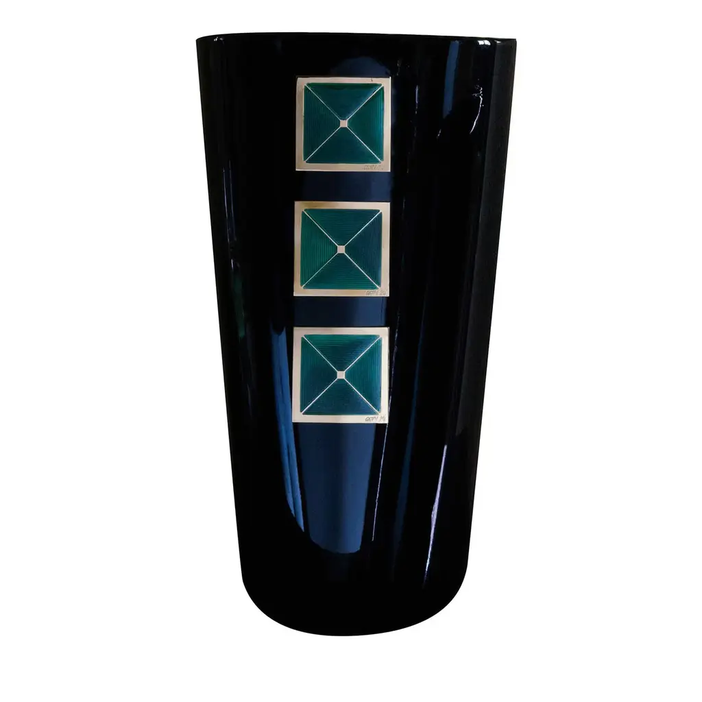 This stunning vase mouth-blown from black Murano crystal is an original artwork signed by artist Carlo Moretti that is sure to make a statement in luxe modern homes. The smooth and glossy silhouette features an oval profile and is splendidly adorned with shimmering squares in pure gold leaf that is applied to the crystal while still hot.