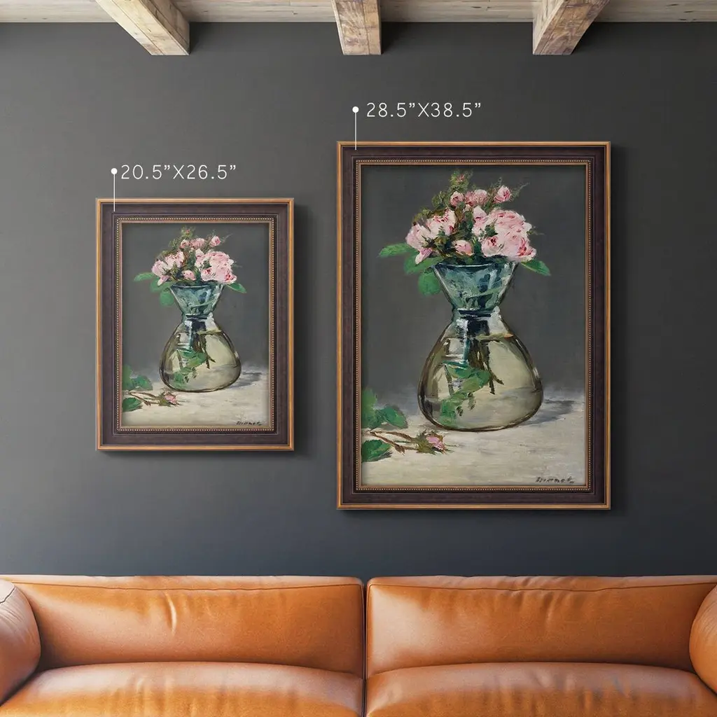 Moss Roses in a Vase Premium Framed Canvas- Ready to Hang A Premium Framed Canvas created to last. Framed in distressed wood and available in an array of sizes and colors Featuring a beveled a solid wood stretcher bar, each piece comes ready to hand 3 SIZES AVAILABLE 16''X20'' - Overall Size 18'X27'' - Overall Size 24''x36'' - Overall Size Each piece is made to order. Each piece comes with hanging hardware. Made in the USA Ready to Hang Giclee Paper Print Acrylic Glass Beveled Matt Board