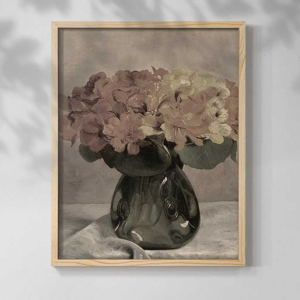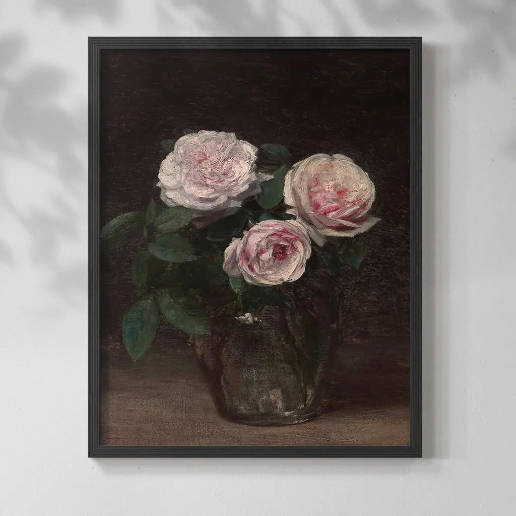 Moss Roses in a Vase Premium Framed Canvas- Ready to Hang A Premium Framed Canvas created to last. Framed in distressed wood and available in an array of sizes and colors Featuring a beveled a solid wood stretcher bar, each piece comes ready to hand 3 SIZES AVAILABLE 16''X20'' - Overall Size 18'X27'' - Overall Size 24''x36'' - Overall Size Each piece is made to order. Each piece comes with hanging hardware. Made in the USA Ready to Hang Giclee Paper Print Acrylic Glass Beveled Matt Board
