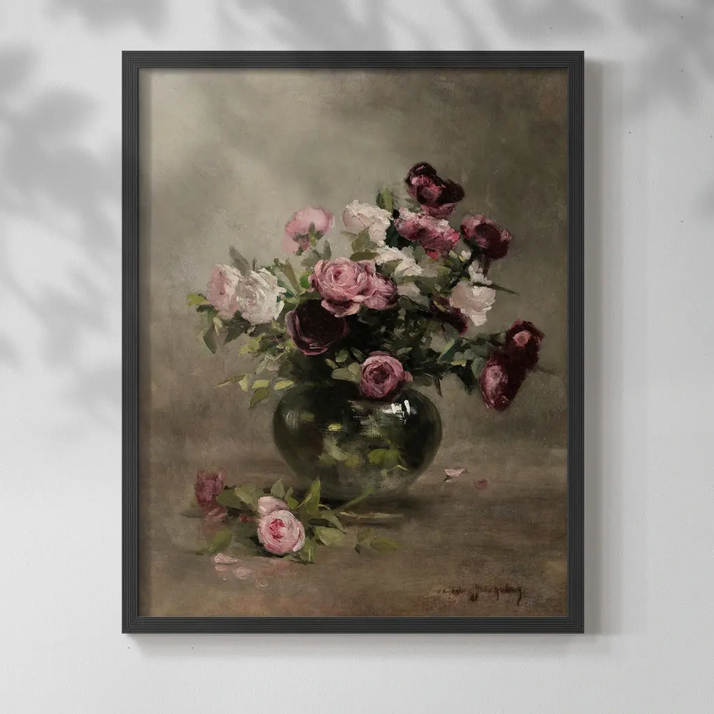 Moss Roses In A Vase Premium Framed Canvas- Ready To Hang - 18x27 - Silver