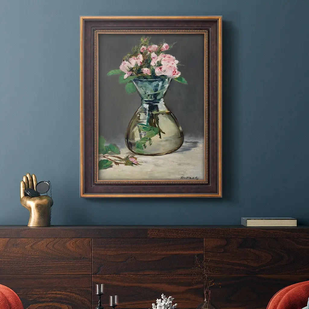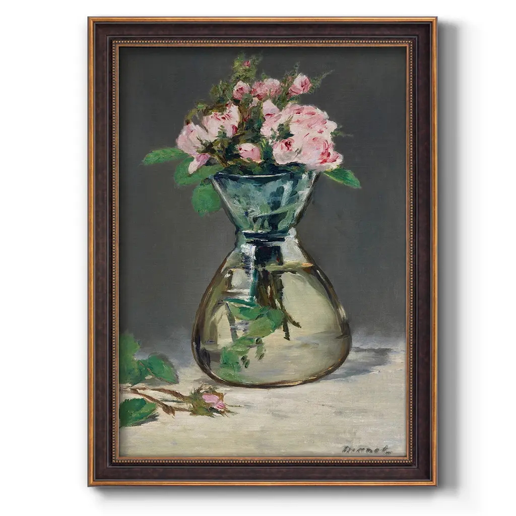 Moss Roses in a Vase Premium Framed Canvas- Ready to Hang A Premium Framed Canvas created to last. Framed in distressed wood and available in an array of sizes and colors Featuring a beveled a solid wood stretcher bar, each piece comes ready to hand 3 SIZES AVAILABLE 16''X20'' - Overall Size 18'X27'' - Overall Size 24''x36'' - Overall Size Each piece is made to order. Each piece comes with hanging hardware. Made in the USA Ready to Hang Giclee Paper Print Acrylic Glass Beveled Matt Board