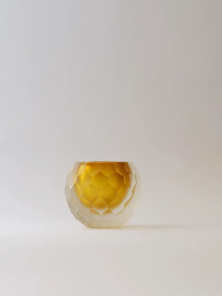 Bold yet graceful, the Large Murano Colored Glass Sphere Vase with Honeycomb Detail – Golden Amber Core is a sculptural statement that merges timeless craftsmanship with modern form. Hand-blown in Murano, this rounded glass vase showcases a radiant amber core enveloped in a satin-frosted outer layer. Its surface is intricately carved with geometric honeycomb facets that catch and refract light, adding dimension and texture to the glowing interior. This piece makes a captivating focal point for any refined or design-forward space.