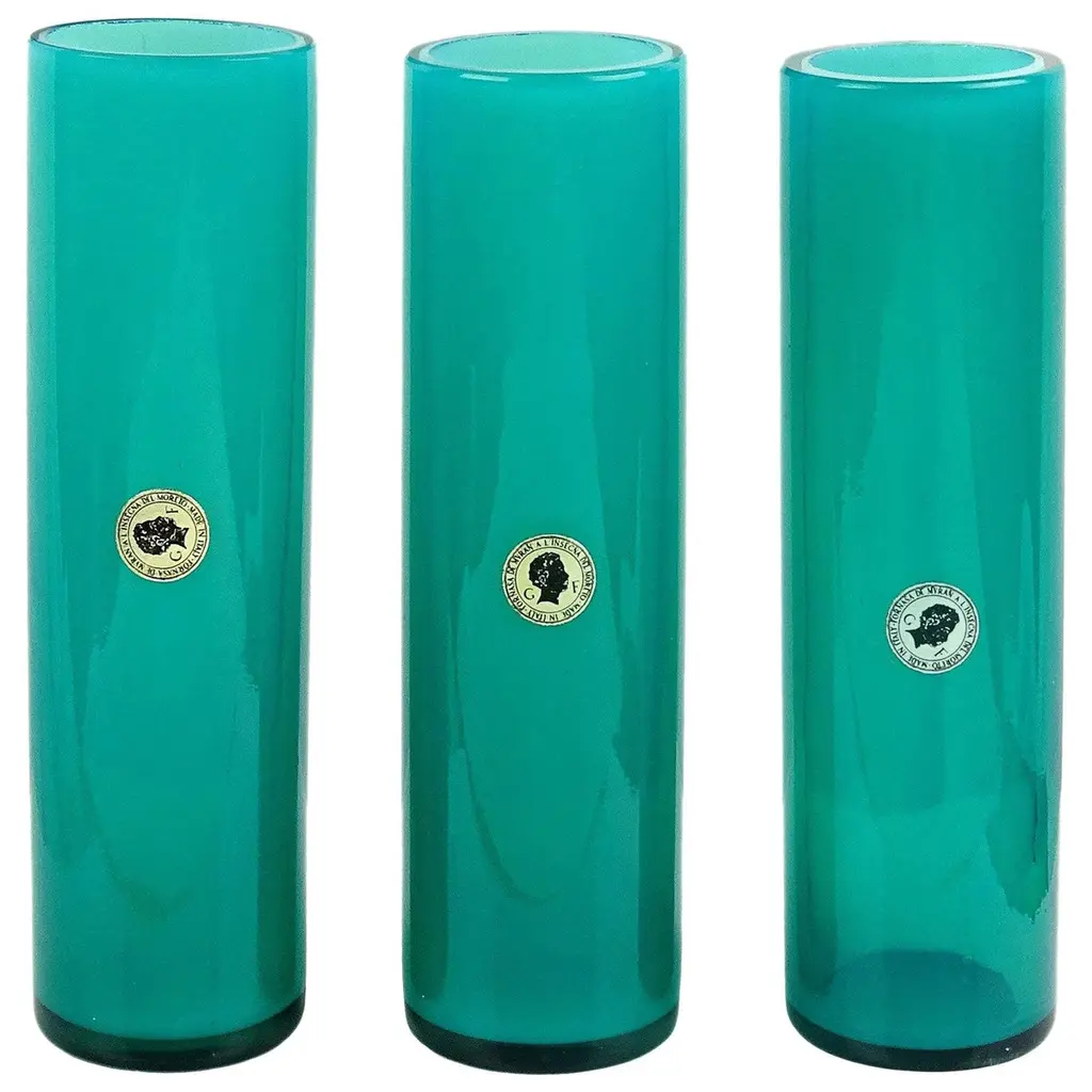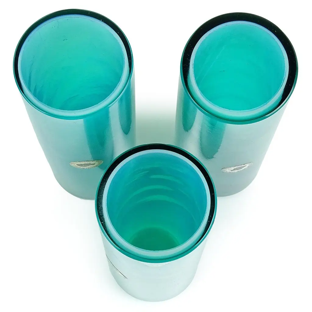 Priced Per Vase (3 vases available). Beautiful vintage Murano hand blown teal blue over opalescent white Italian art glass flower vase. Documented to the designer Galliano Ferro for the Fornasa De Murano A L'Insegna Del Moreto company. The original and intact label is still attached to the side of the vase. It has a cylinder shape, with thinner and more transparent outer color layer. It has a polished flat rim. Would make a great display piece on any desk, coffee table or vanity. Late Mid-century era. If you have a preference on a vase, just let me know which one you would like. The vases measure from 9" tall to 8 3/4" tall.