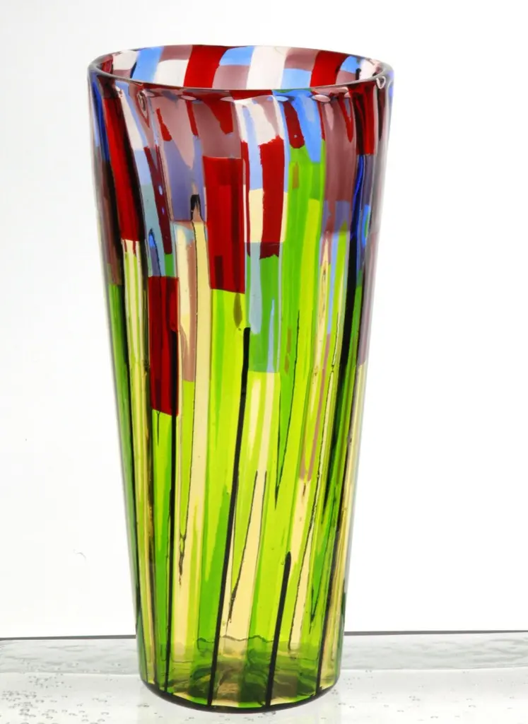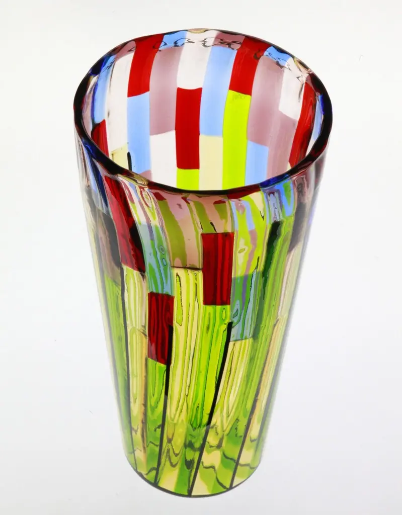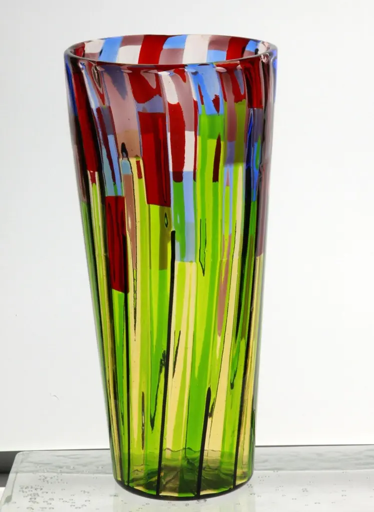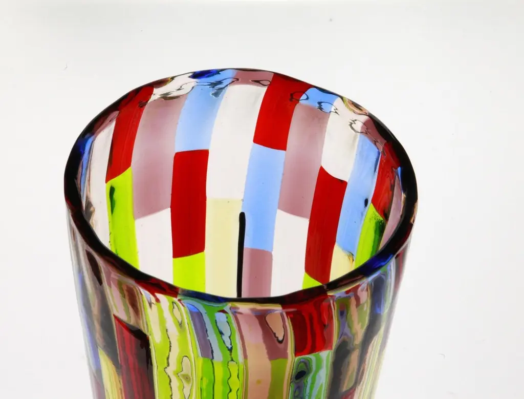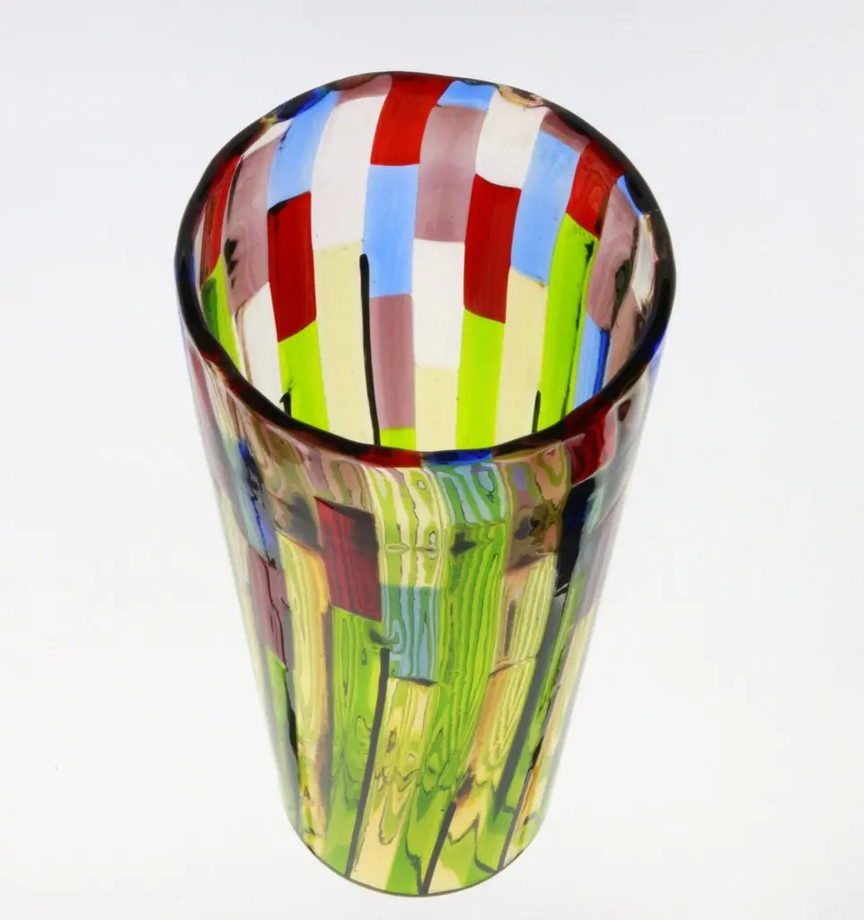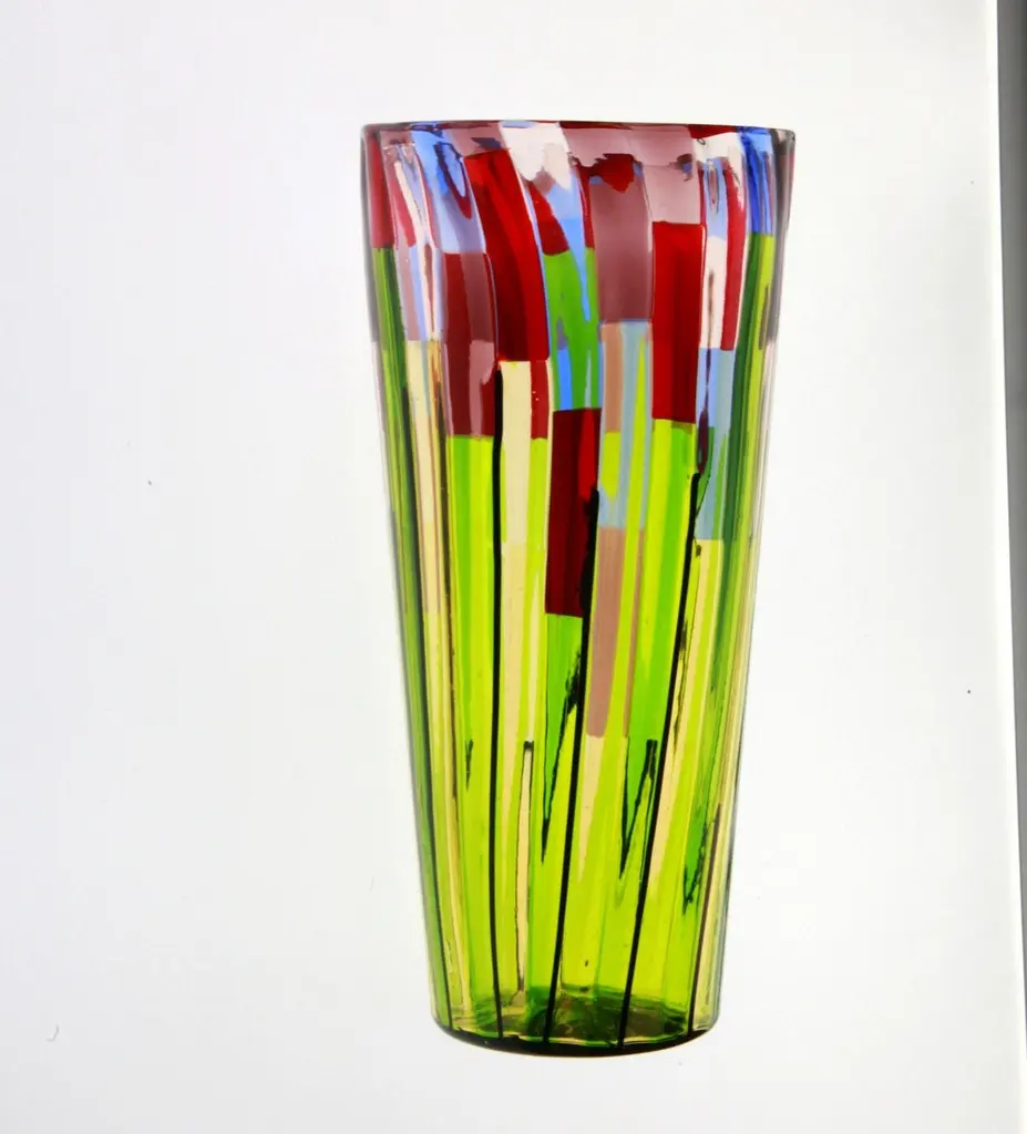 The vase made with the same technique of the tumblers in another listing.After the success of the tumbler group, I asked the maestro to make a vase that would keep the design and the beauty of the finish. It came out a gem.About the finish: The original name is Campo fiorito con papaveri e lavanda. I designed this at the turn of the millennium for Nancy and Robert Frehling of Oggetti. I was experimenting with the piera working. This was used by the greatest glass designer. Gio Ponti did the straight canes "a canne" at Venini, Ercole Barovier worked on patching triangular pieces in the "Tessere" and Fulvio Bianconi with square elements in the "Pezzati" for Venini. Many glass makers did their version, Orlando Zennaro, almost unknown today, I considered the best.I sent to the maestro the design, with the lower part in straight canes ending at the top with pezzati. I asked him to slide in-between the canes a black small cane to mark the straw and the grass.I was so surprised that the tumbler was made. Bravissimo. Only one. I keep it as a trophy. So beautiful. It was a bit pricey for distribution so it was abandoned.I met the maestro in Murano after the acqua alta and we went back on memories and I told him I still have the Campo Fiorito tumbler. We agreed it is the right time to give to this design a second chance. Selling directly to the final consumer allows a reasonable price considering that each tumbler is a masterpiece of glass techniques and such a graceful piece.The lower part alternates Verde and Gaggia (bright yellow) with separation of a smalto nero mini cane. On the upper part there are pops of red, two amethyst, bluino and rose. It's a piera senza vetro, called roll up techniques where the glass is rolled up the pipe without a blob of glass. Each glass cane and element has to be perfectly fused to the next; this is called rimarginatura and then passed on the counter punty (pontello) and hand opened. Canes are not flattened and they keep a lens effect that makes a great play with light. Signed, this vase will no need flowers!Last photo shows the vase in proportion with the tumblers.