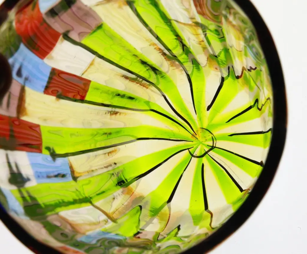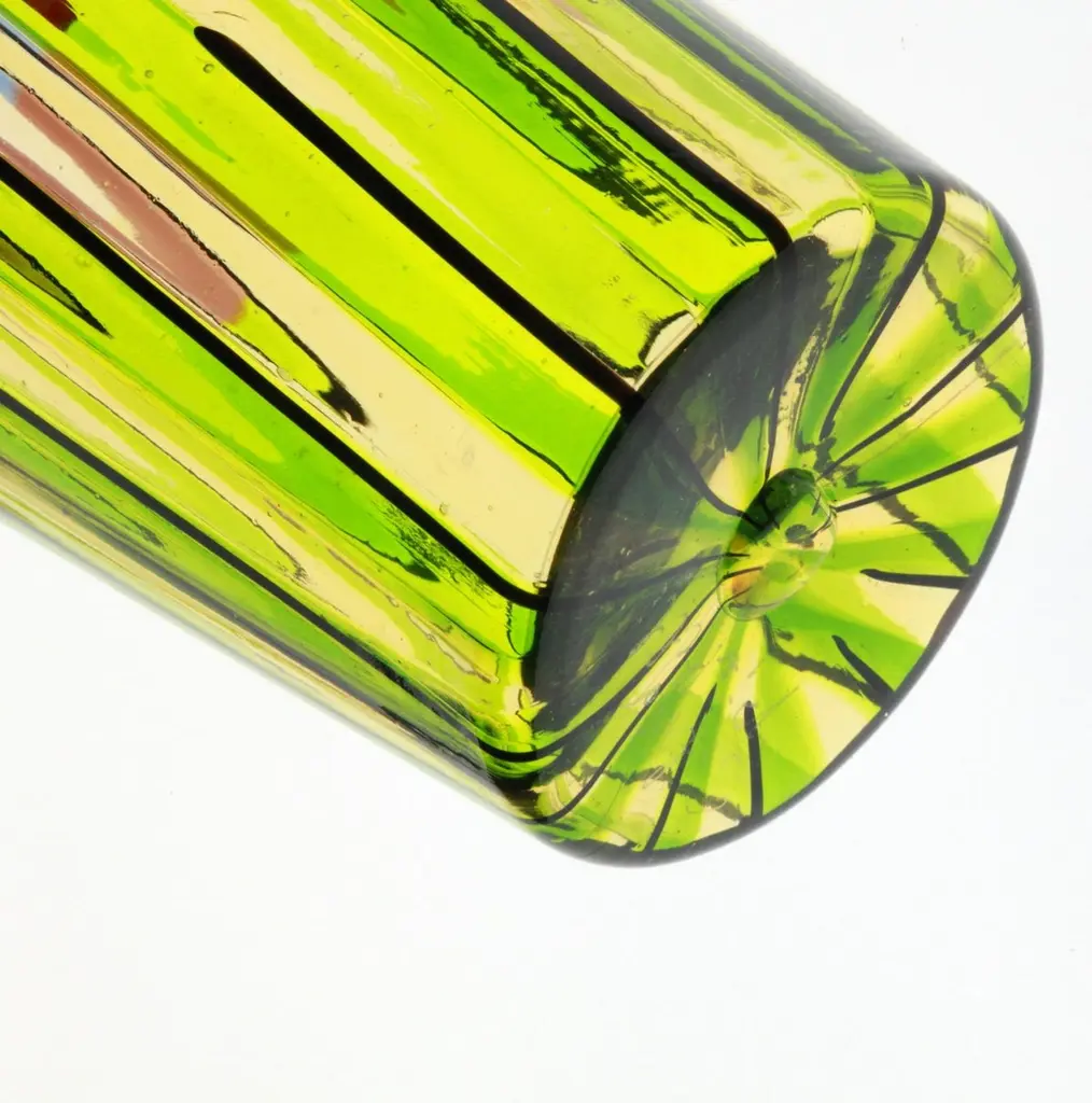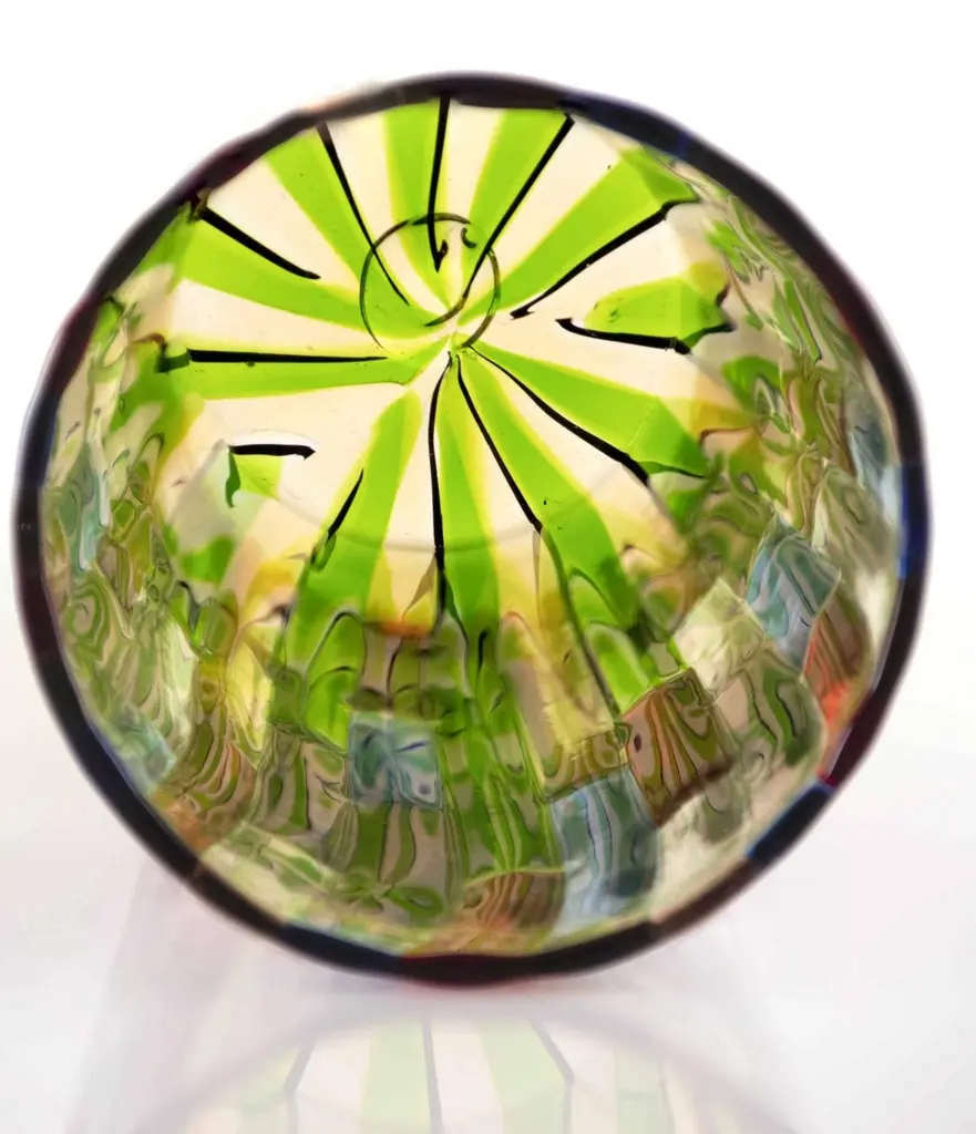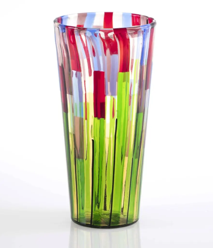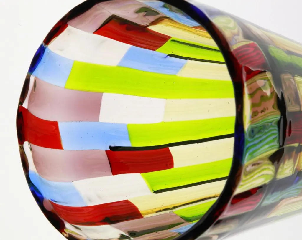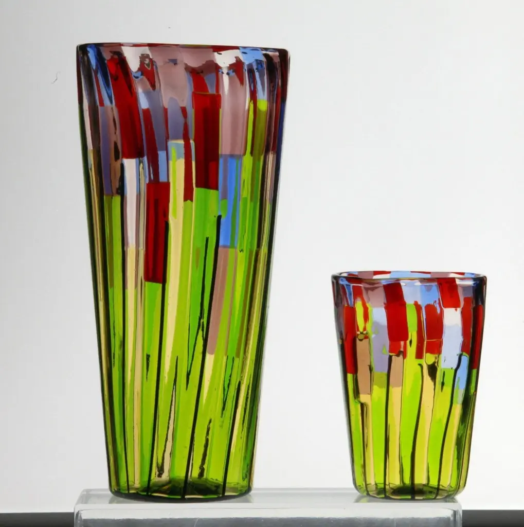The vase made with the same technique of the tumblers in another listing.After the success of the tumbler group, I asked the maestro to make a vase that would keep the design and the beauty of the finish. It came out a gem.About the finish: The original name is Campo fiorito con papaveri e lavanda. I designed this at the turn of the millennium for Nancy and Robert Frehling of Oggetti. I was experimenting with the piera working. This was used by the greatest glass designer. Gio Ponti did the straight canes "a canne" at Venini, Ercole Barovier worked on patching triangular pieces in the "Tessere" and Fulvio Bianconi with square elements in the "Pezzati" for Venini. Many glass makers did their version, Orlando Zennaro, almost unknown today, I considered the best.I sent to the maestro the design, with the lower part in straight canes ending at the top with pezzati. I asked him to slide in-between the canes a black small cane to mark the straw and the grass.I was so surprised that the tumbler was made. Bravissimo. Only one. I keep it as a trophy. So beautiful. It was a bit pricey for distribution so it was abandoned.I met the maestro in Murano after the acqua alta and we went back on memories and I told him I still have the Campo Fiorito tumbler. We agreed it is the right time to give to this design a second chance. Selling directly to the final consumer allows a reasonable price considering that each tumbler is a masterpiece of glass techniques and such a graceful piece.The lower part alternates Verde and Gaggia (bright yellow) with separation of a smalto nero mini cane. On the upper part there are pops of red, two amethyst, bluino and rose. It's a piera senza vetro, called roll up techniques where the glass is rolled up the pipe without a blob of glass. Each glass cane and element has to be perfectly fused to the next; this is called rimarginatura and then passed on the counter punty (pontello) and hand opened. Canes are not flattened and they keep a lens effect that makes a great play with light. Signed, this vase will no need flowers!Last photo shows the vase in proportion with the tumblers.