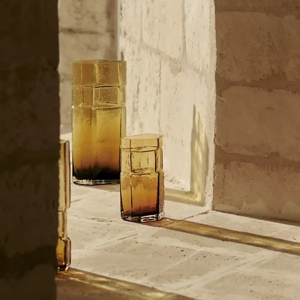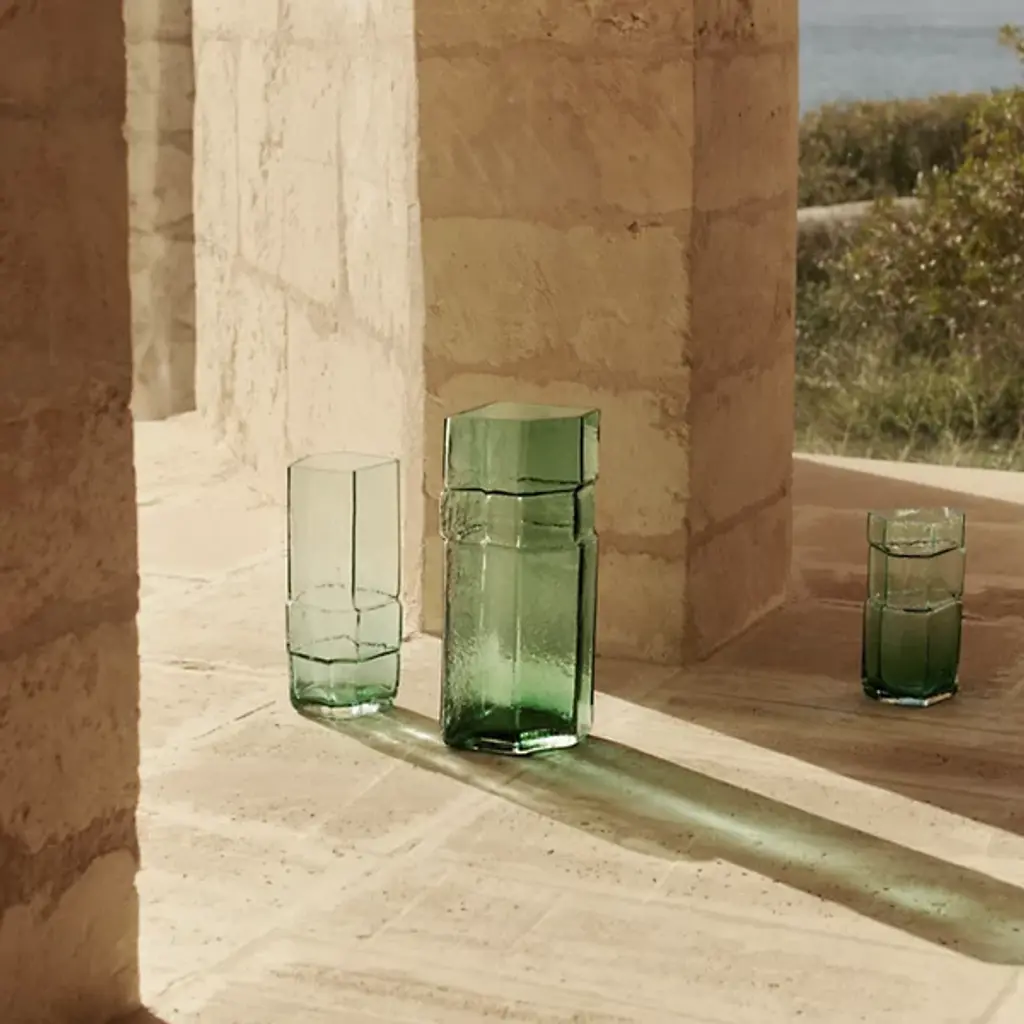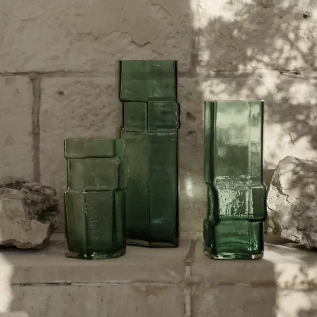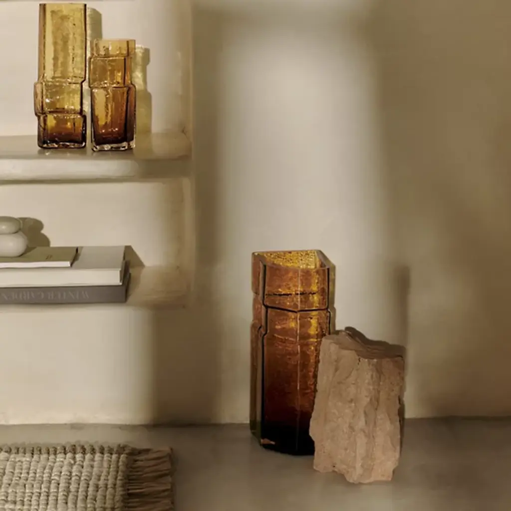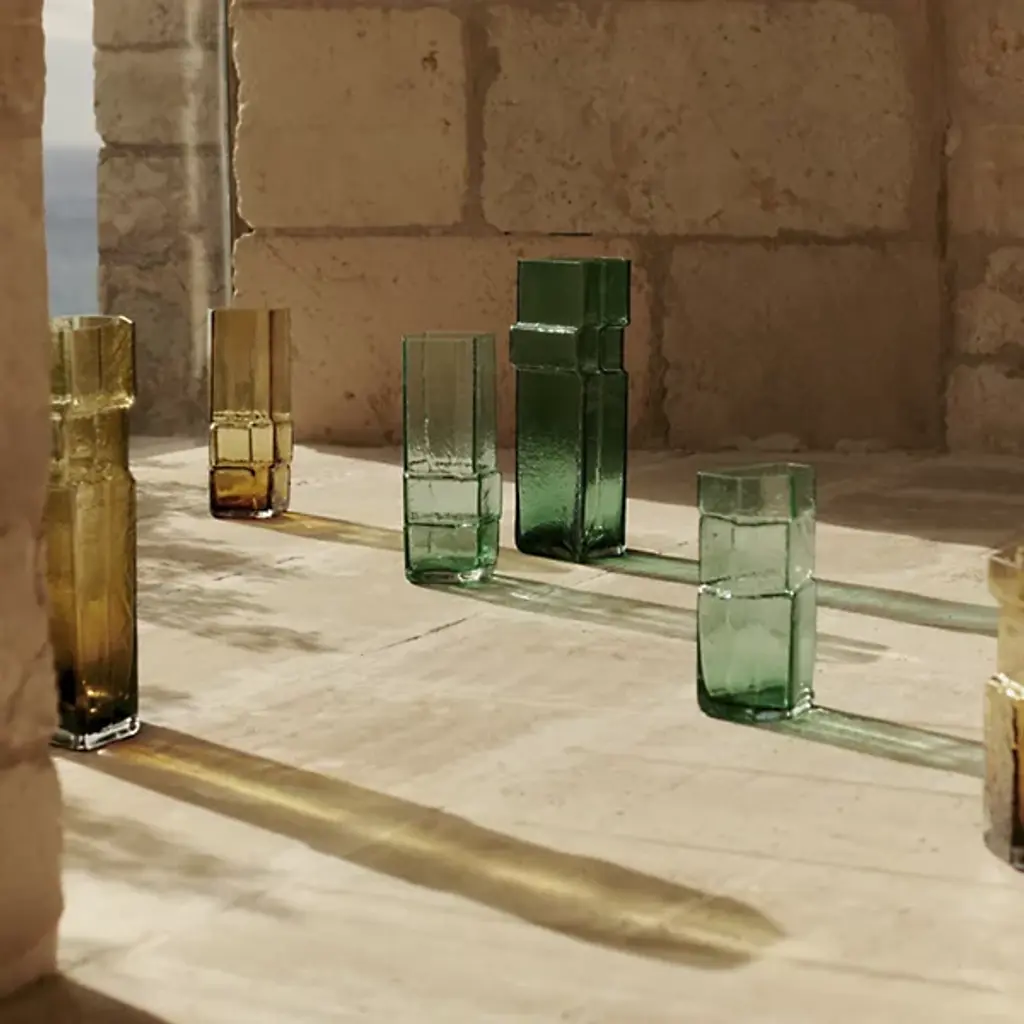 The Muro Vase from Ferm LIVING emerges from a collaboration with architect Jørn Utzon's legacy, taking its name from the Spanish word for "wall." Craftspeople create each piece by pressing recycled glass into molds made from actual bricks, capturing the rough texture and angular edges of masonry. The mouth-blowing process ensures that no two vases are identical, giving each one unique variation in thickness and form. This architectural inspiration translates into a vessel that works equally well holding fresh flowers or standing empty as sculptural art.